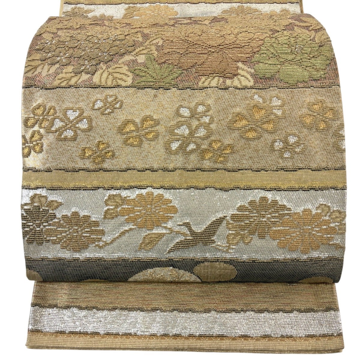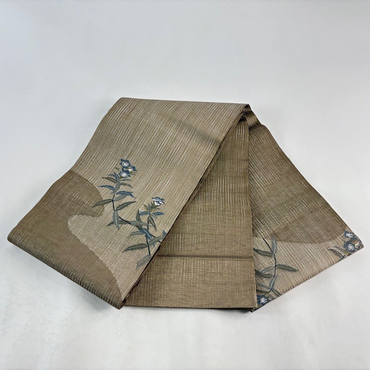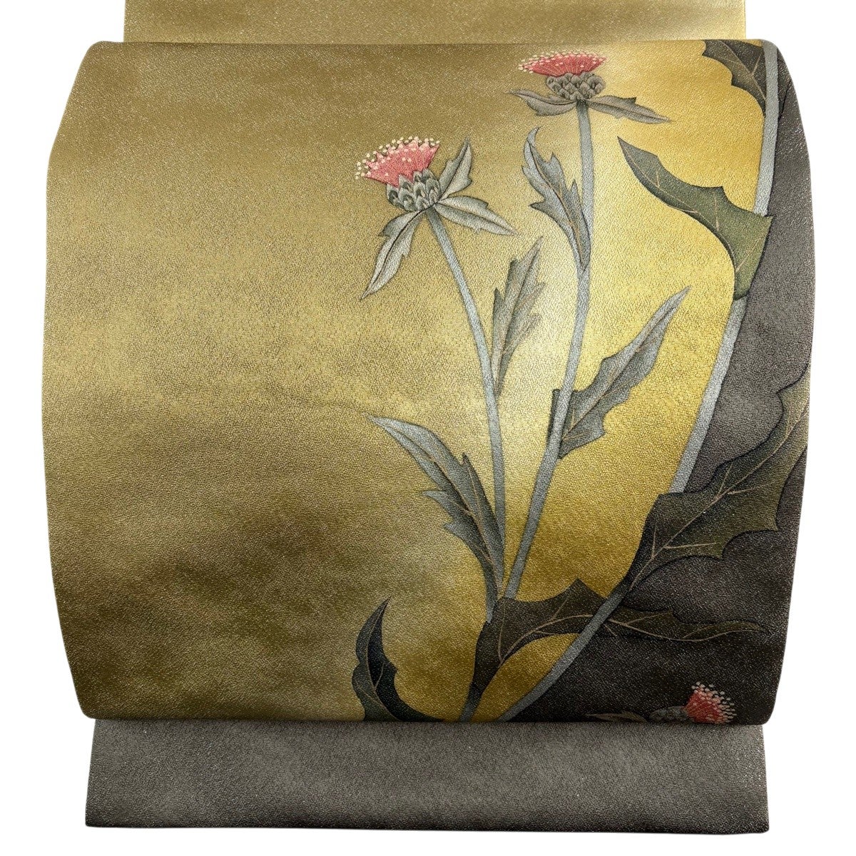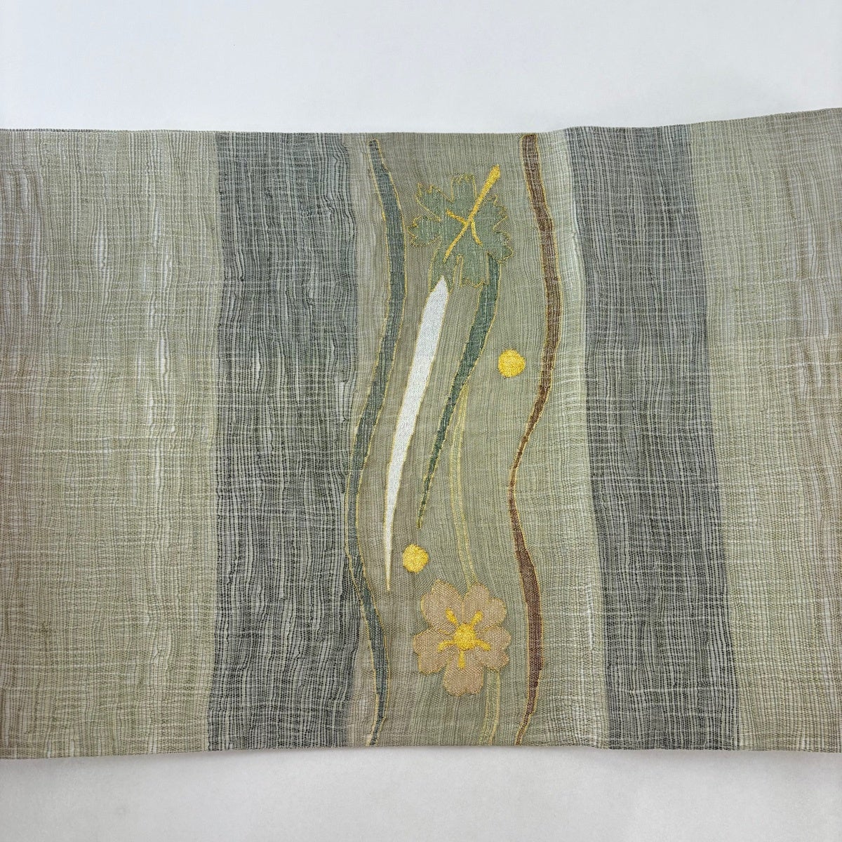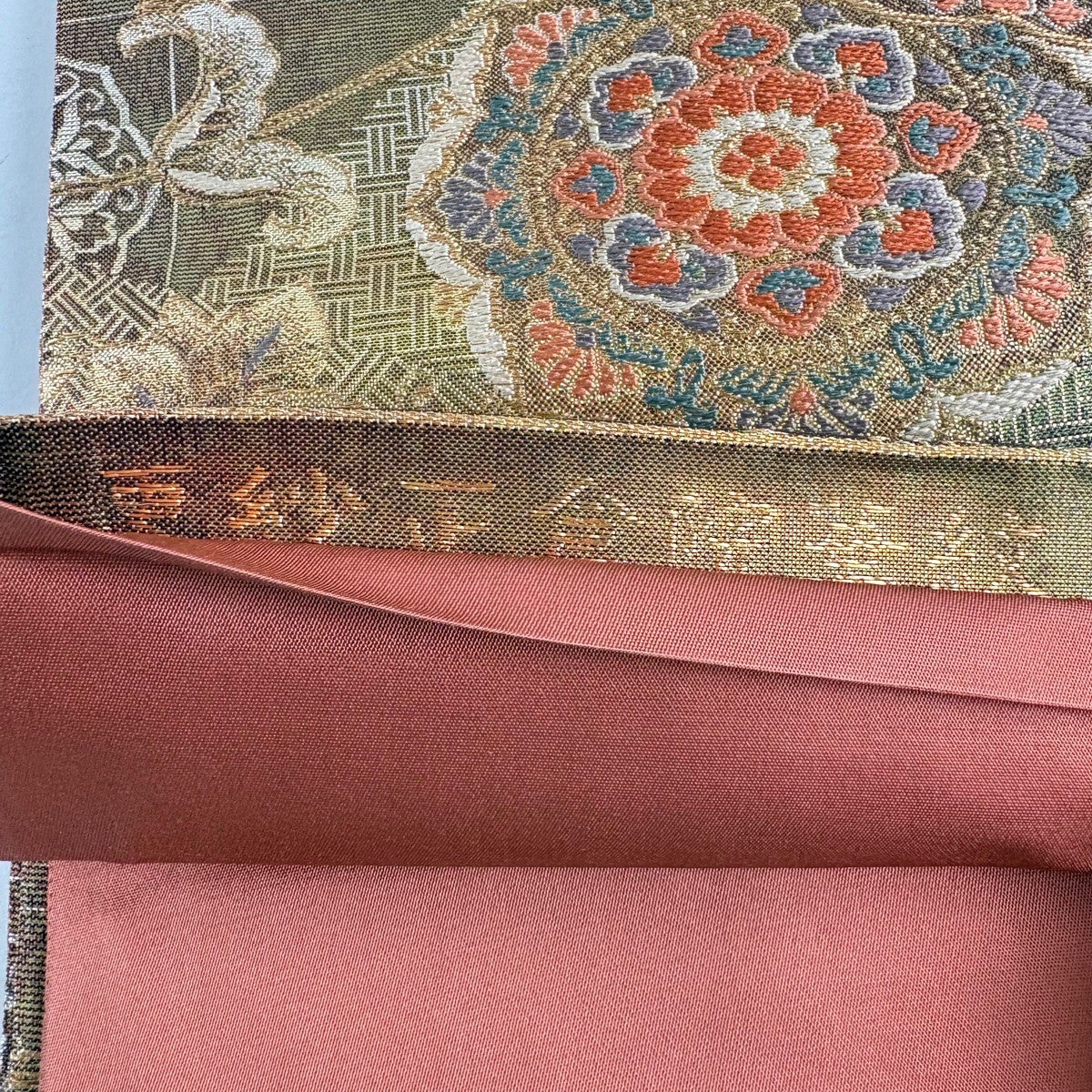 【美品】 袋帯 秀品 夏帯 草花 金糸 茶緑色 お太鼓柄 正絹