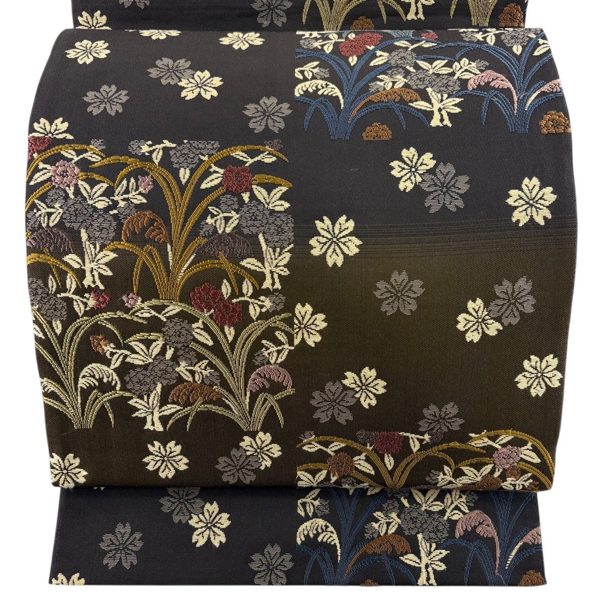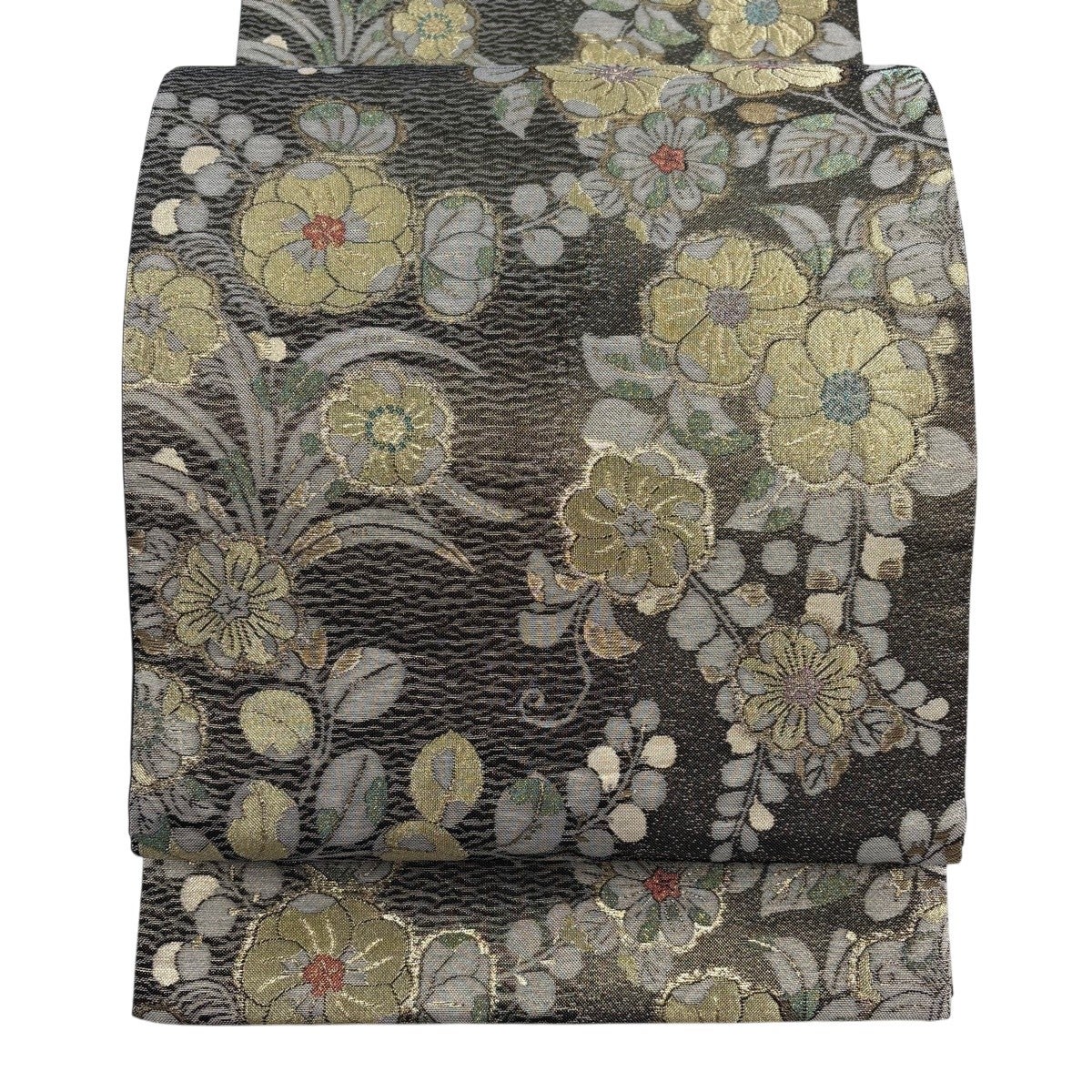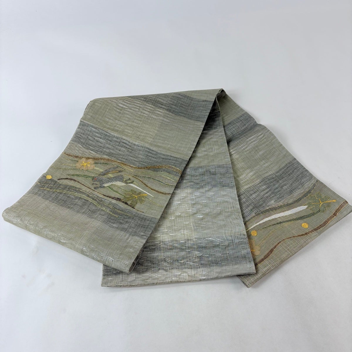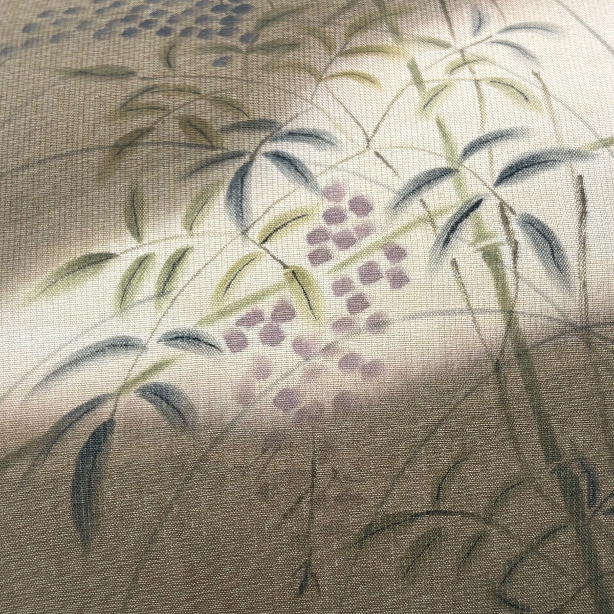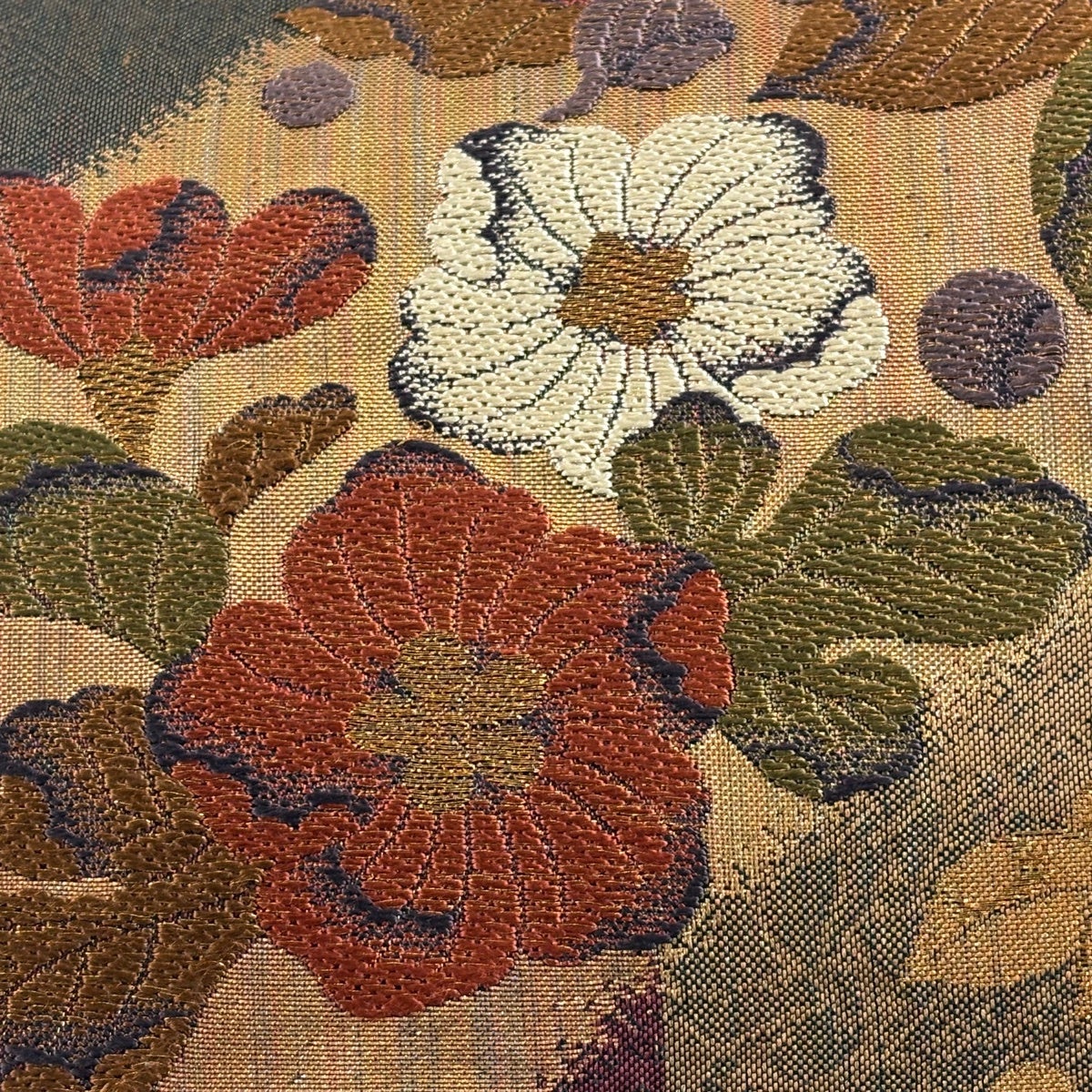 【美品】 袋帯 秀品 夏帯 草花 金糸 茶緑色 お太鼓柄 正絹