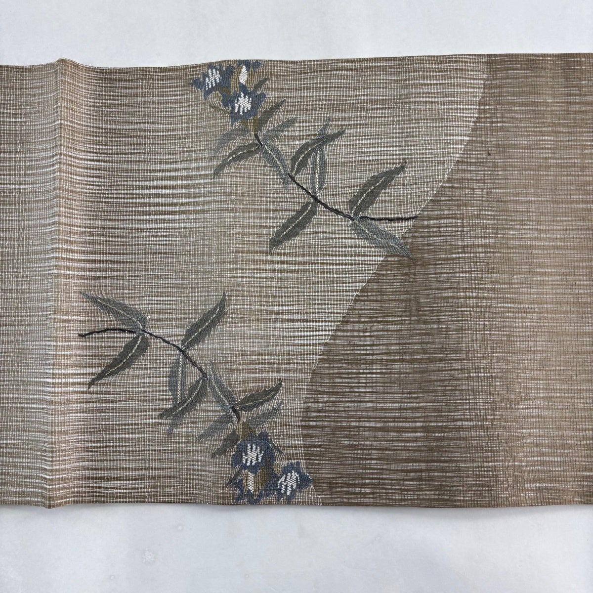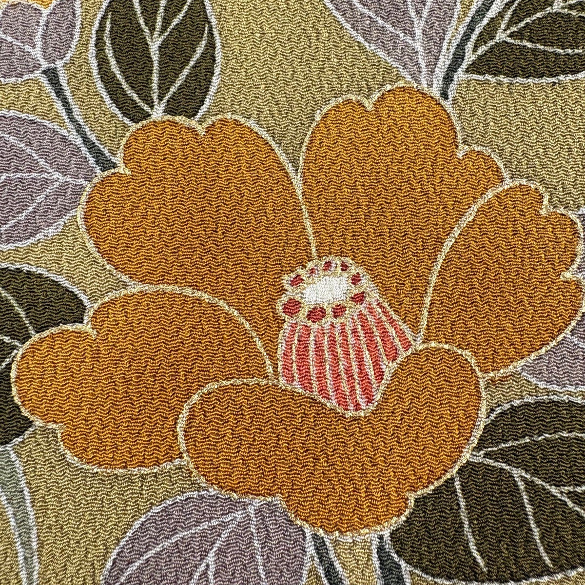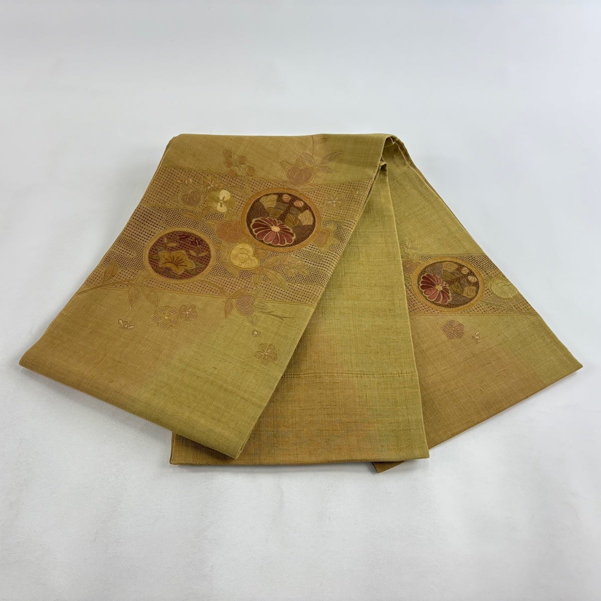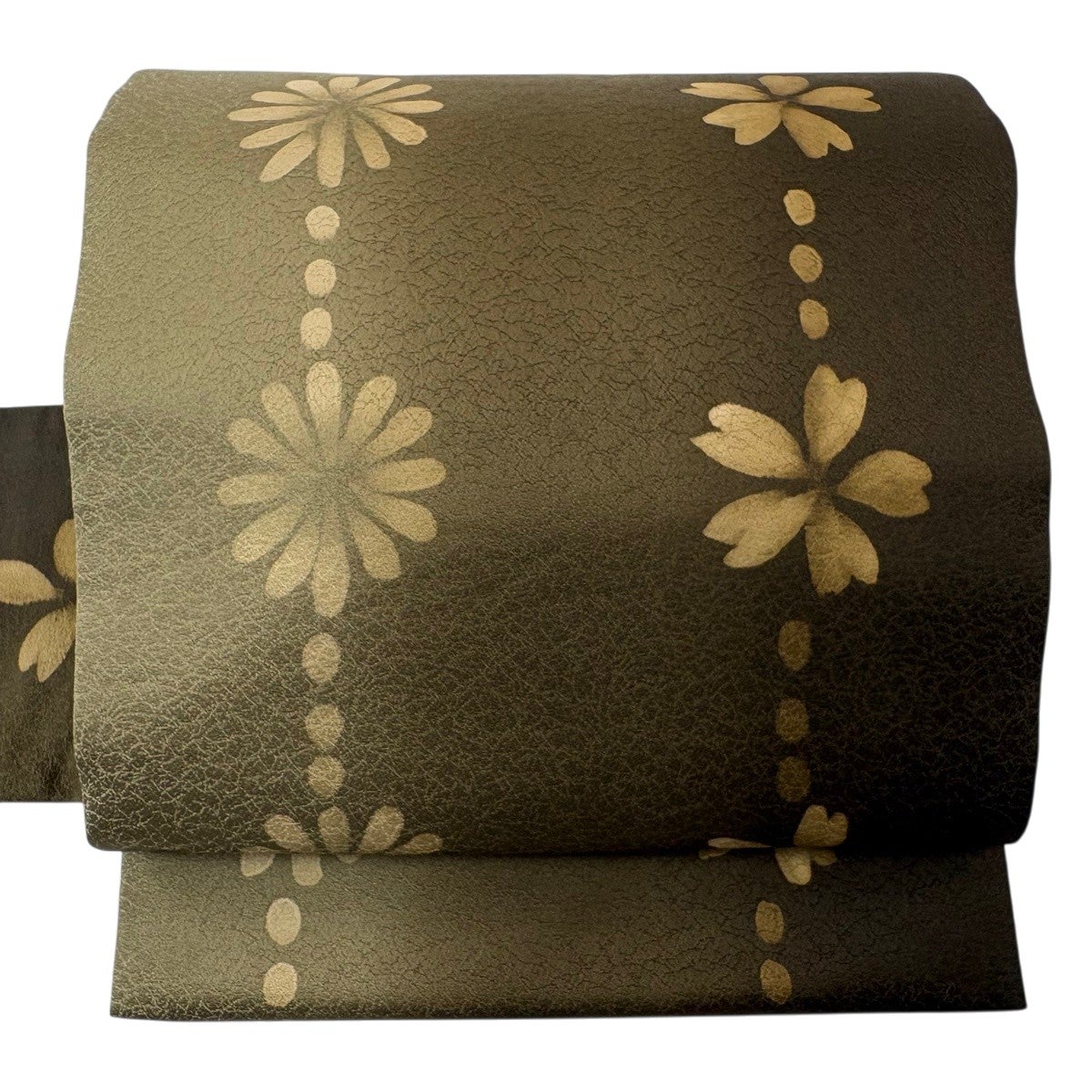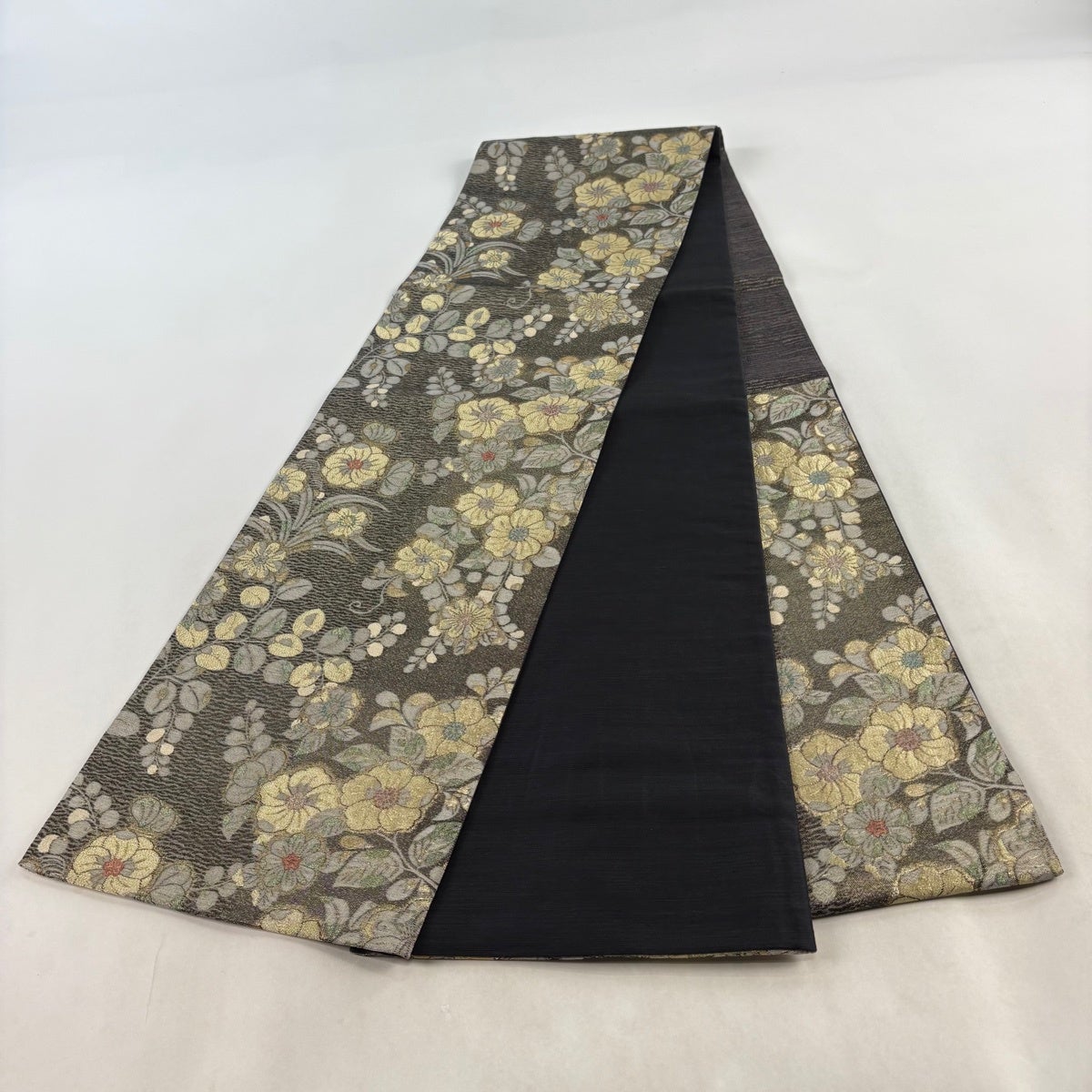 【美品】 袋帯 秀品 夏帯 草花 金糸 茶緑色 お太鼓柄 正絹
