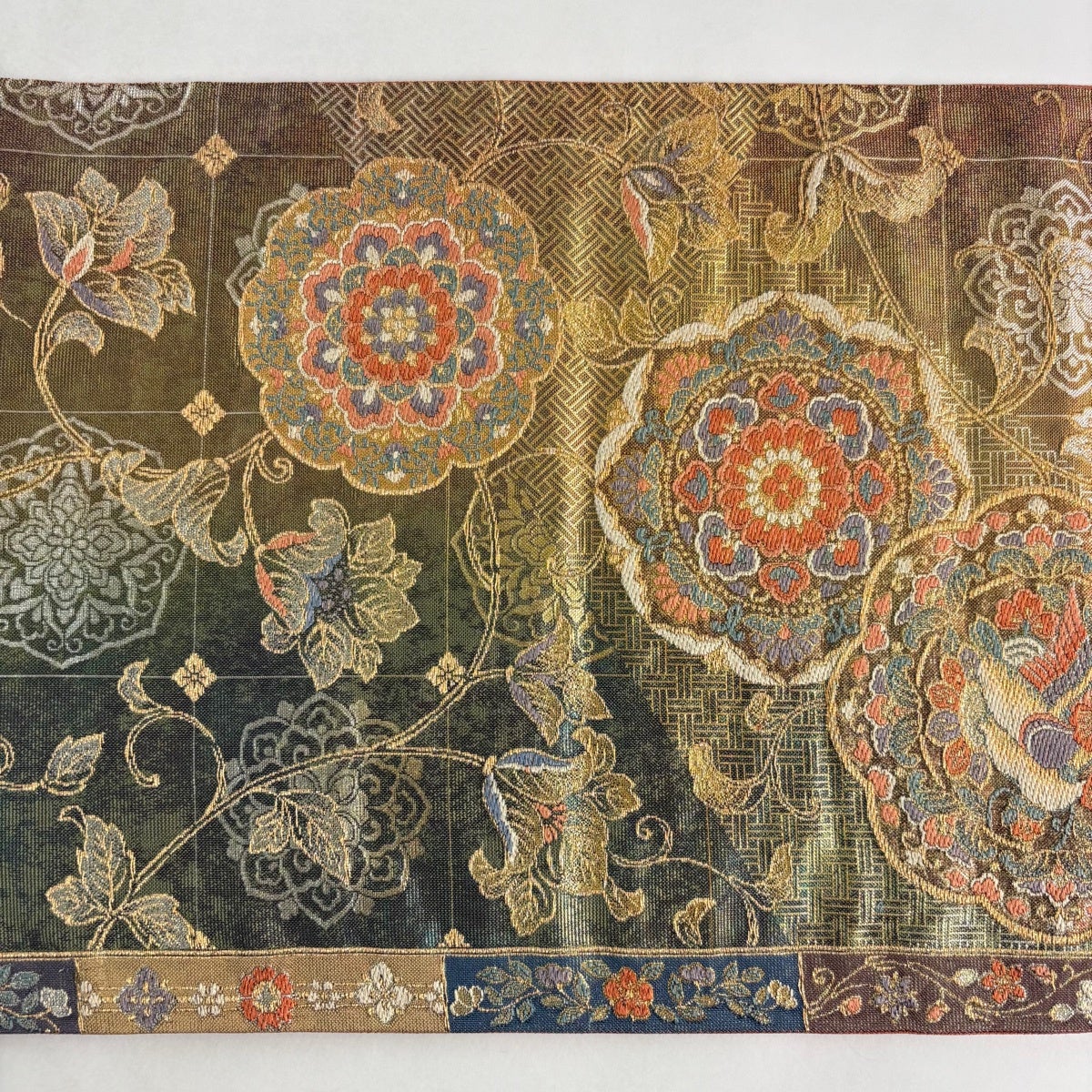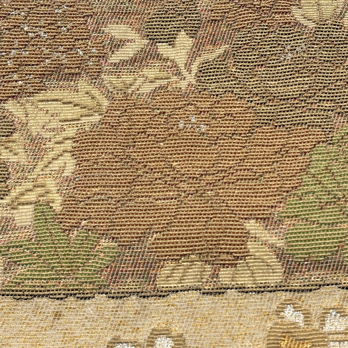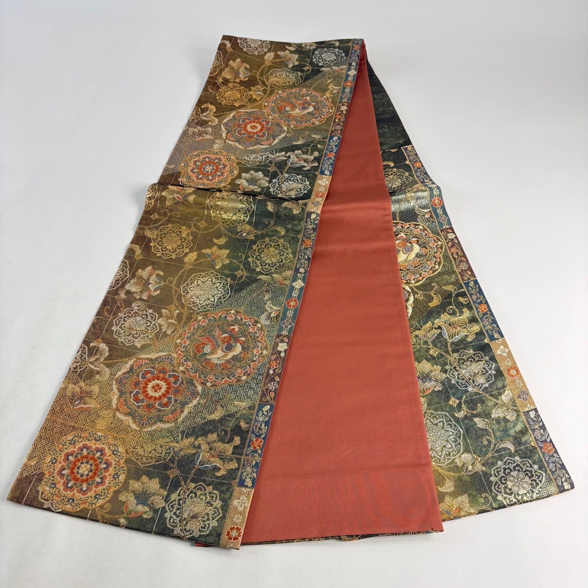 袋帯 秀品 更紗正倉院華文 鳥 金糸 箔 茶緑色 六通 正絹