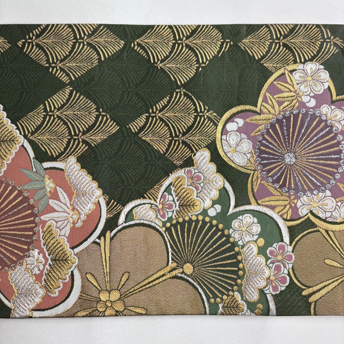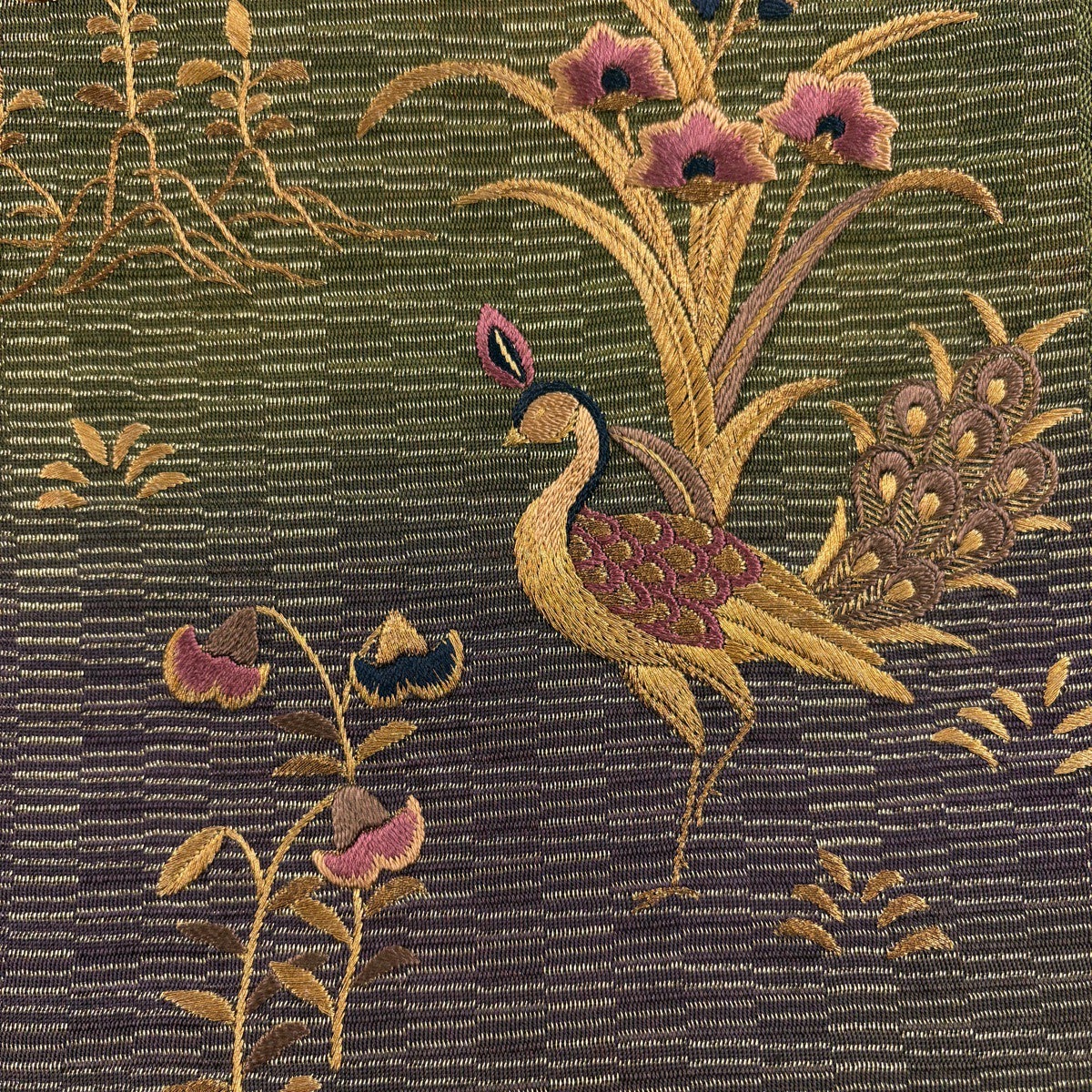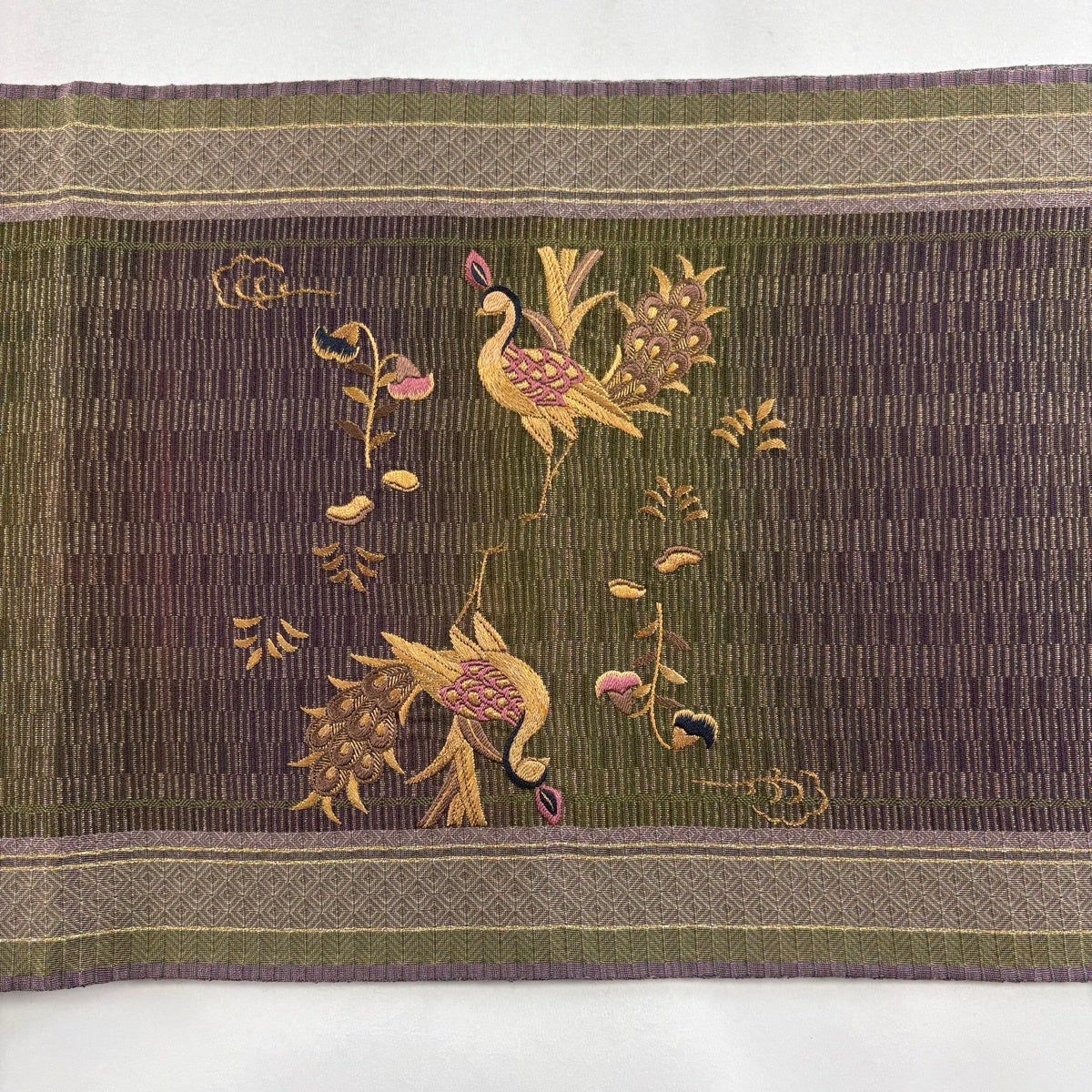 袋帯 秀品 更紗正倉院華文 鳥 金糸 箔 茶緑色 六通 正絹