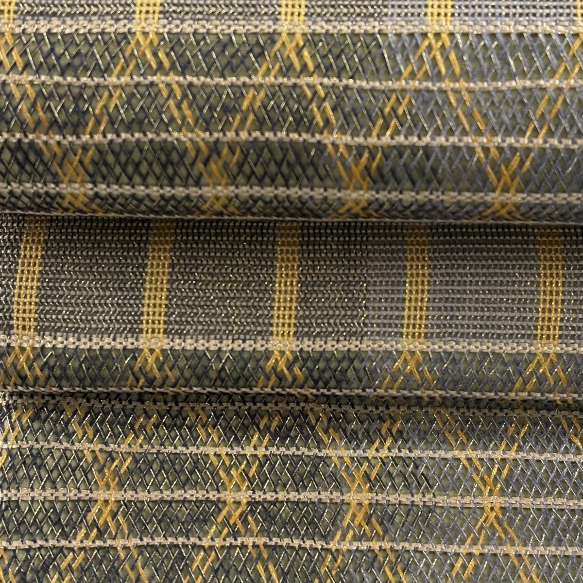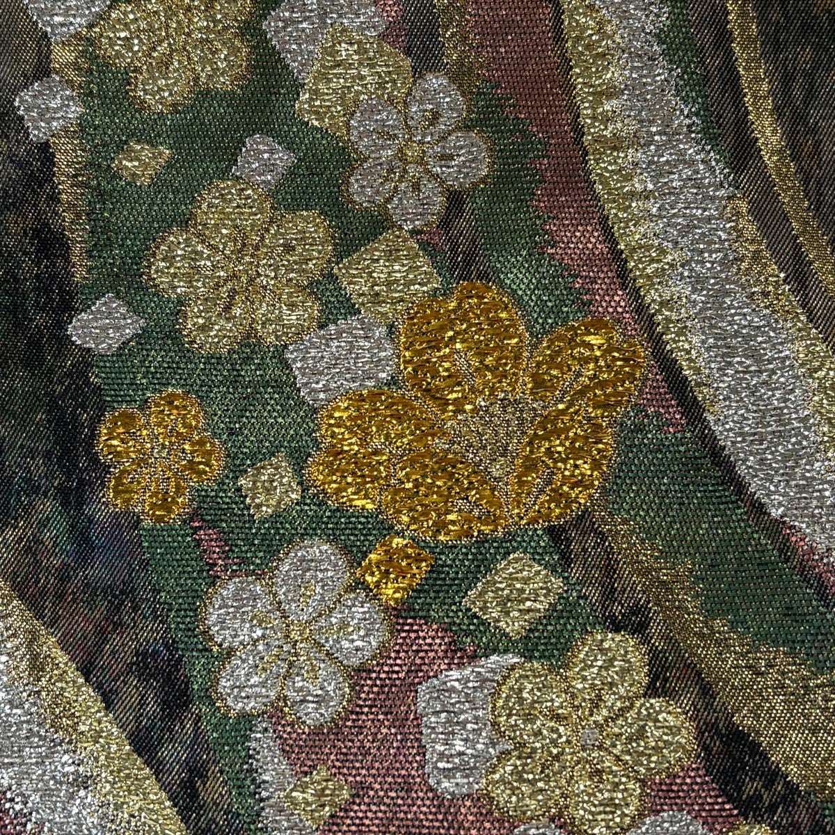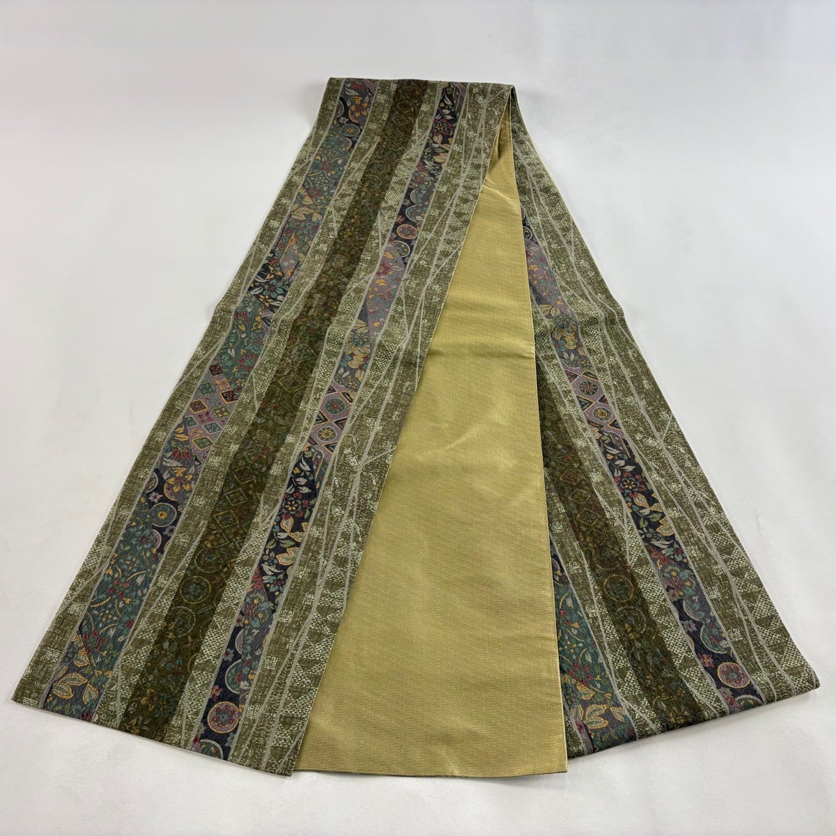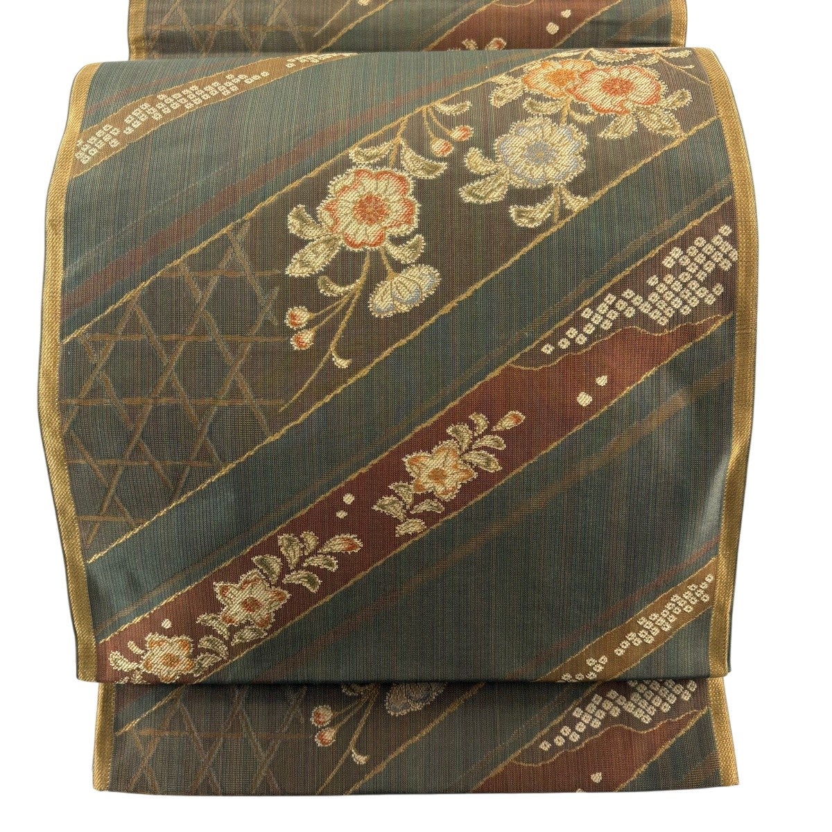 【美品】 袋帯 名品 芝 段縞 金糸 箔 茶緑色 全通 正絹
