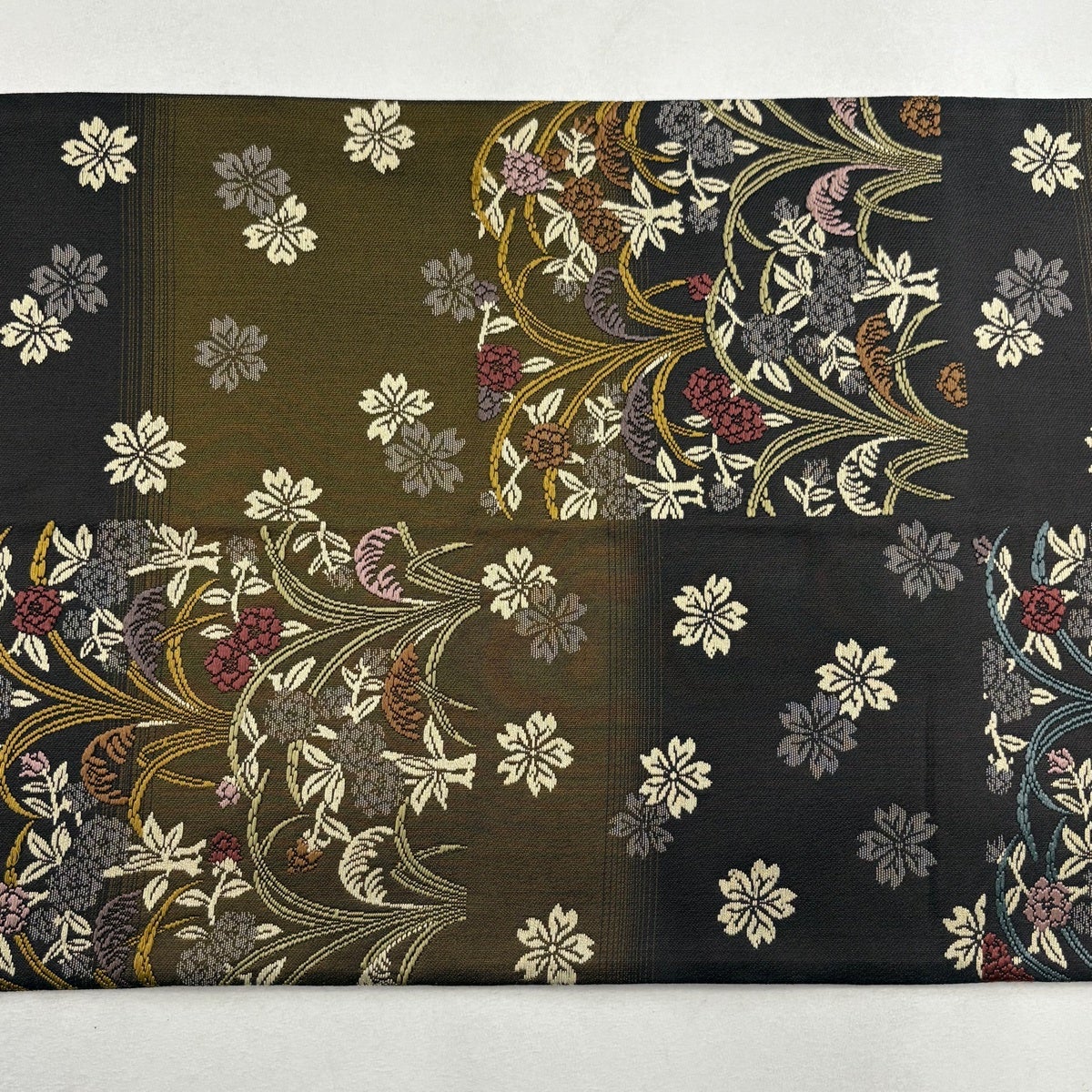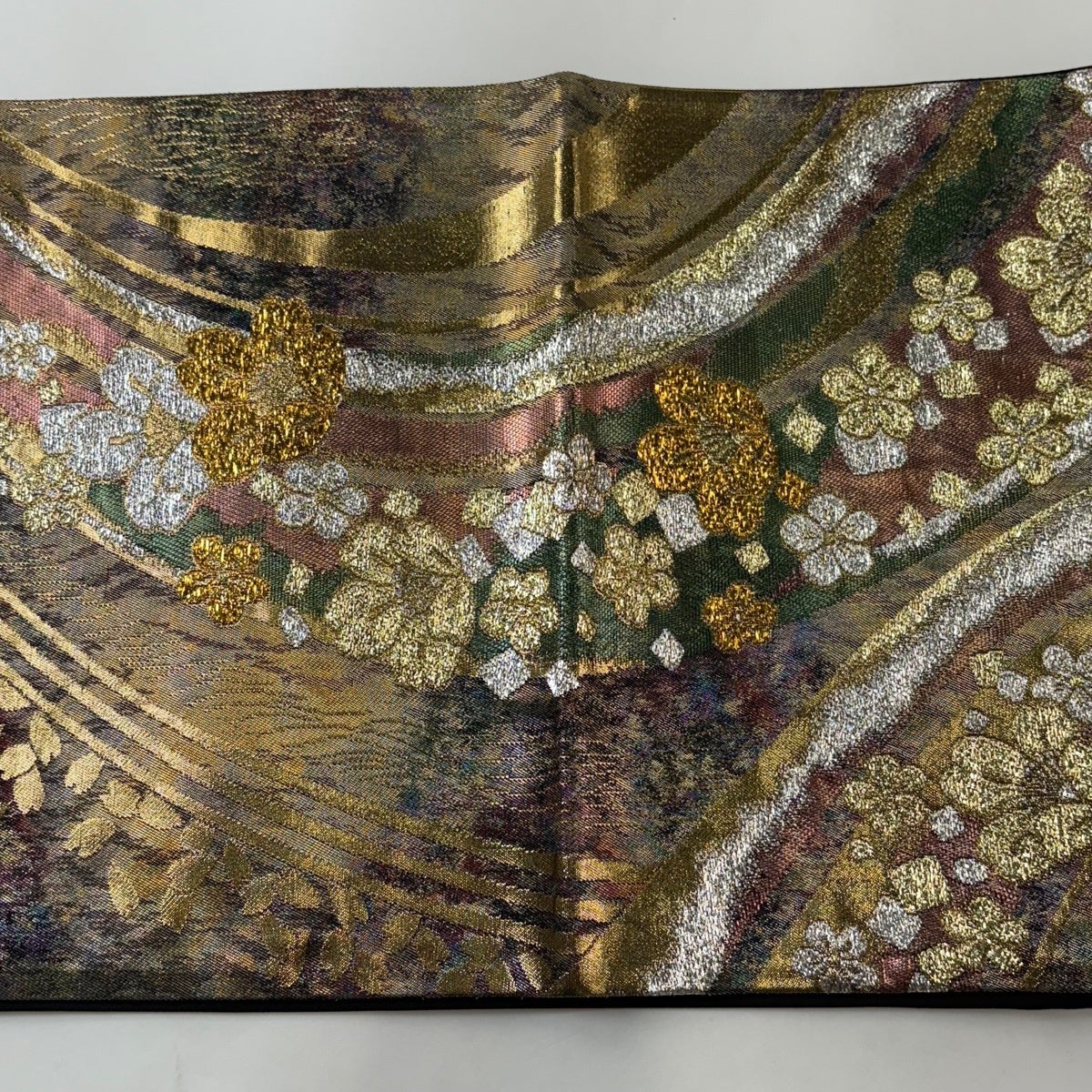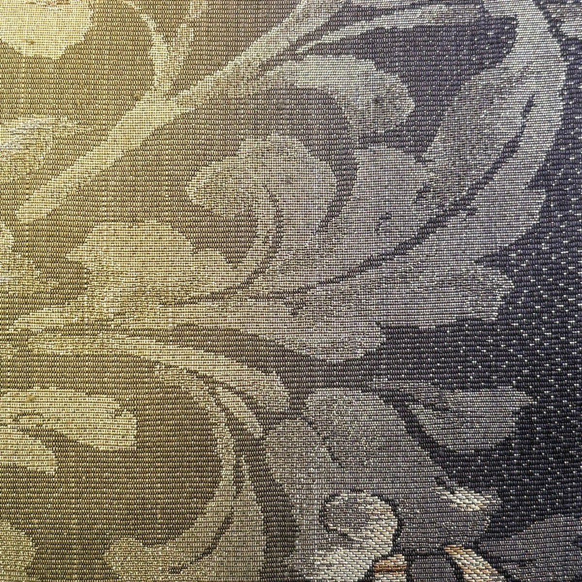 【美品】 袋帯 秀品 草花 金通し ぼかし 茶緑色 六通 正絹