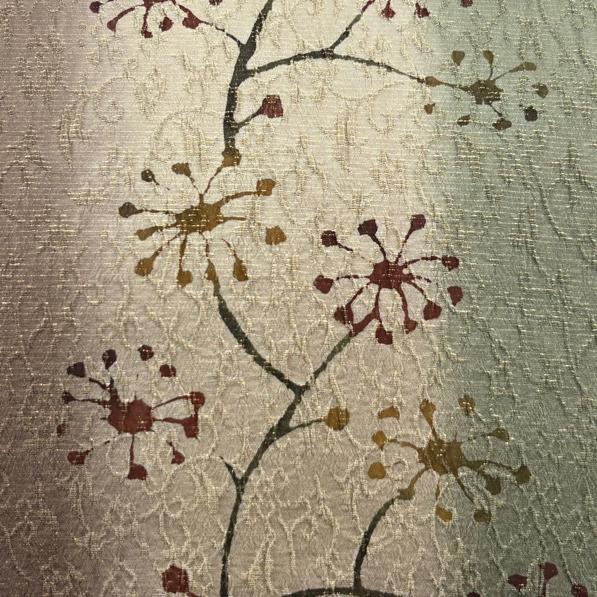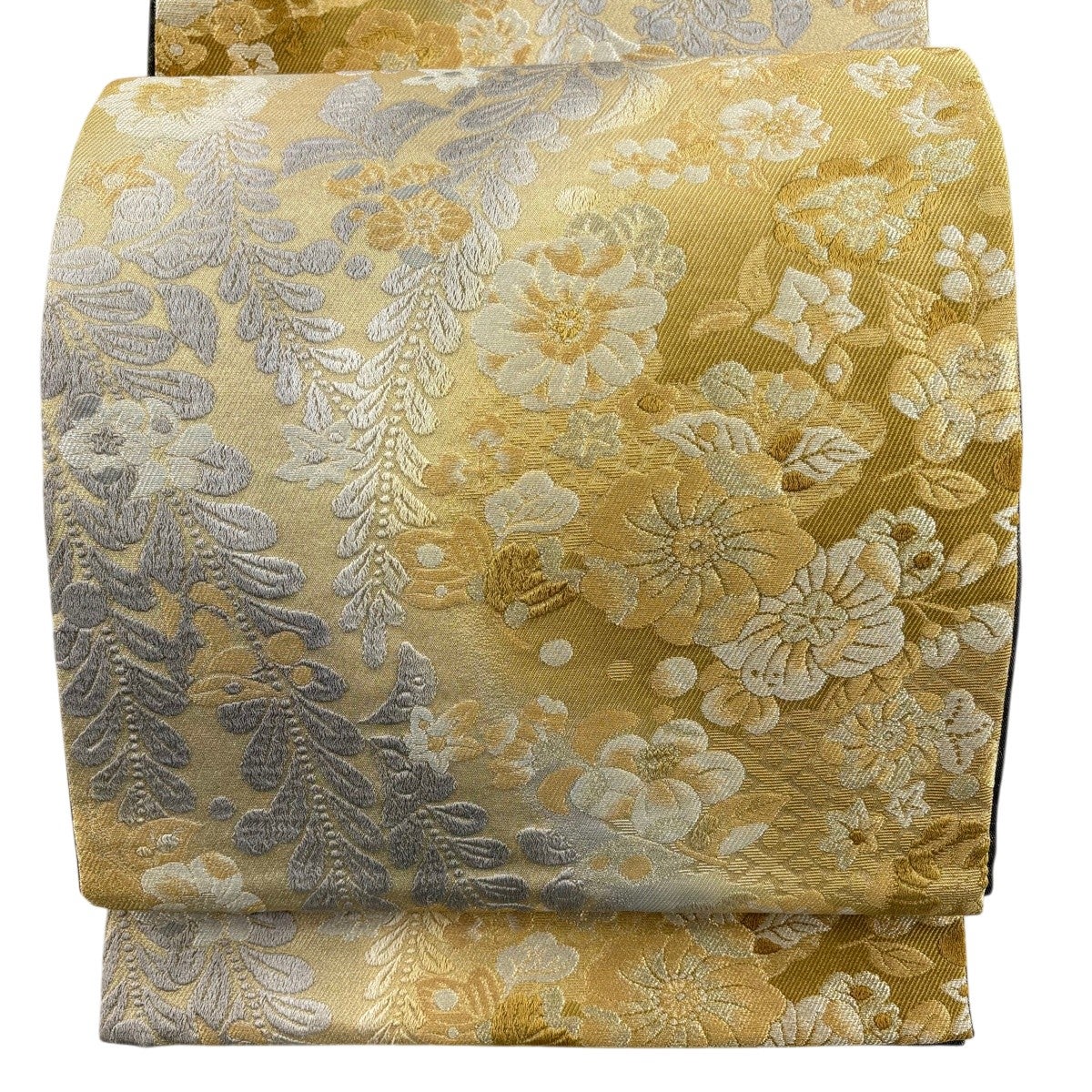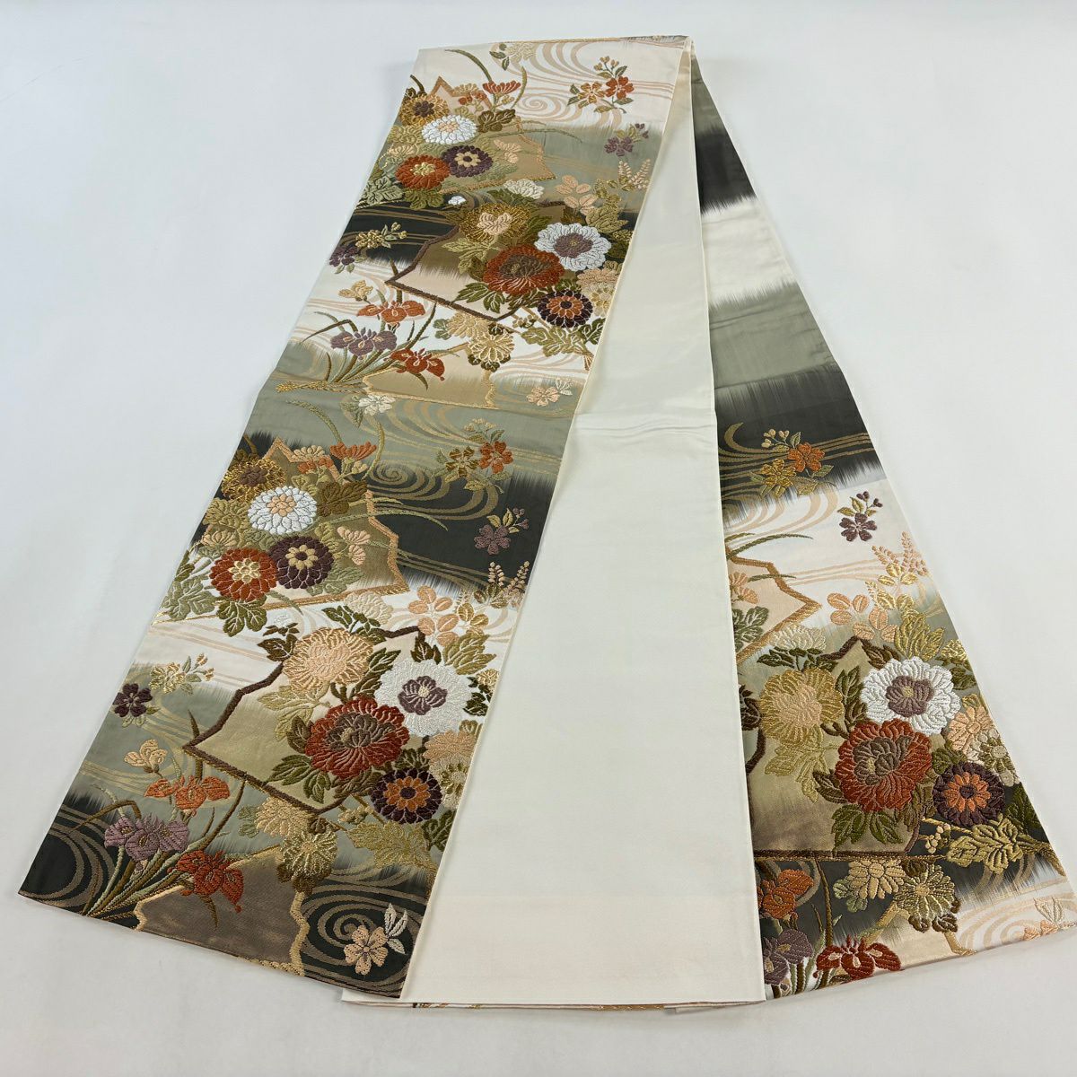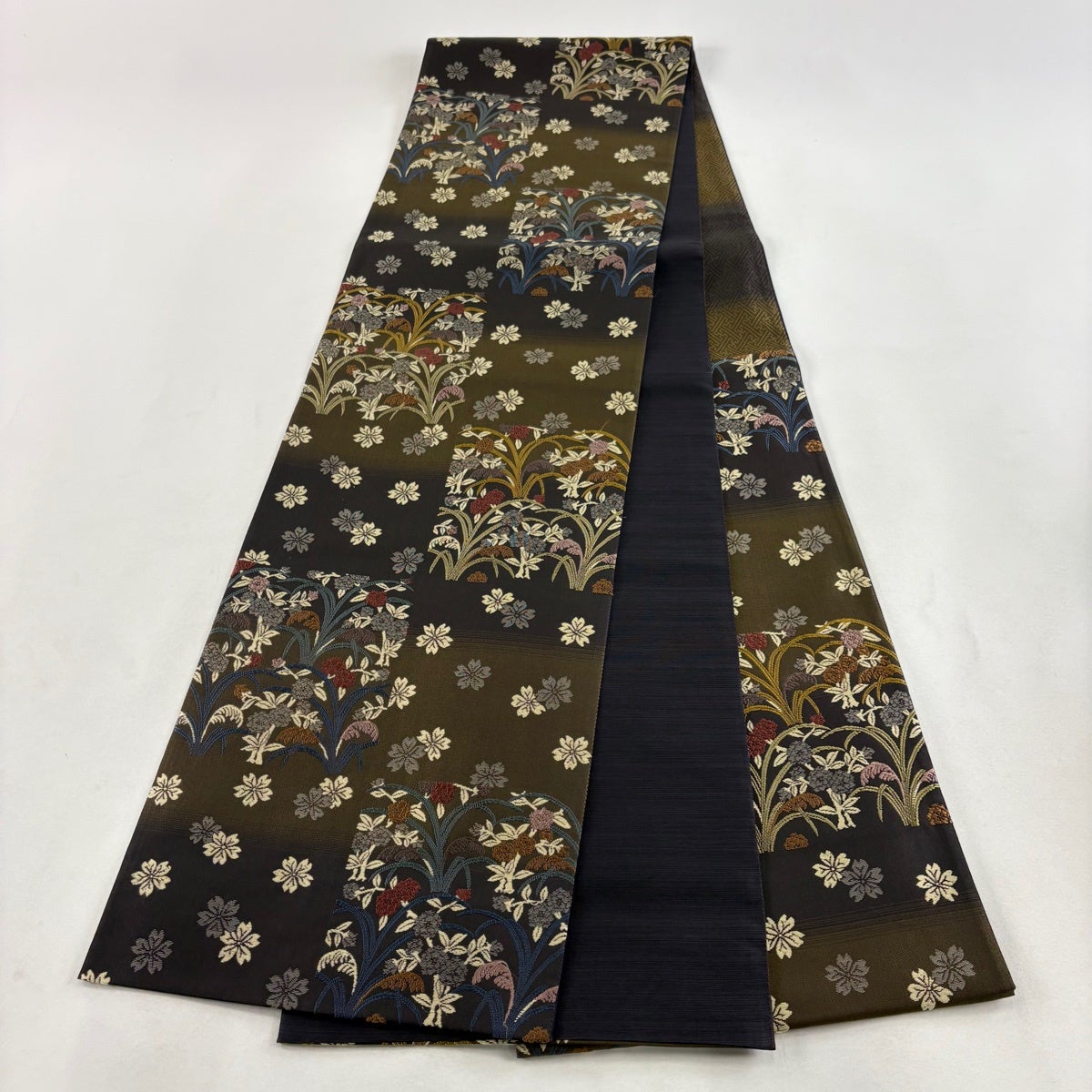 【美品】 袋帯 秀品 草花 金通し ぼかし 茶緑色 六通 正絹