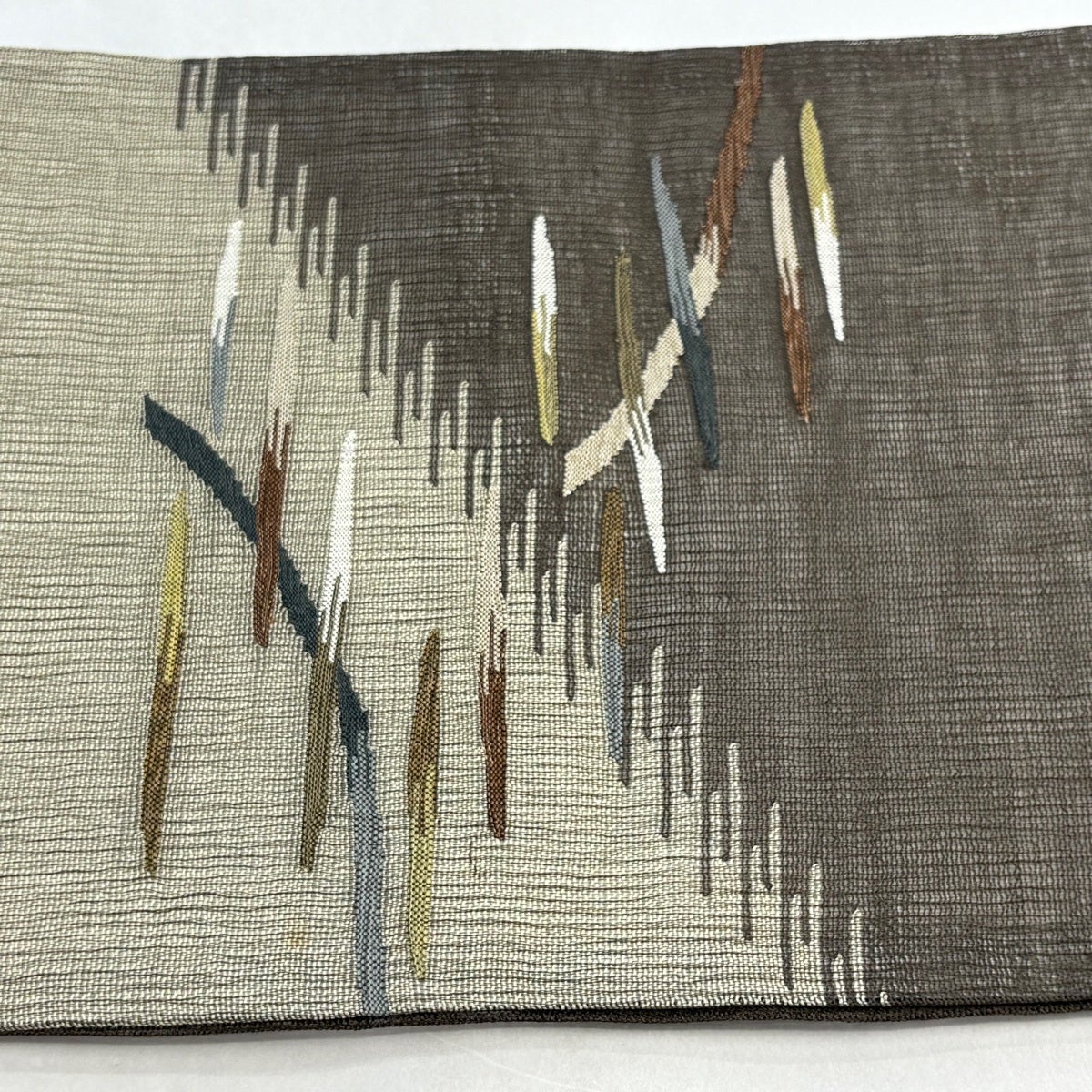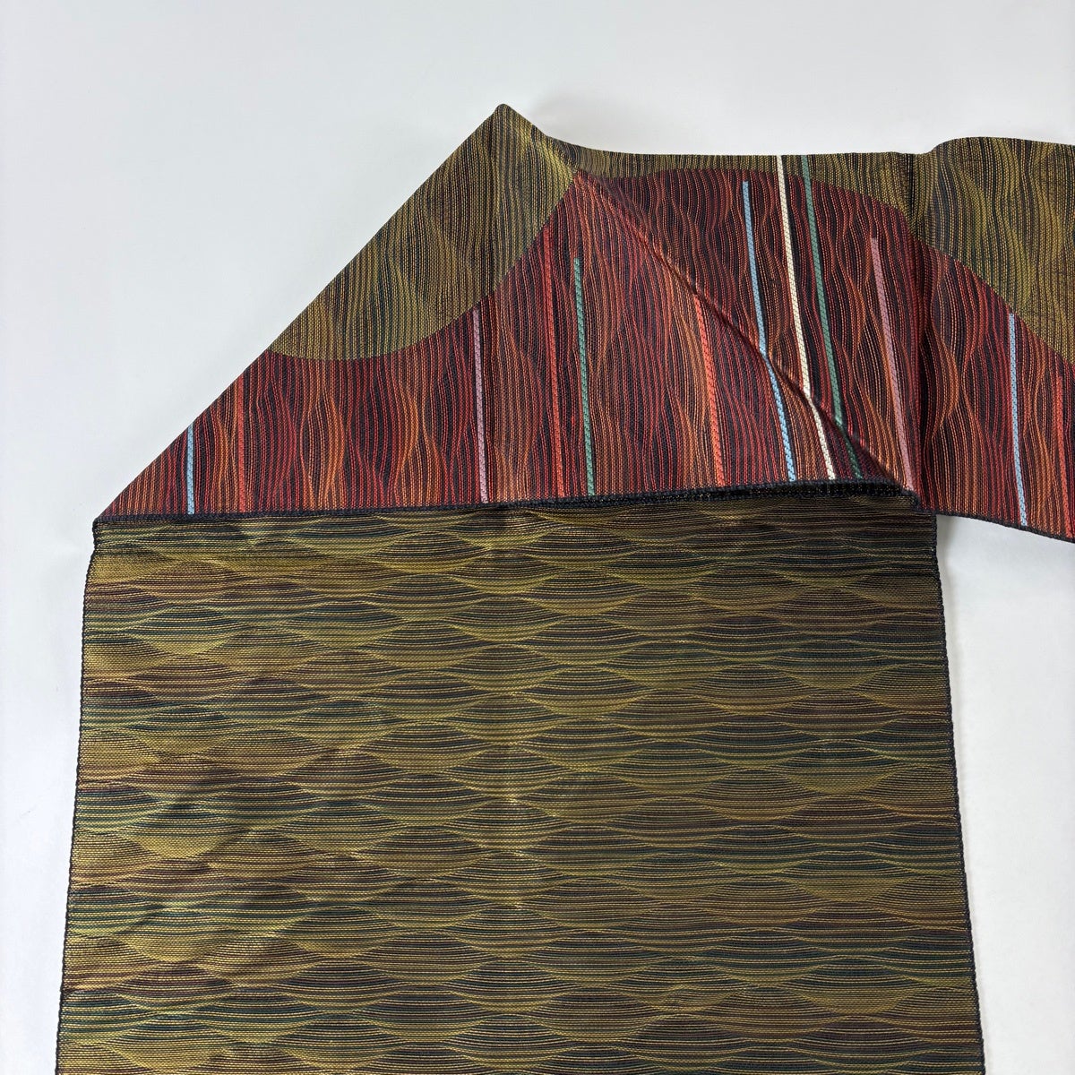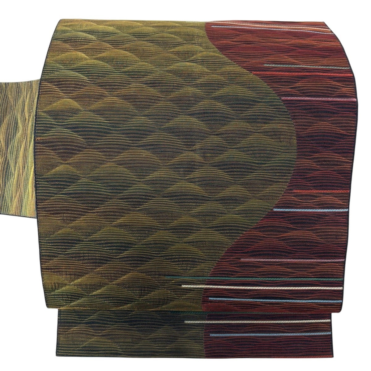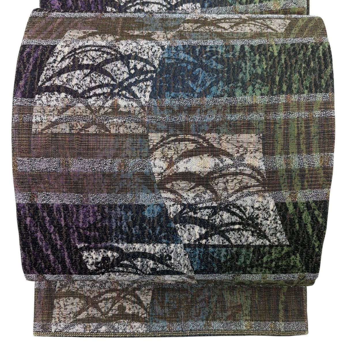 【美品】 袋帯 秀品 幾何学 縞 ぼかし 茶緑色 お太鼓柄 正絹