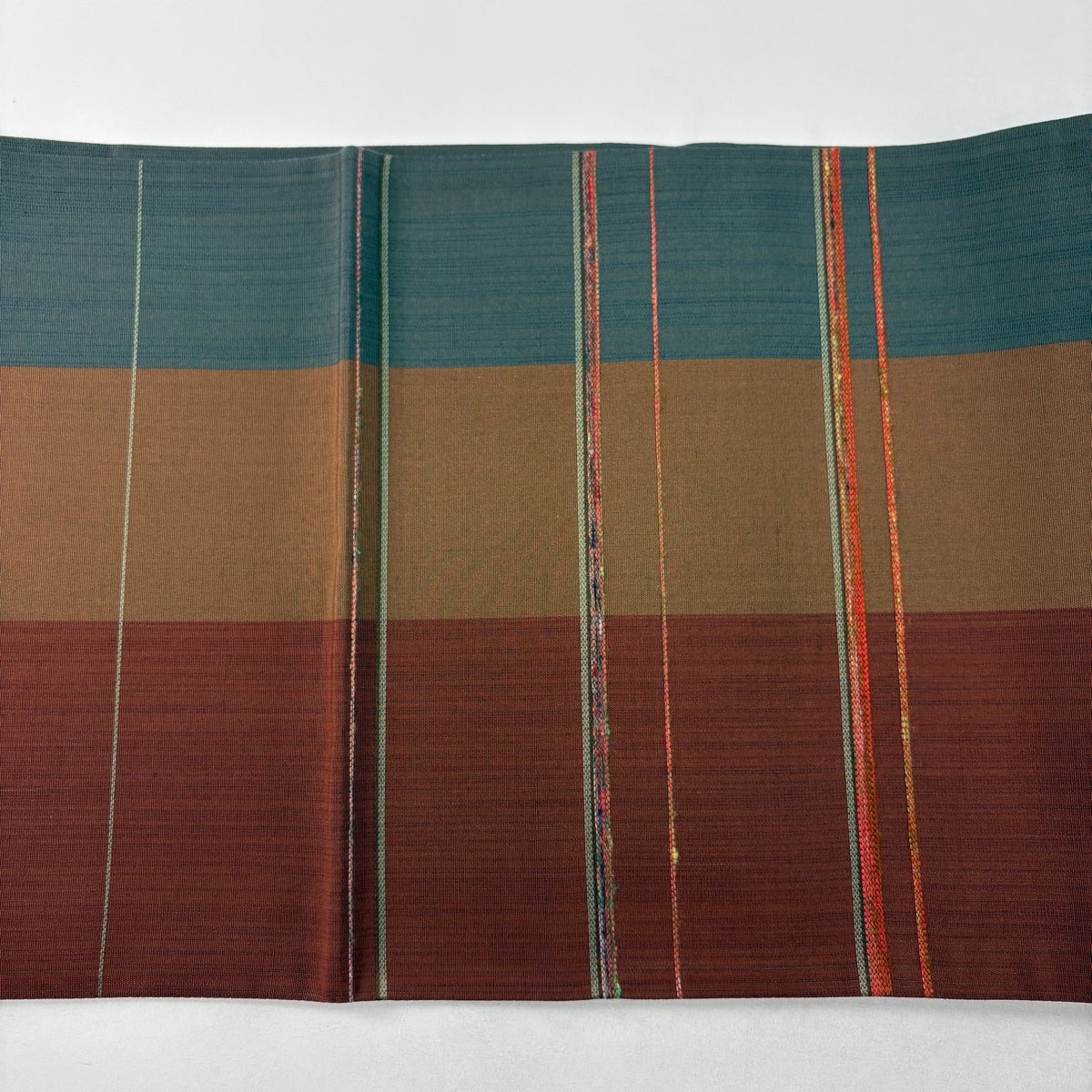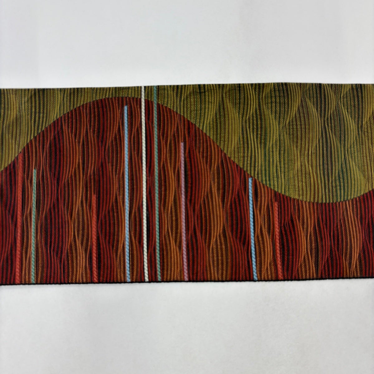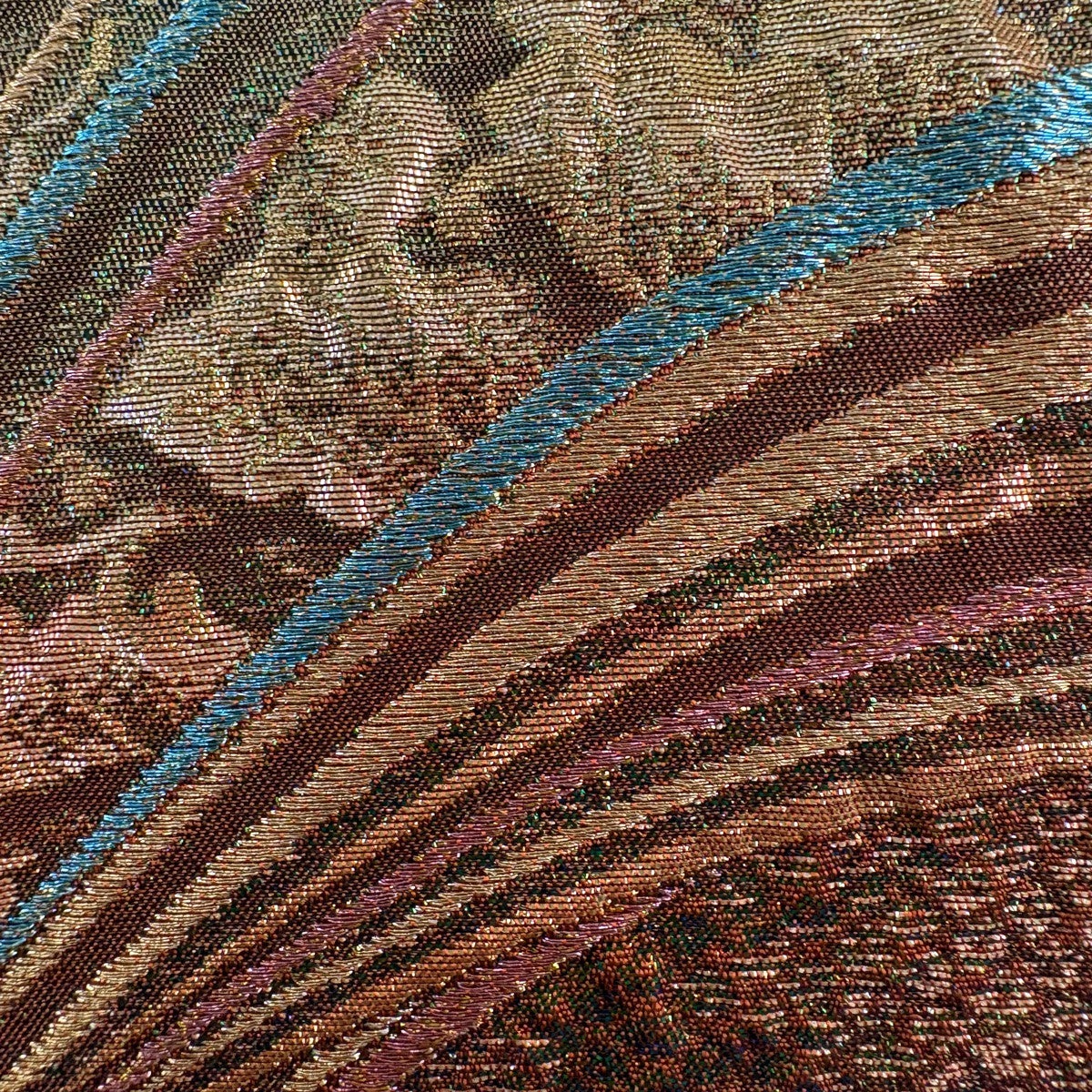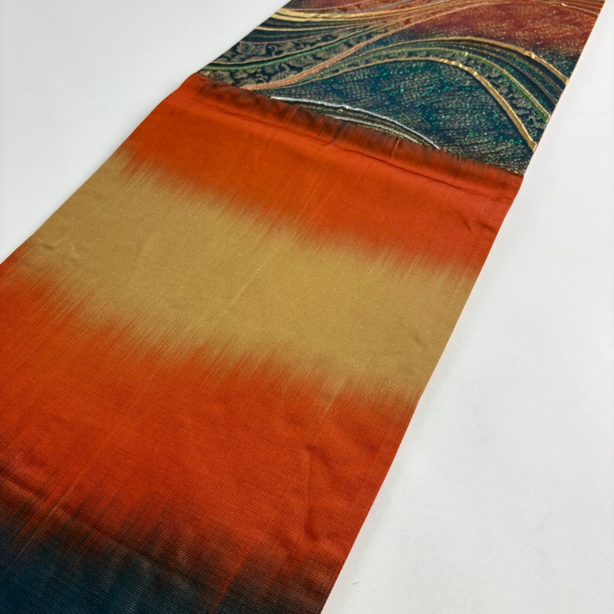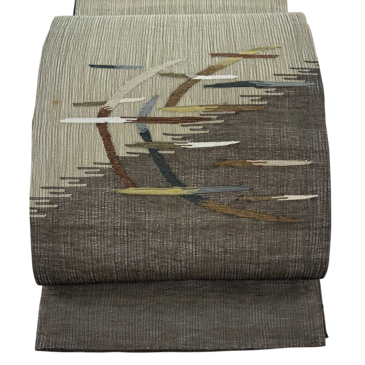 【美品】 袋帯 秀品 幾何学 縞 ぼかし 茶緑色 お太鼓柄 正絹