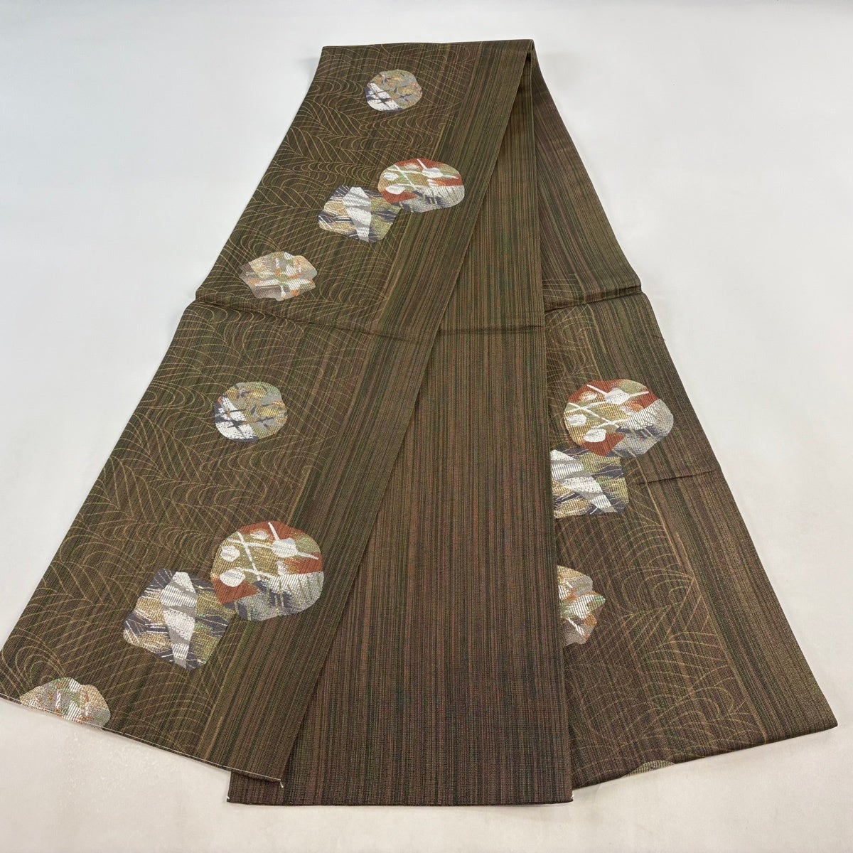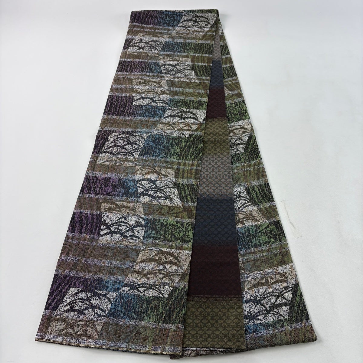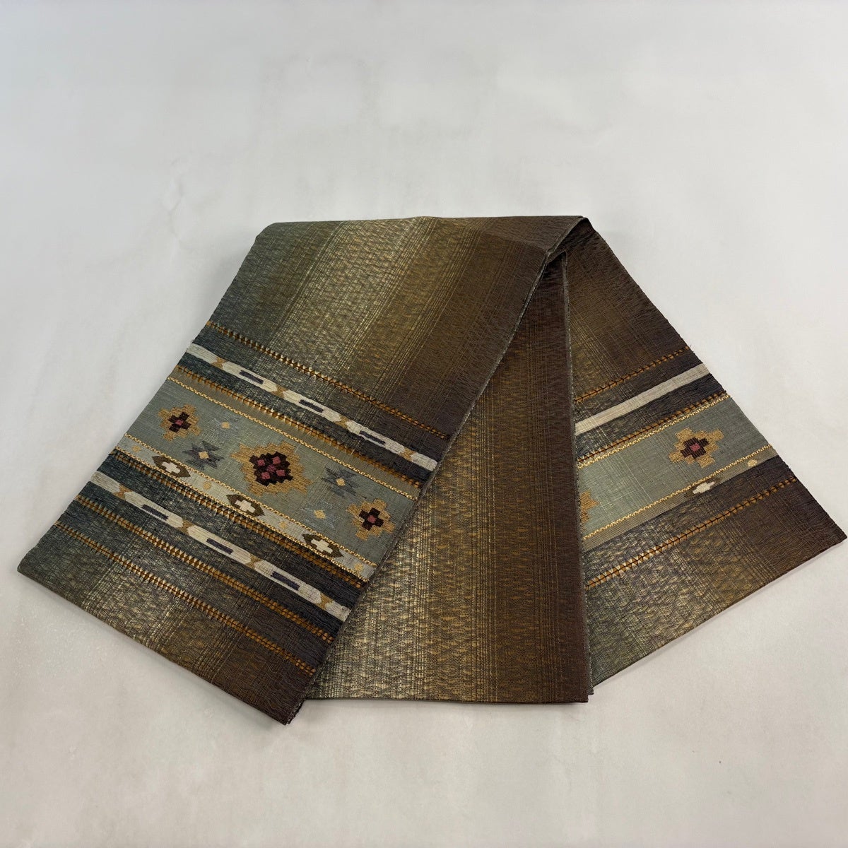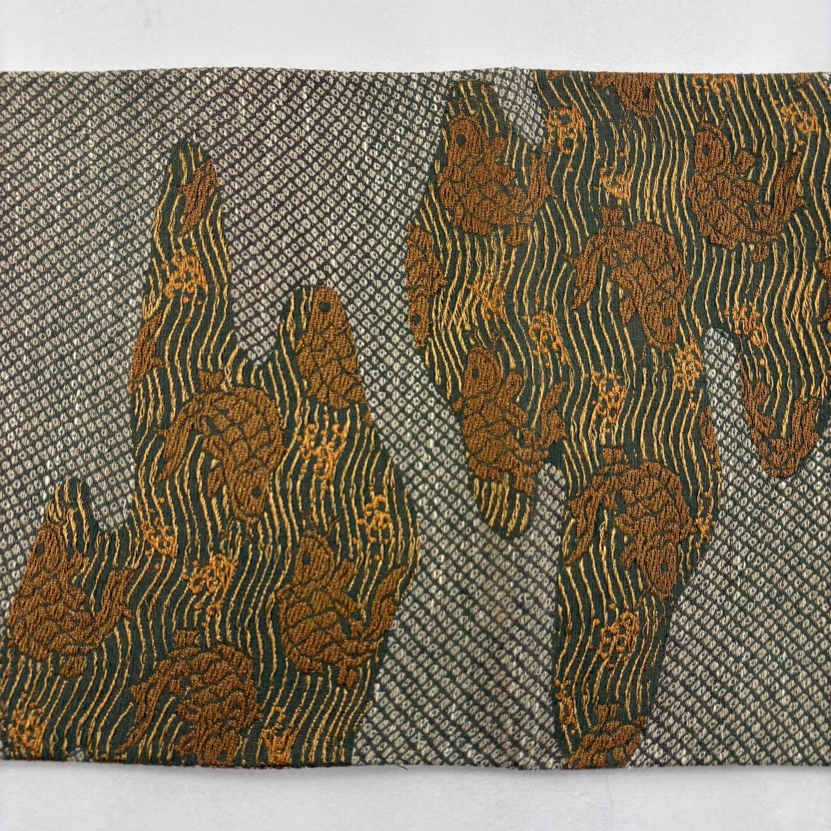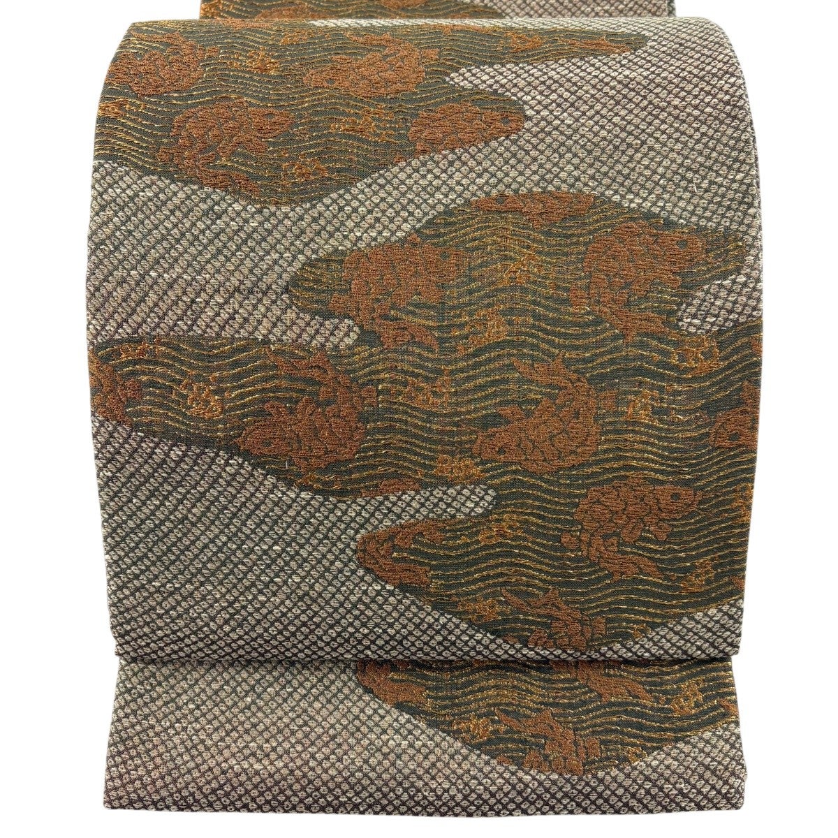 50%OFF 袋帯 名品 櫛織 幾何学 茶緑色 全通 正絹 K50
