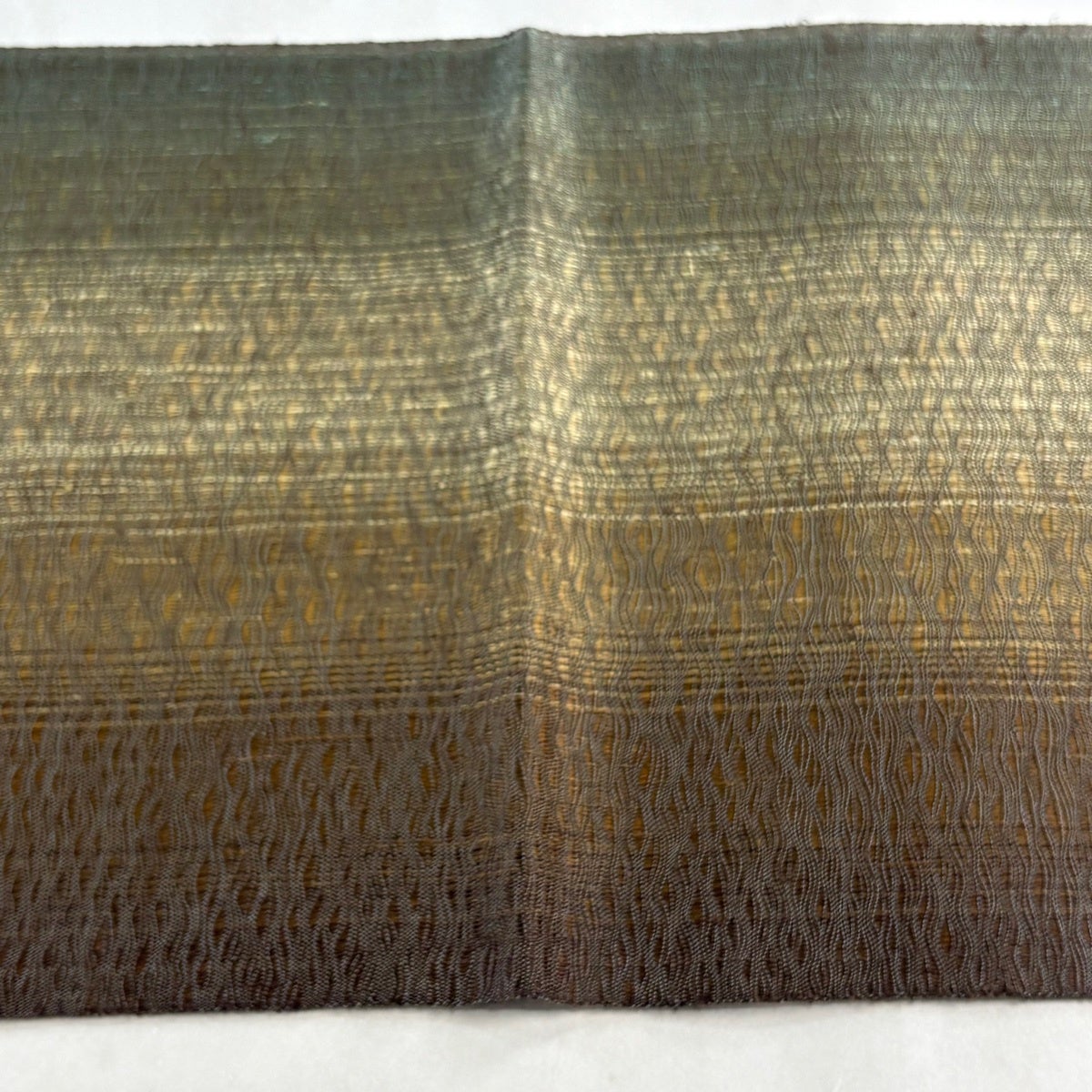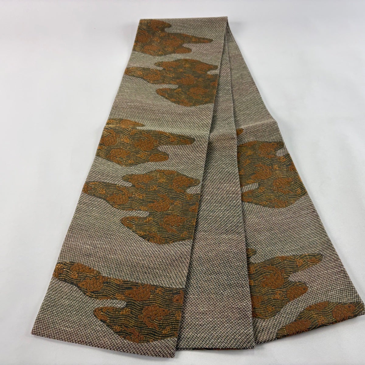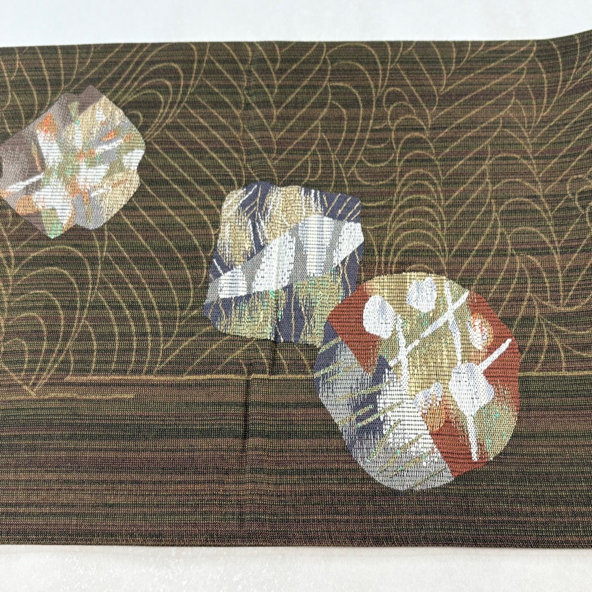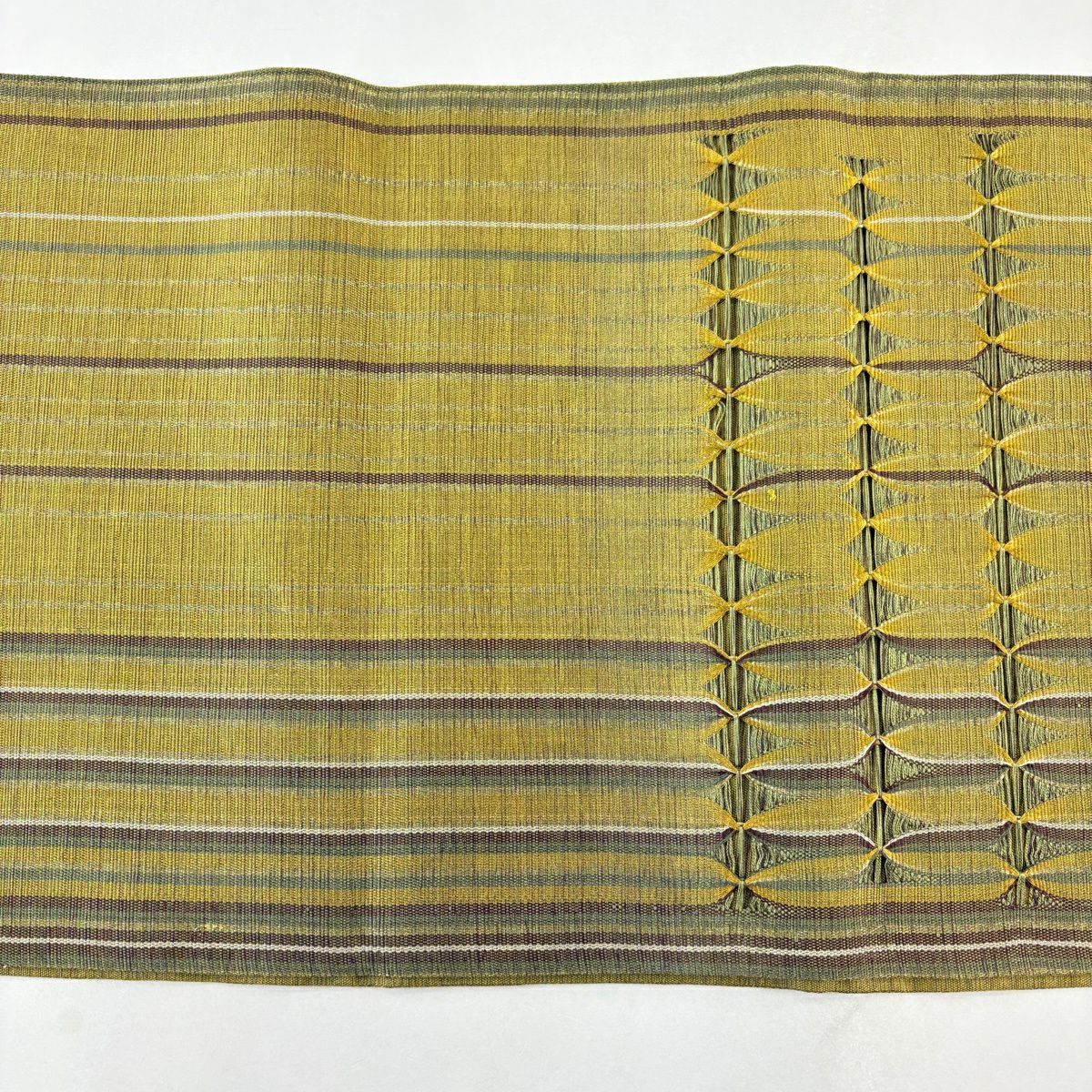 50%OFF 袋帯 名品 櫛織 幾何学 茶緑色 全通 正絹 K50