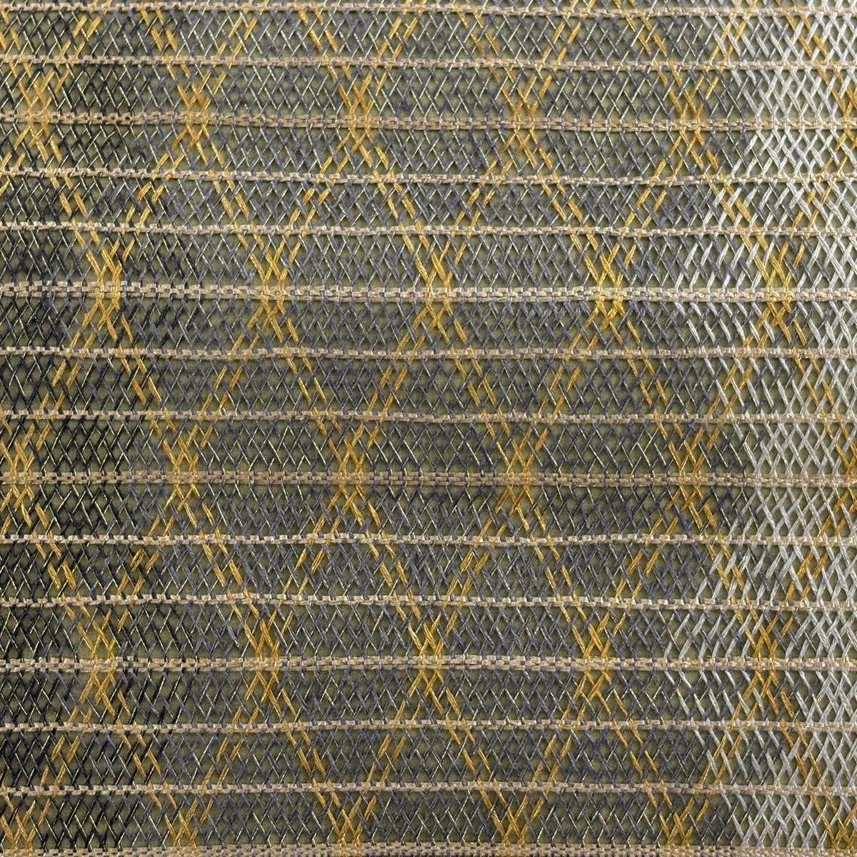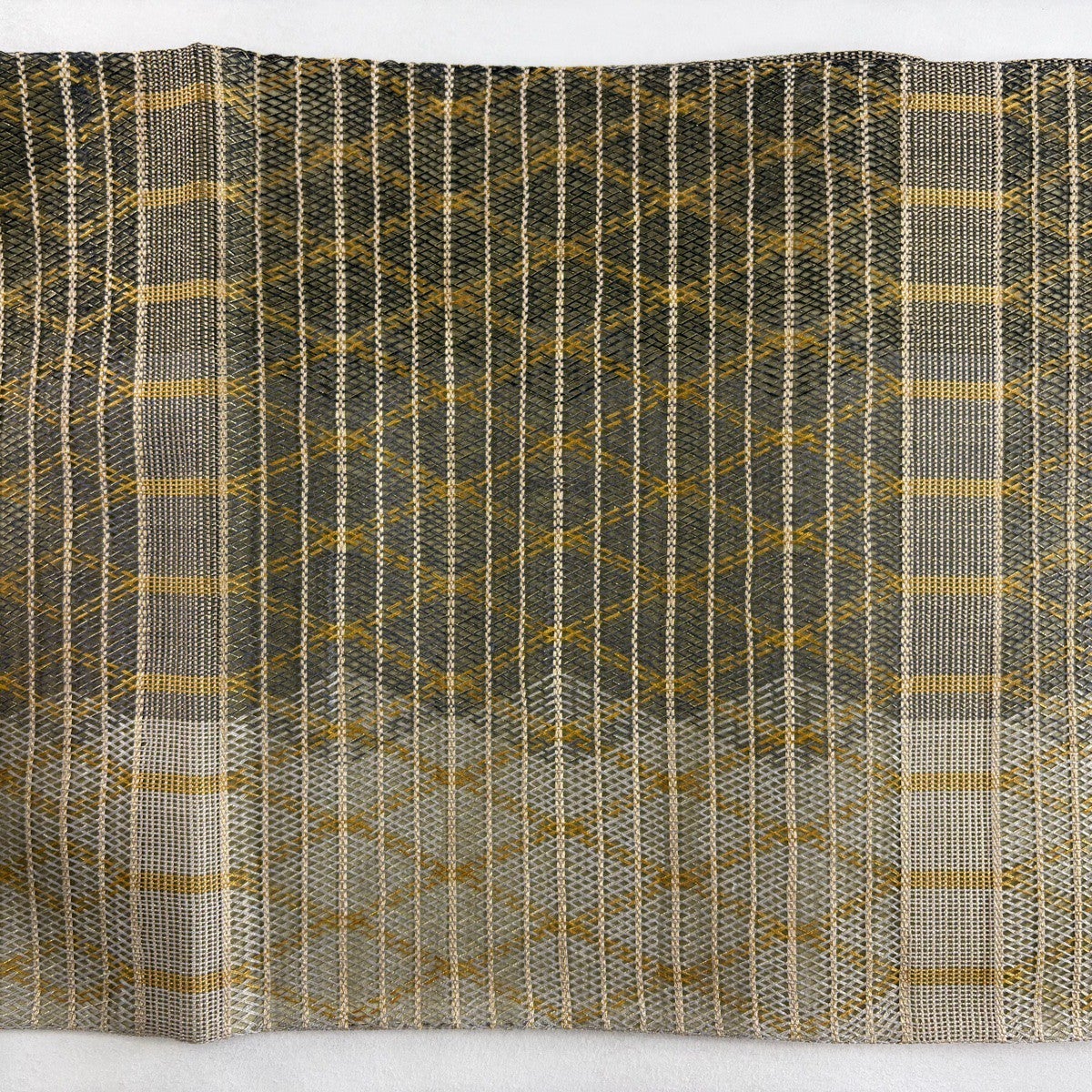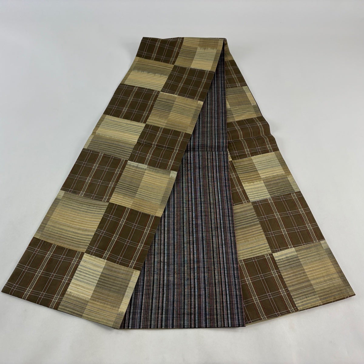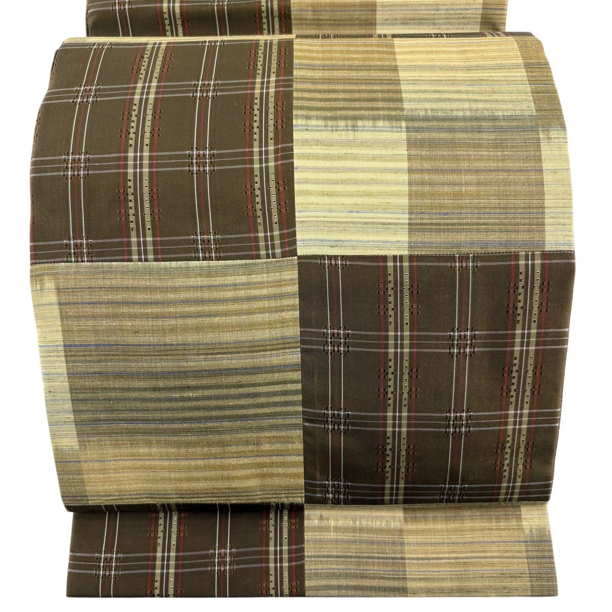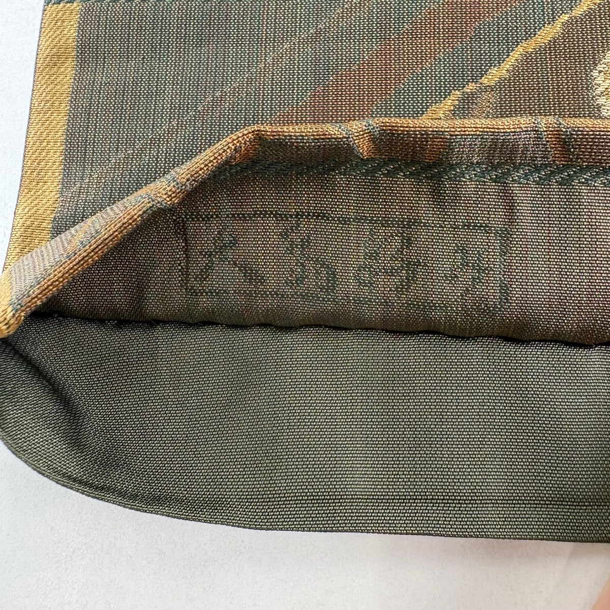 【美品】 袋帯 秀品 格子 幾何学模様 金糸 茶緑色 全通 正絹