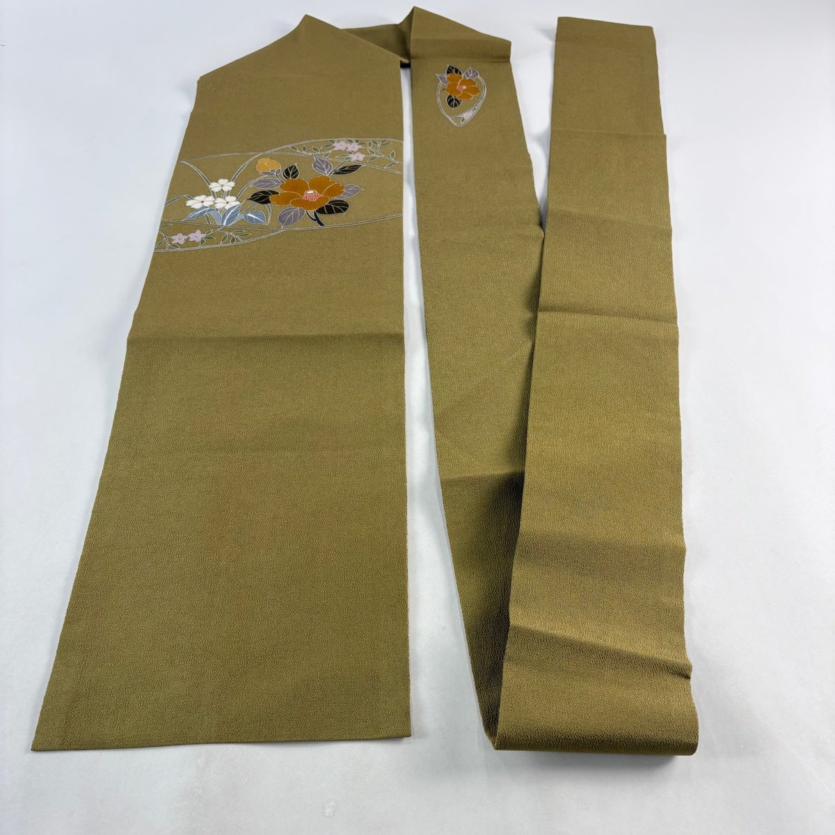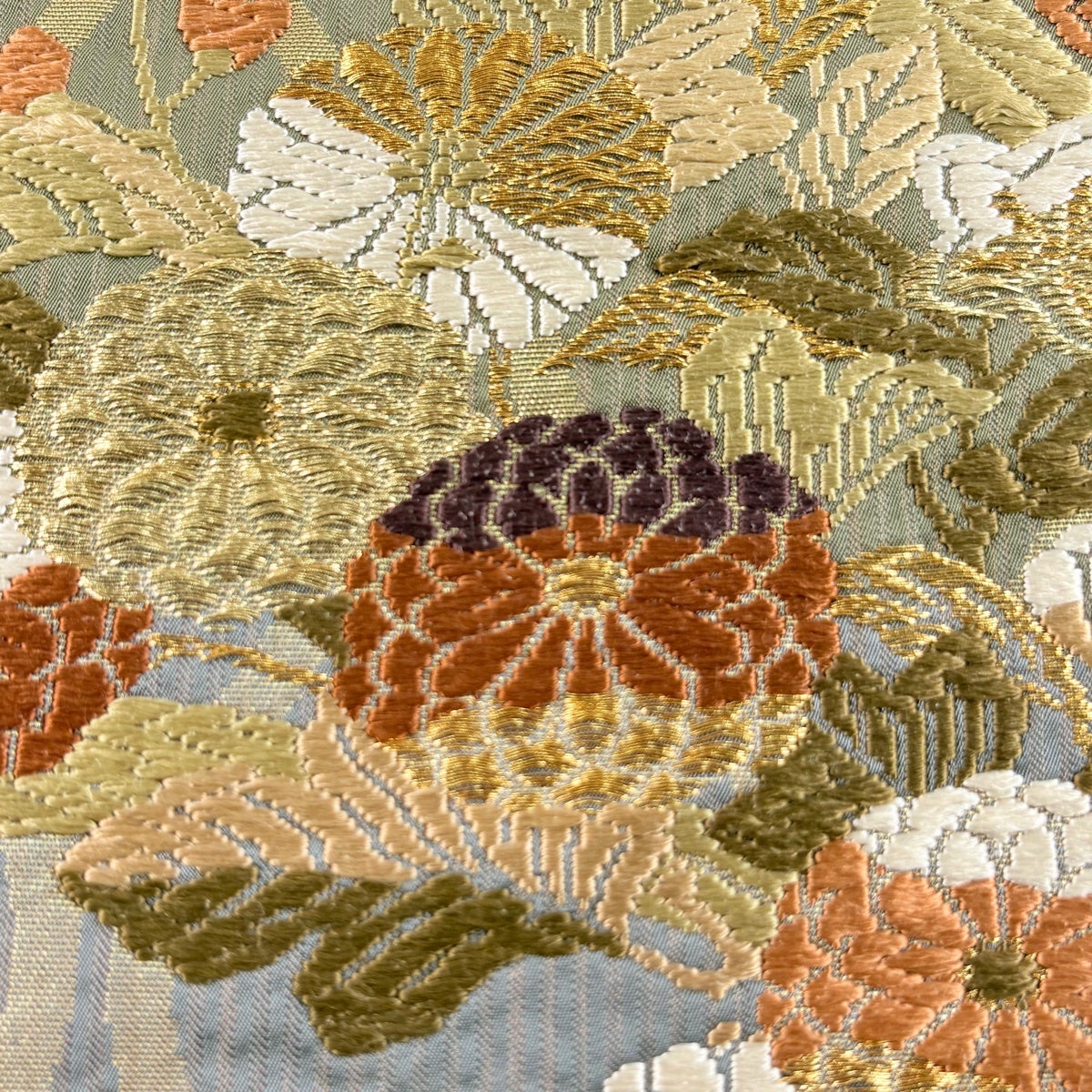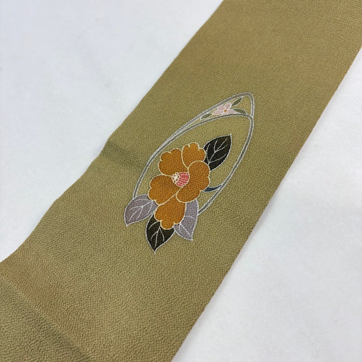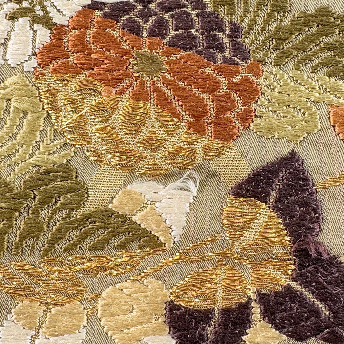【美品】 袋帯 秀品 紬地 菊 橘 刺繍 茶緑色 お太鼓柄 正絹