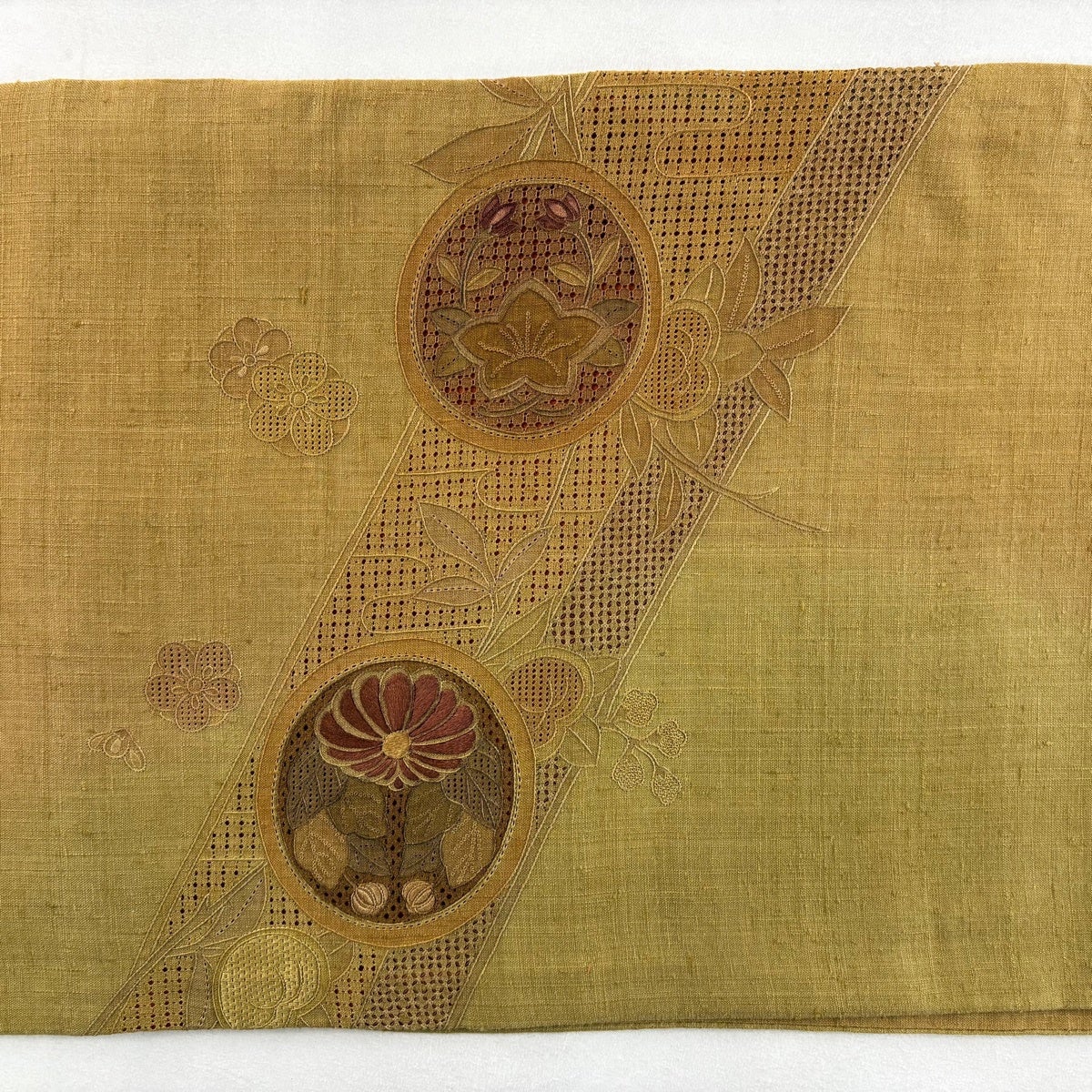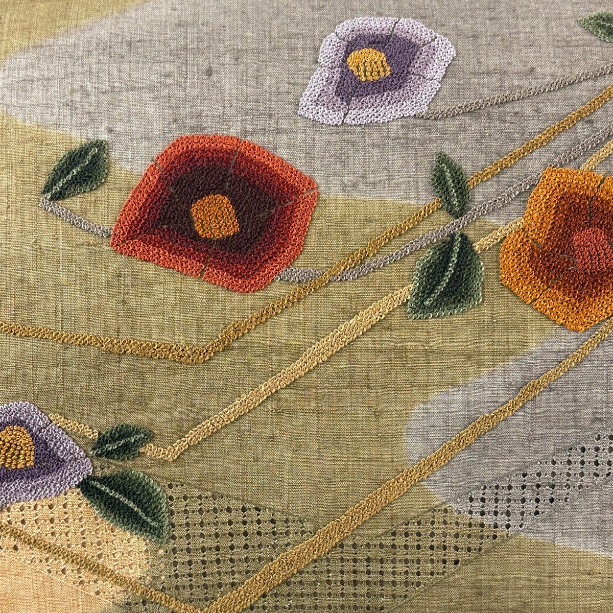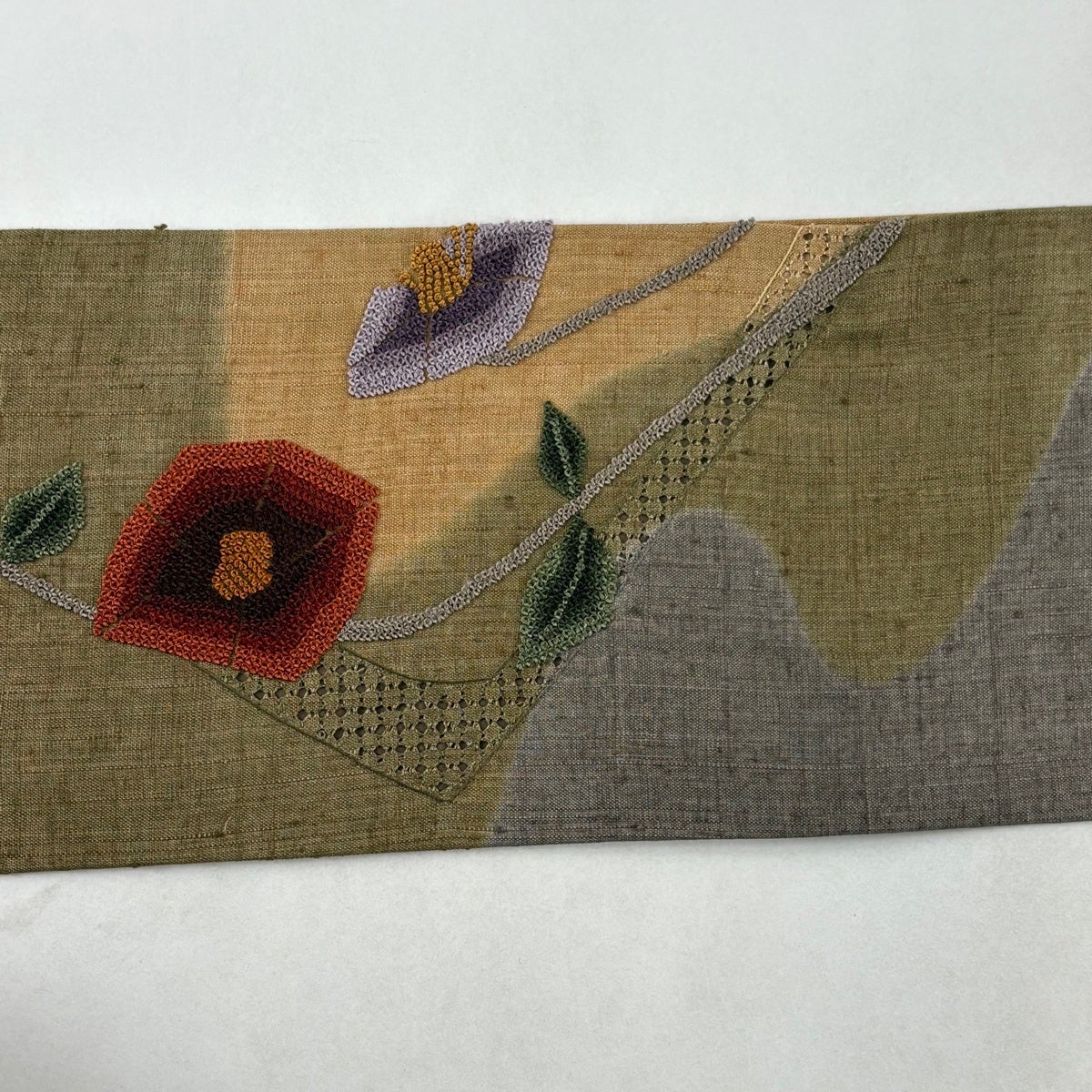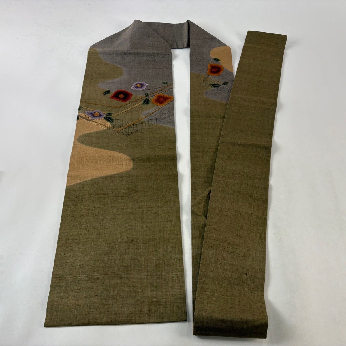 【美品】 袋帯 秀品 紬地 菊 橘 刺繍 茶緑色 お太鼓柄 正絹