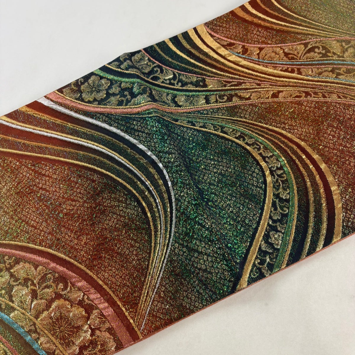 【美品】 袋帯 秀品 幾何学模様 波 金糸 茶緑色 六通 正絹
