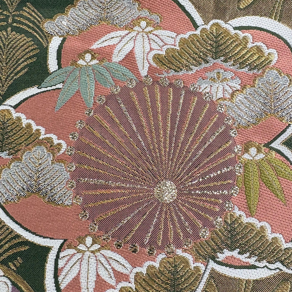 【美品】 袋帯 秀品 松竹梅 蝶 金糸 箔 茶緑色 六通 正絹