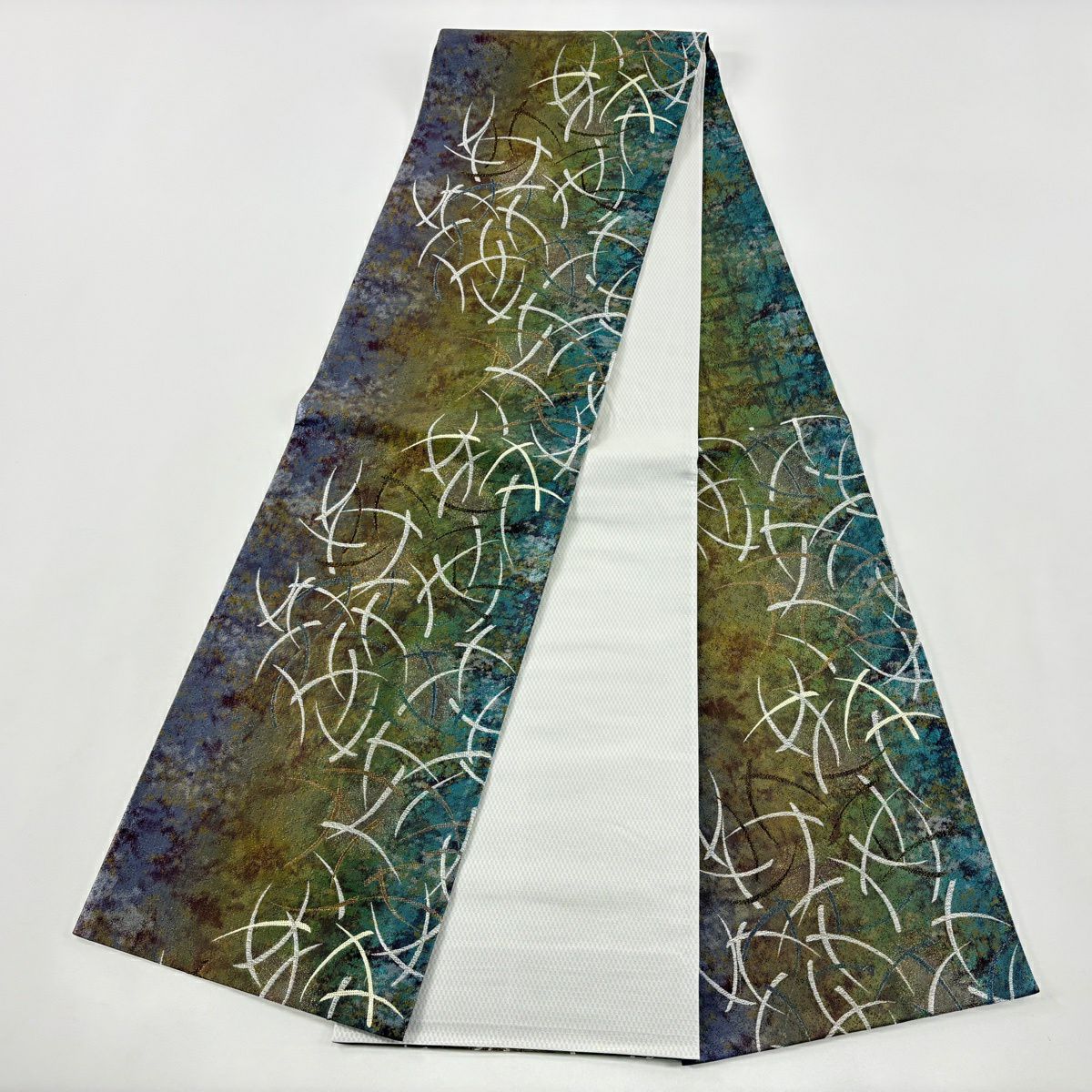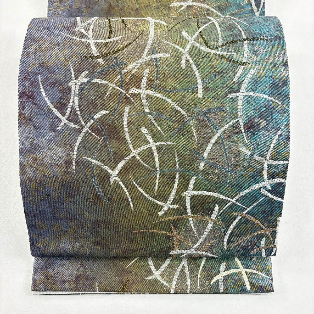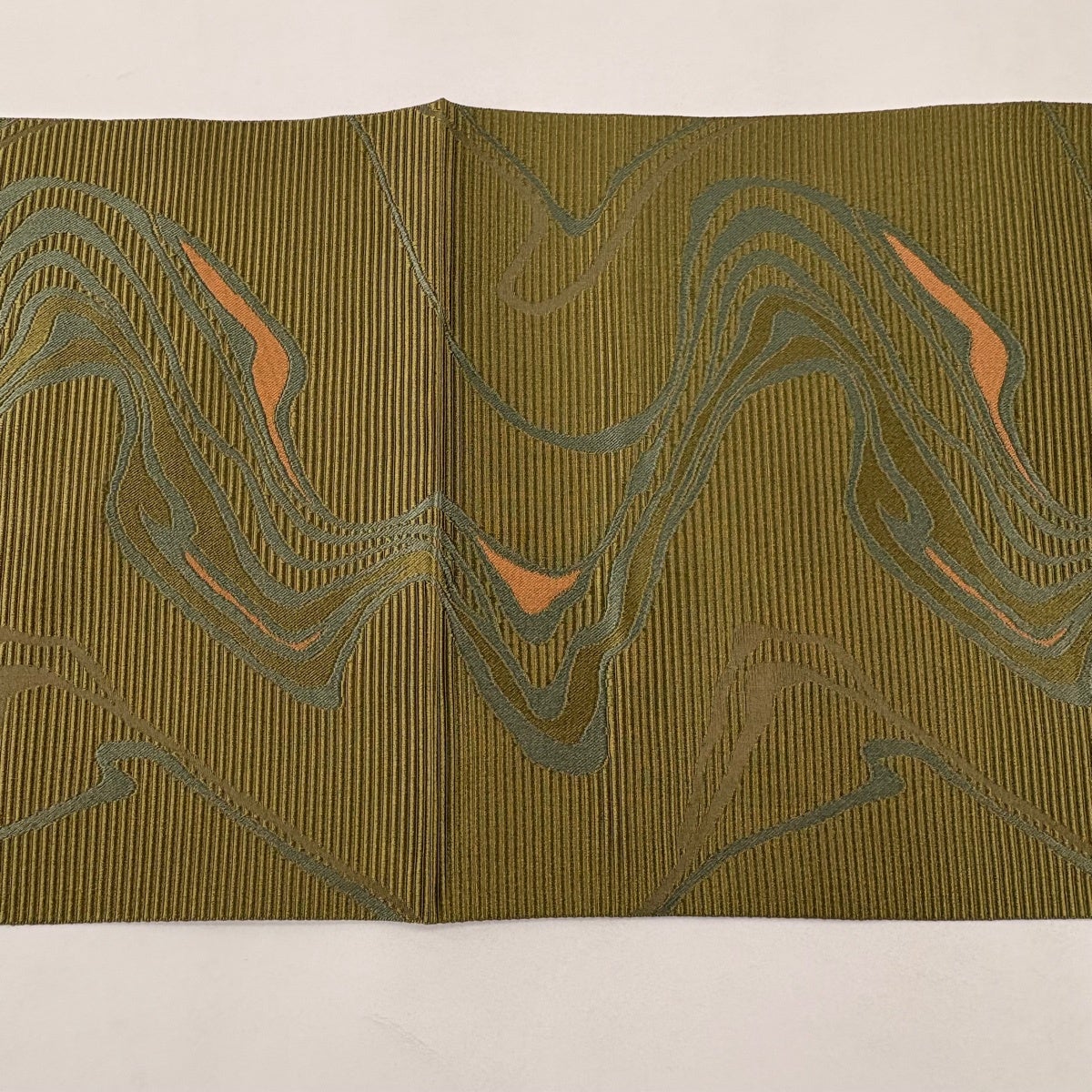 【美品】 袋帯 秀品 落款あり 流水 幾何学模様 金糸 箔 茶緑色 お太鼓柄 正絹