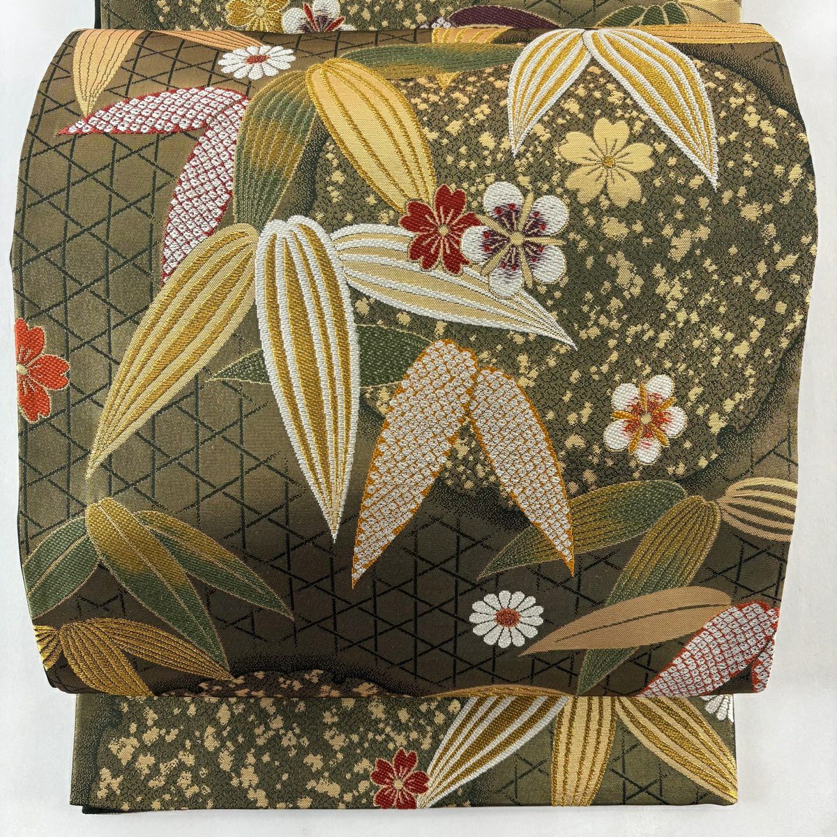 30%OFF 袋帯 秀品 草花 変わり市松 金糸 唐織 茶緑色 六通 正絹 K30
