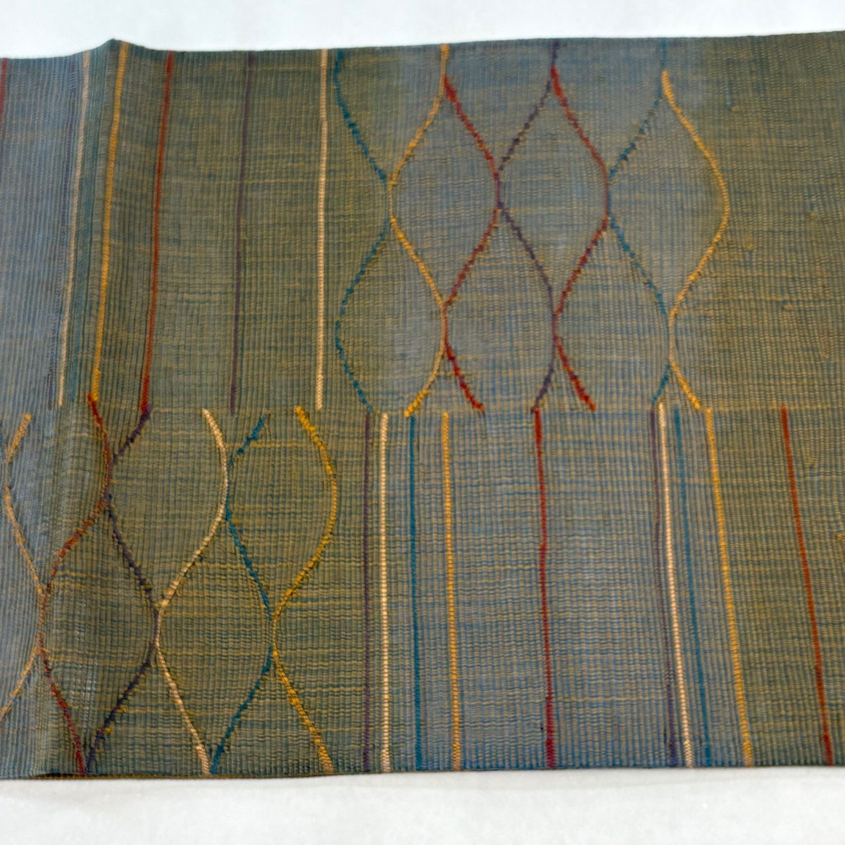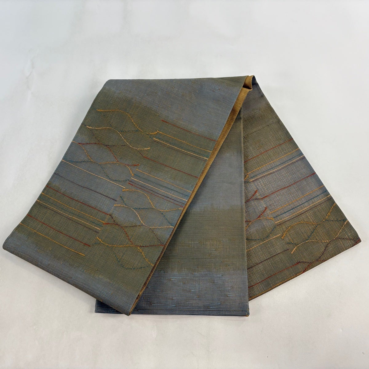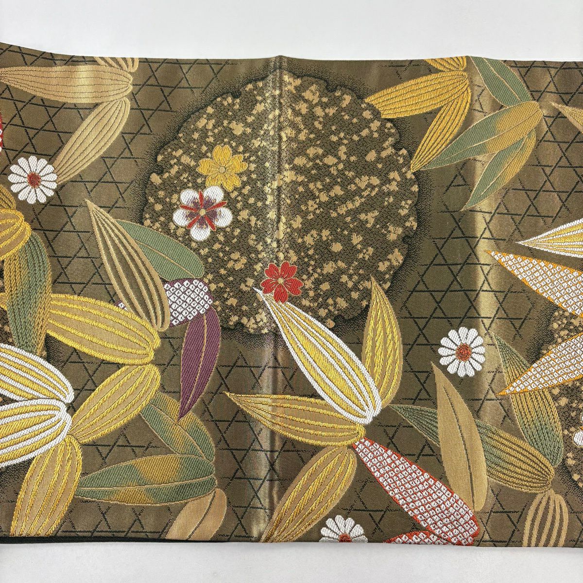 50%OFF 袋帯 秀品 夏帯 菱 幾何学 金糸 茶緑色 お太鼓柄 正絹 K50