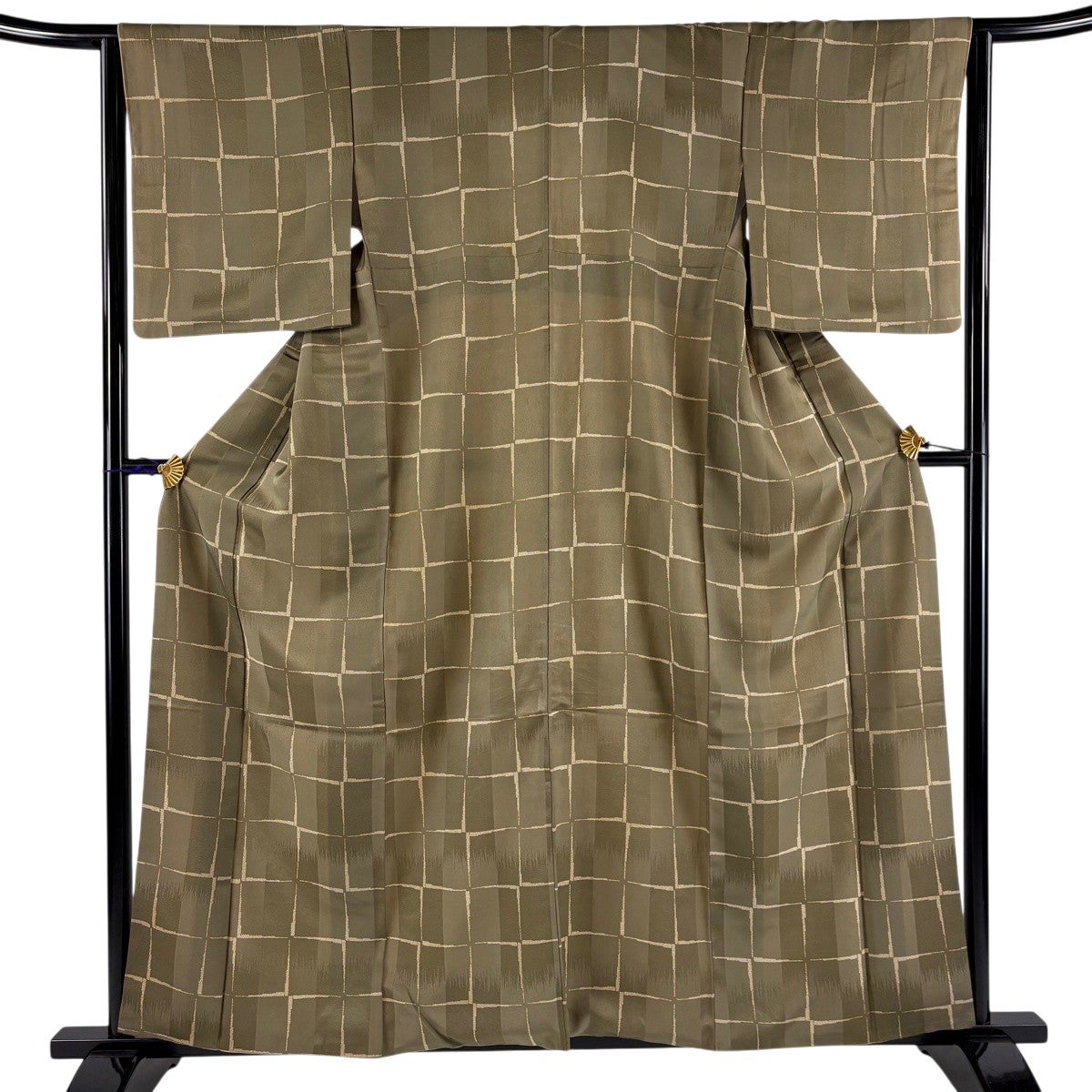 小紋 身丈153cm 裄丈64.5cm M 袷 草花 亀甲 金彩 茶緑色 正絹 秀品