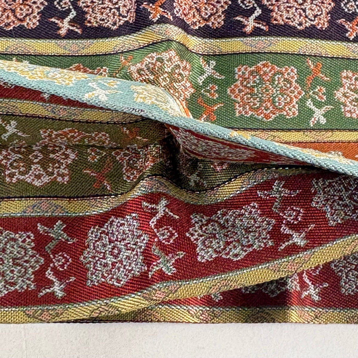 開き名古屋帯 逸品 龍村美術織物 比翼仕立て 唐花雙鳥長斑錦 金銀糸 茶緑色 正絹