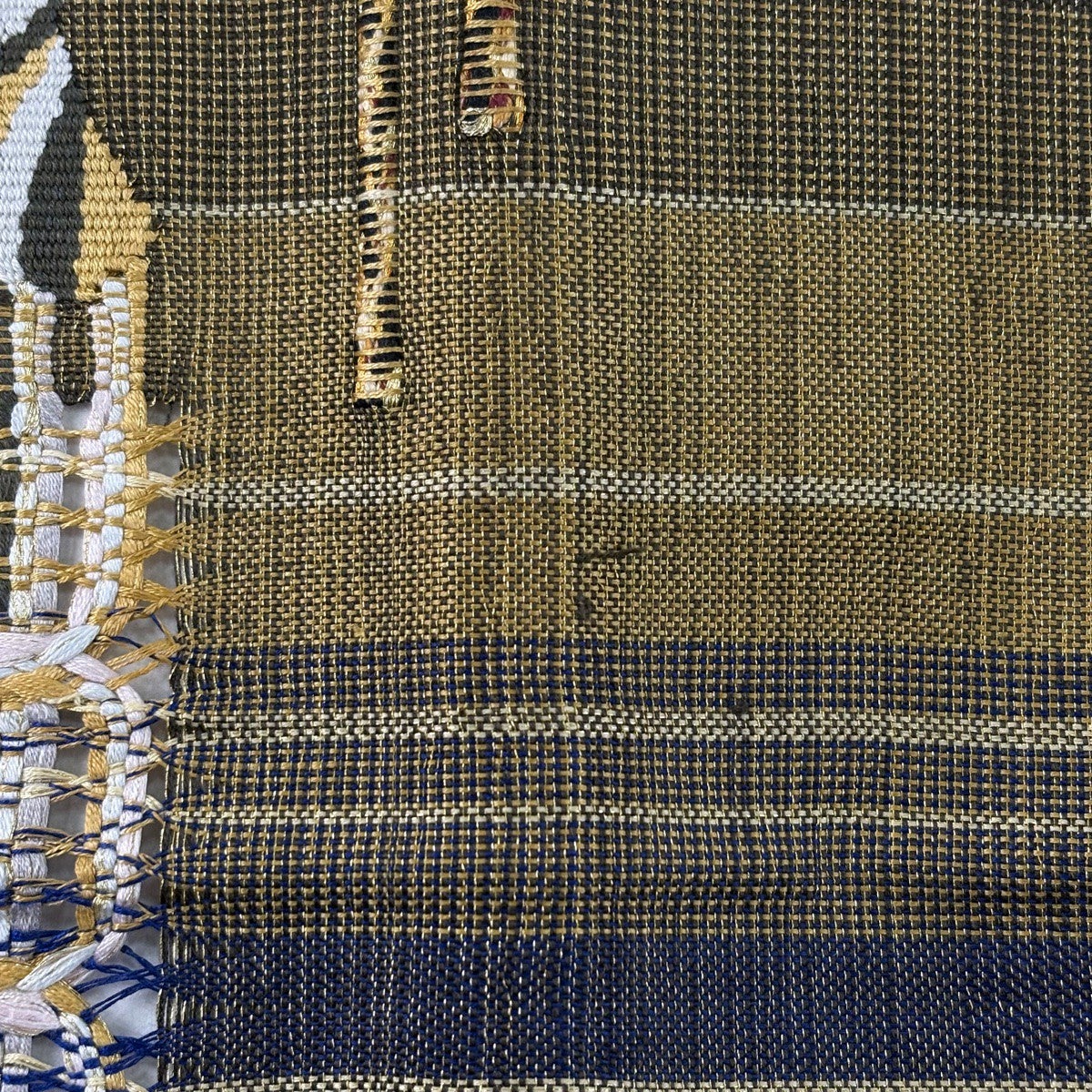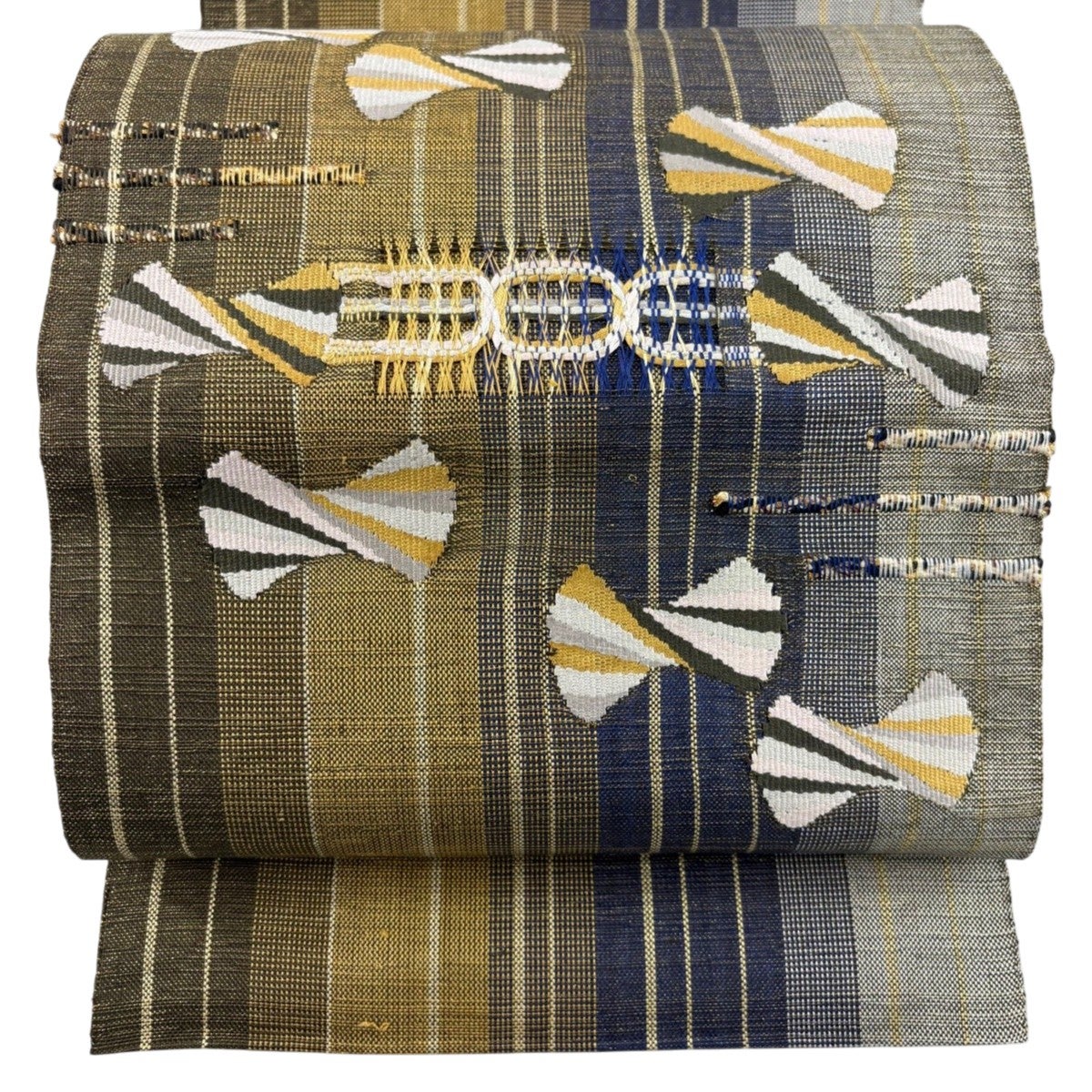 名古屋帯 秀品 夏帯 松葉したて 八寸名古屋帯 縞 幾何学模様 金糸 刺繍 茶緑色 正絹