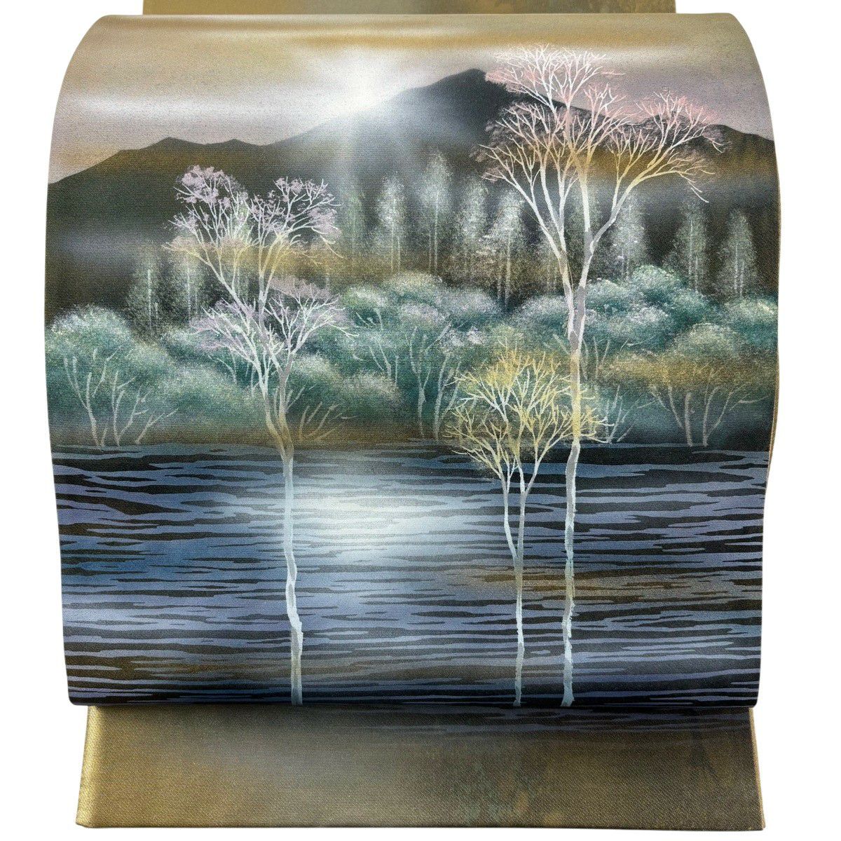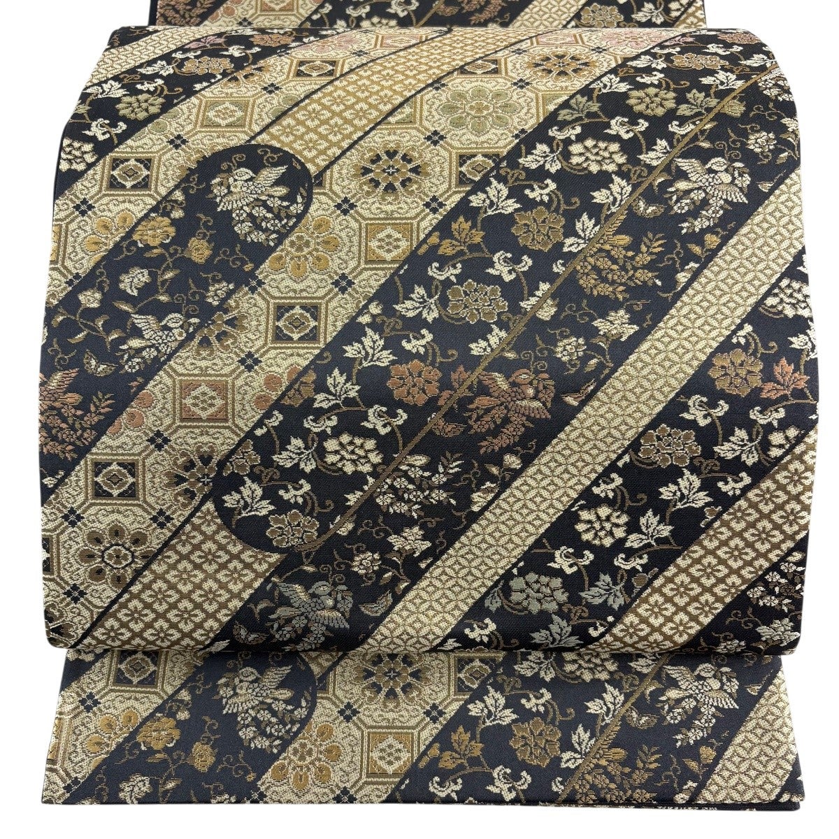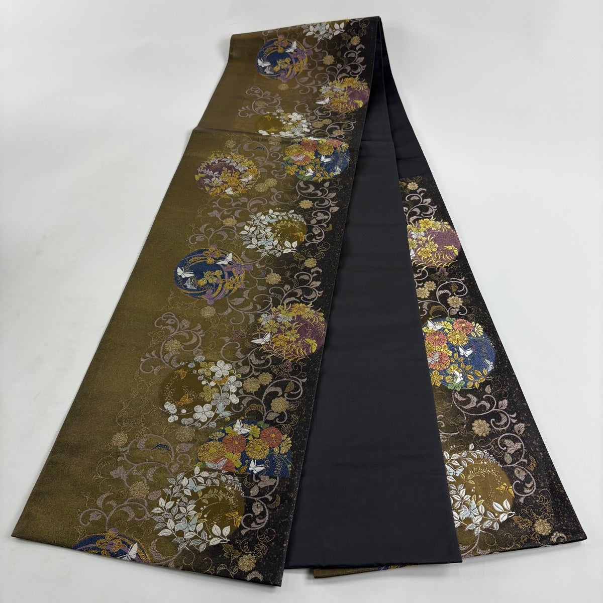 【最終価格】 70%OFF 【美品】 袋帯 名品 動物 草花 箔 茶緑色 六通 正絹 K70
