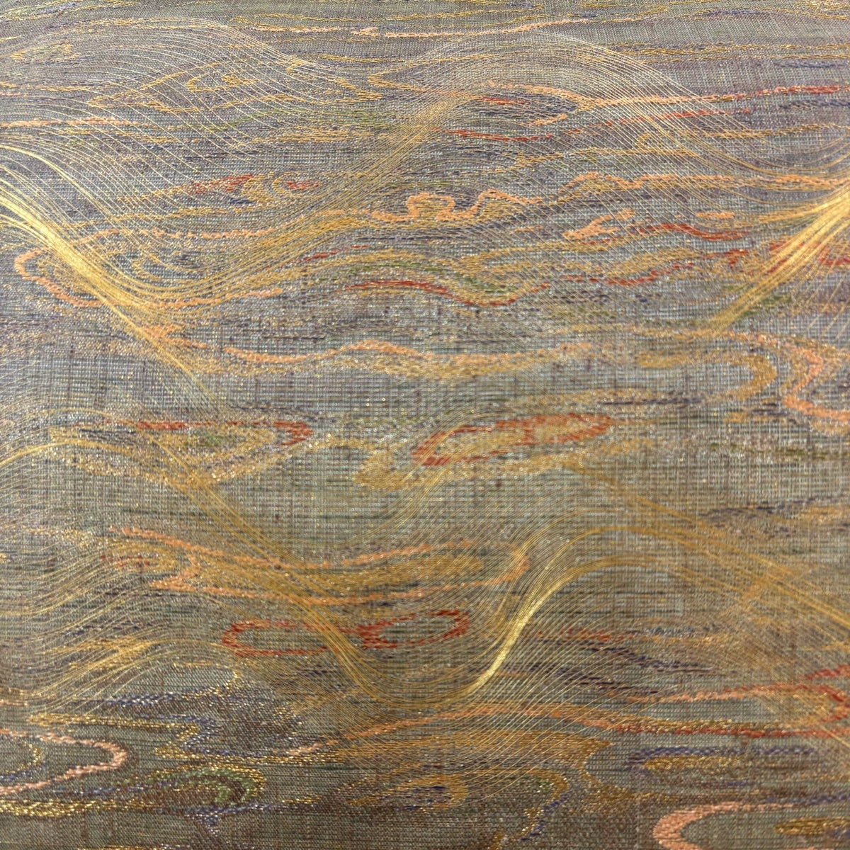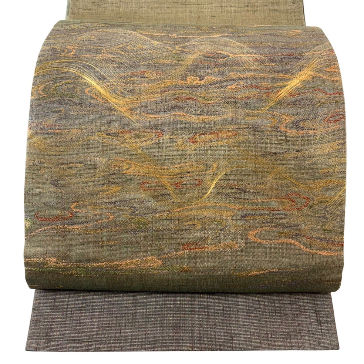 袋帯 逸品 辻村ジュサブロー 落款あり 斜縞 波 金糸 茶緑色 六通 正絹