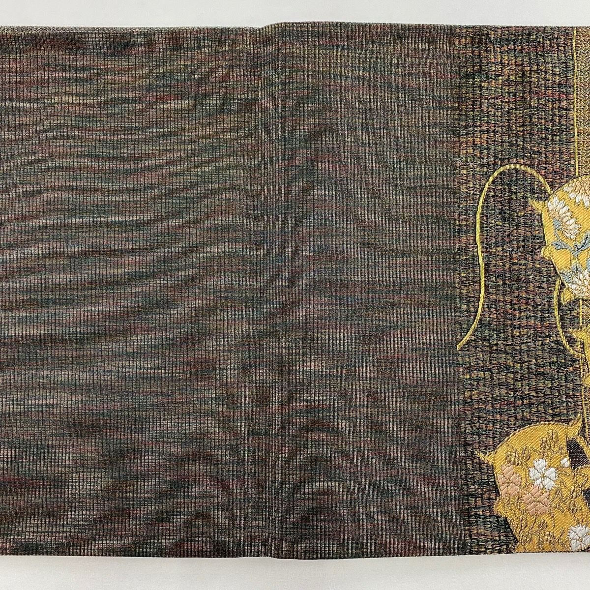【在庫一掃】 【美品】 袋帯 名品 菊水蒔絵文様 唐織 箔 茶緑色 六通 正絹