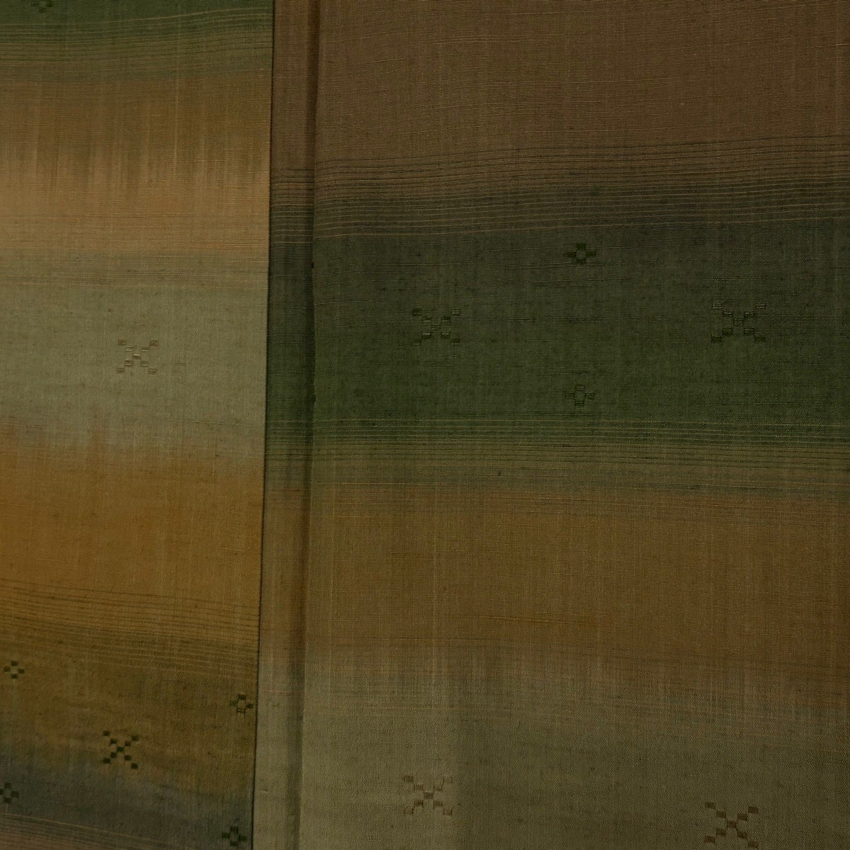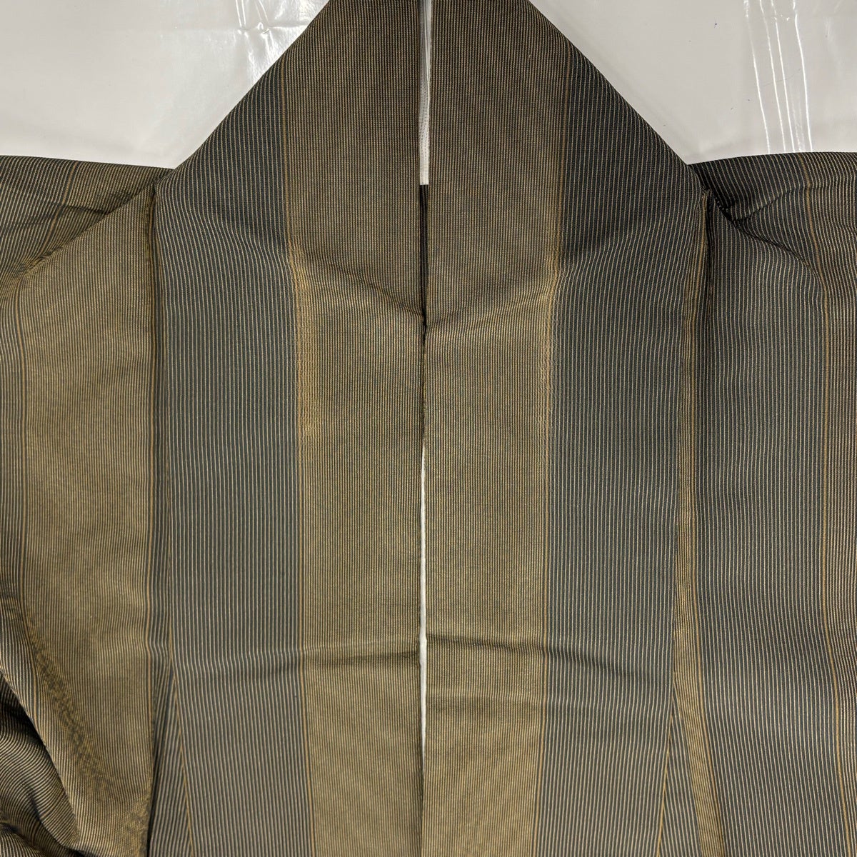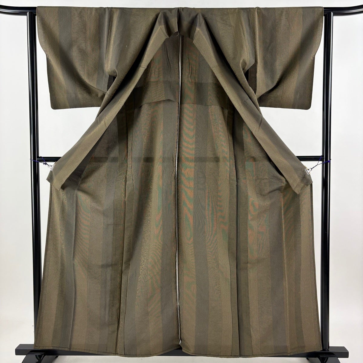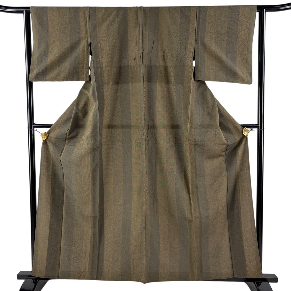 30%OFF 紬 身丈161cm 裄丈62.5cm S 単衣 縦縞 茶緑色 正絹 秀品 K30