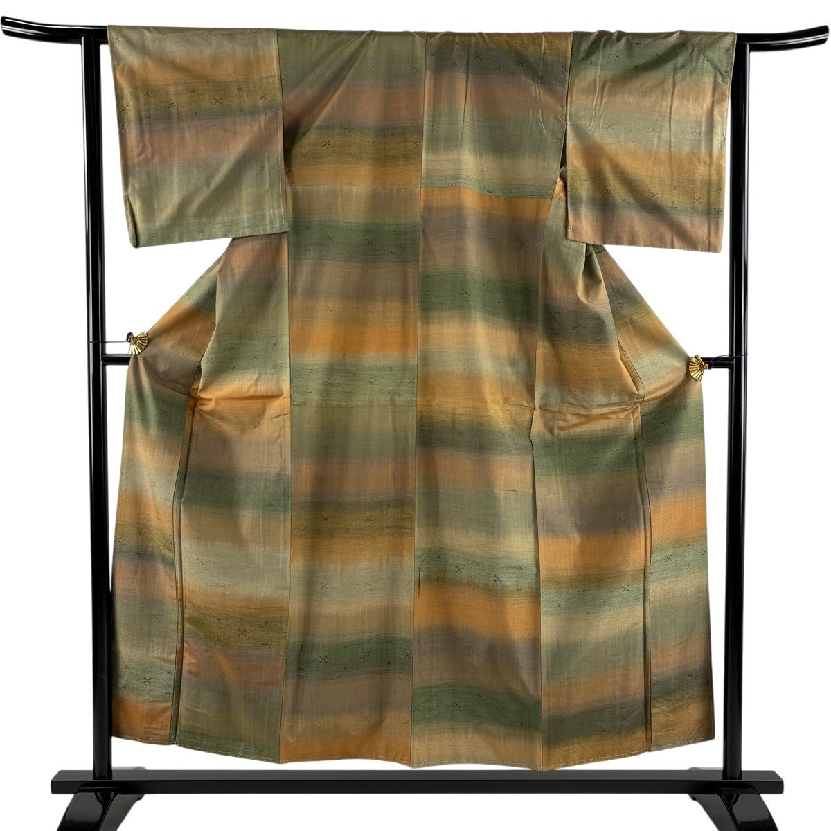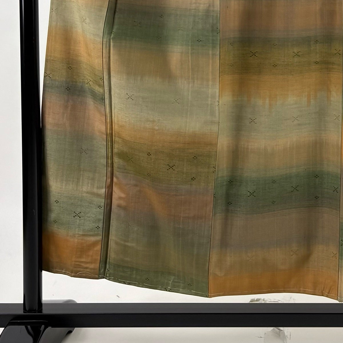 50%OFF 紬 身丈164cm 裄丈69cm L 袷 幾何学 縞 茶緑色 正絹 名品 K50