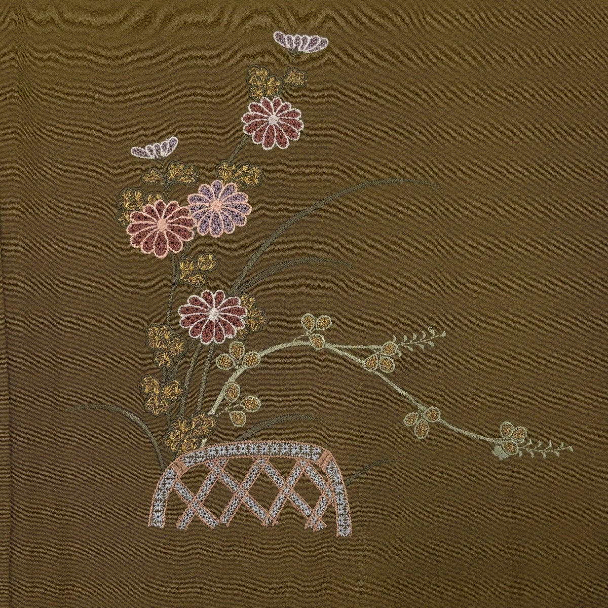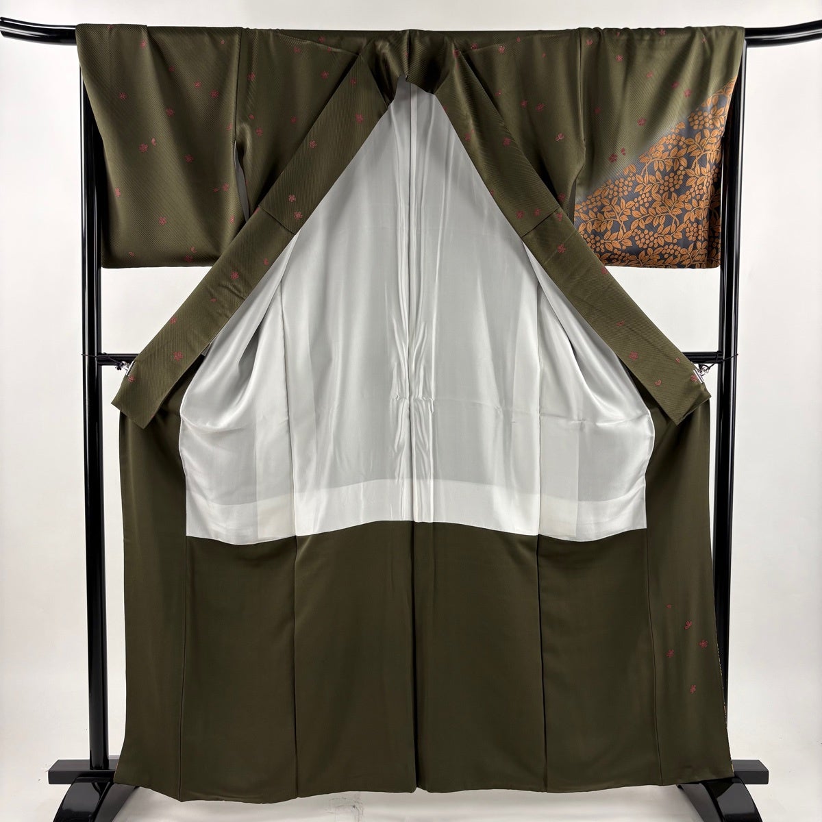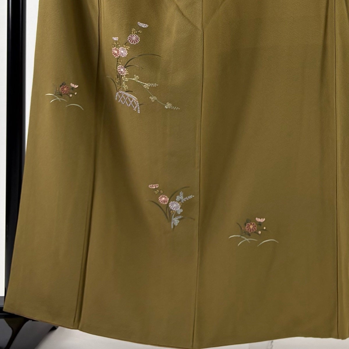 付下げ 身丈160cm 裄丈64cm M 袷 ますいわ屋 菊 萩 刺繍 金糸 茶緑色 正絹 秀品