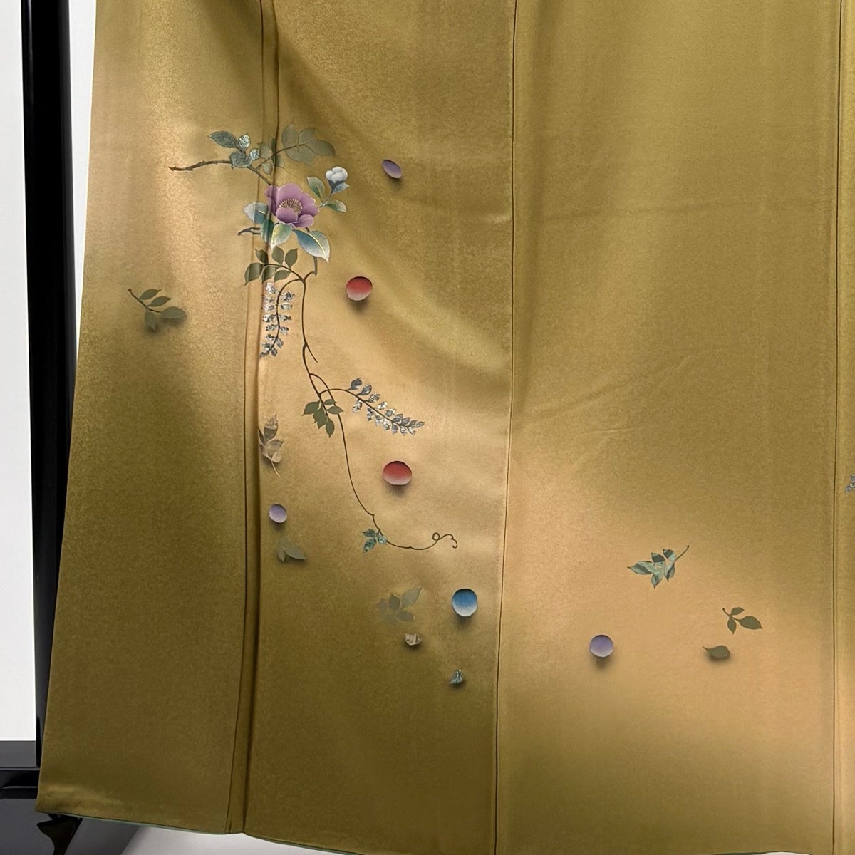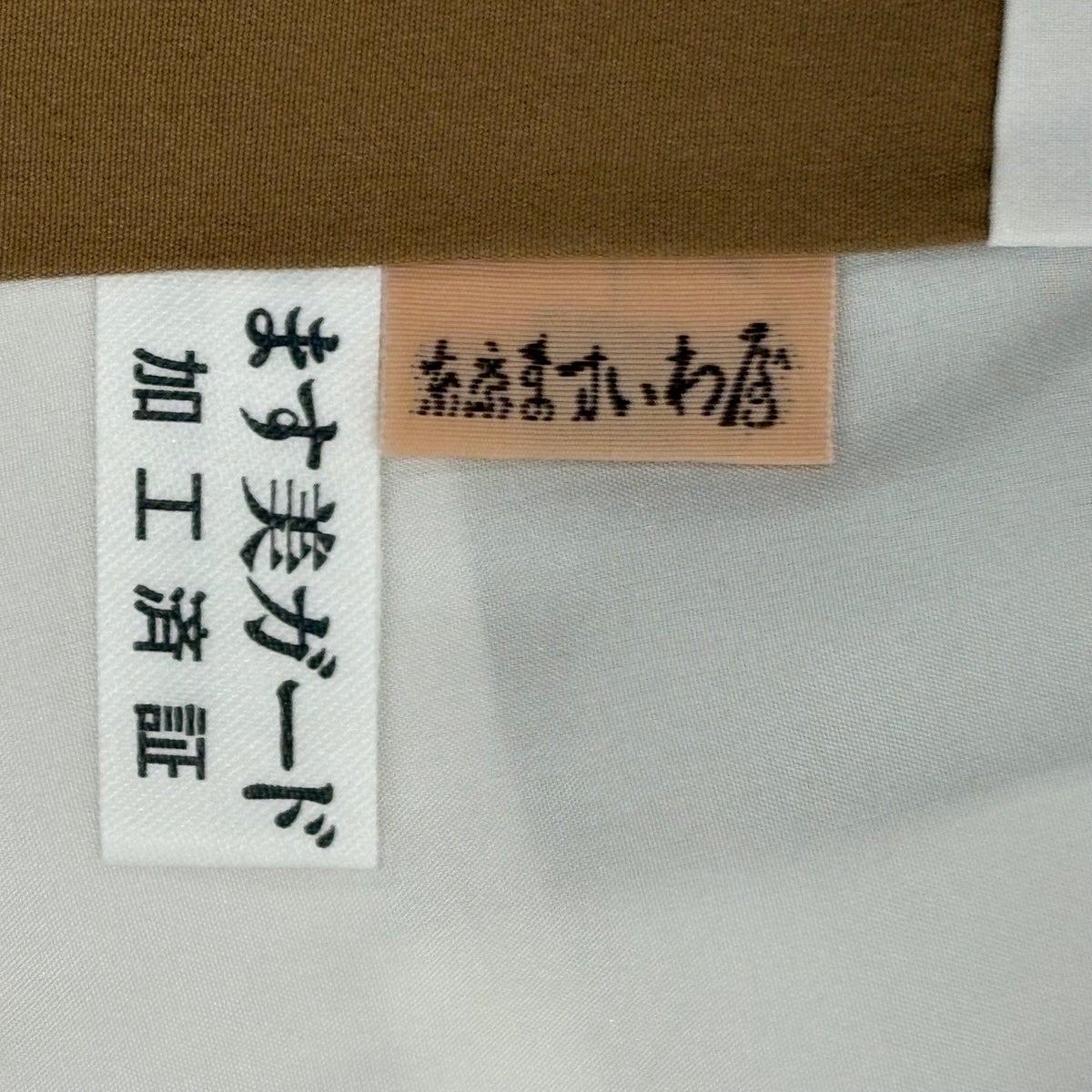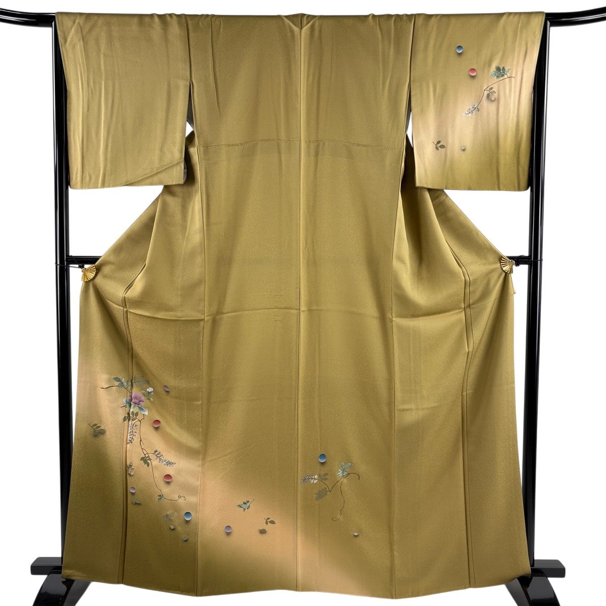 付下げ 身丈160cm 裄丈64cm M 袷 ますいわ屋 菊 萩 刺繍 金糸 茶緑色 正絹 秀品