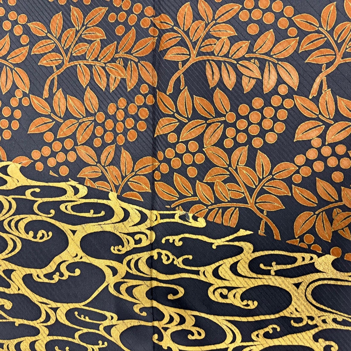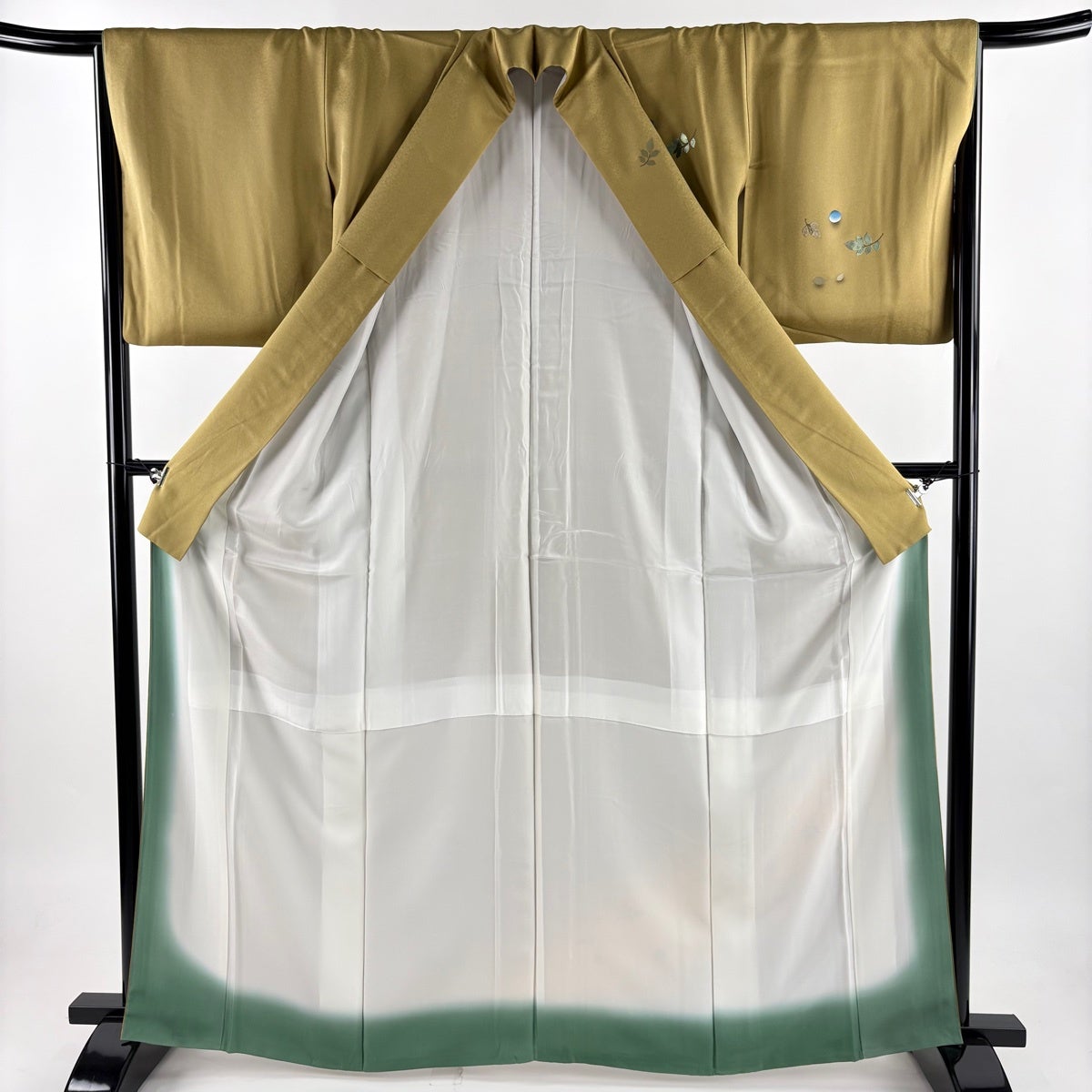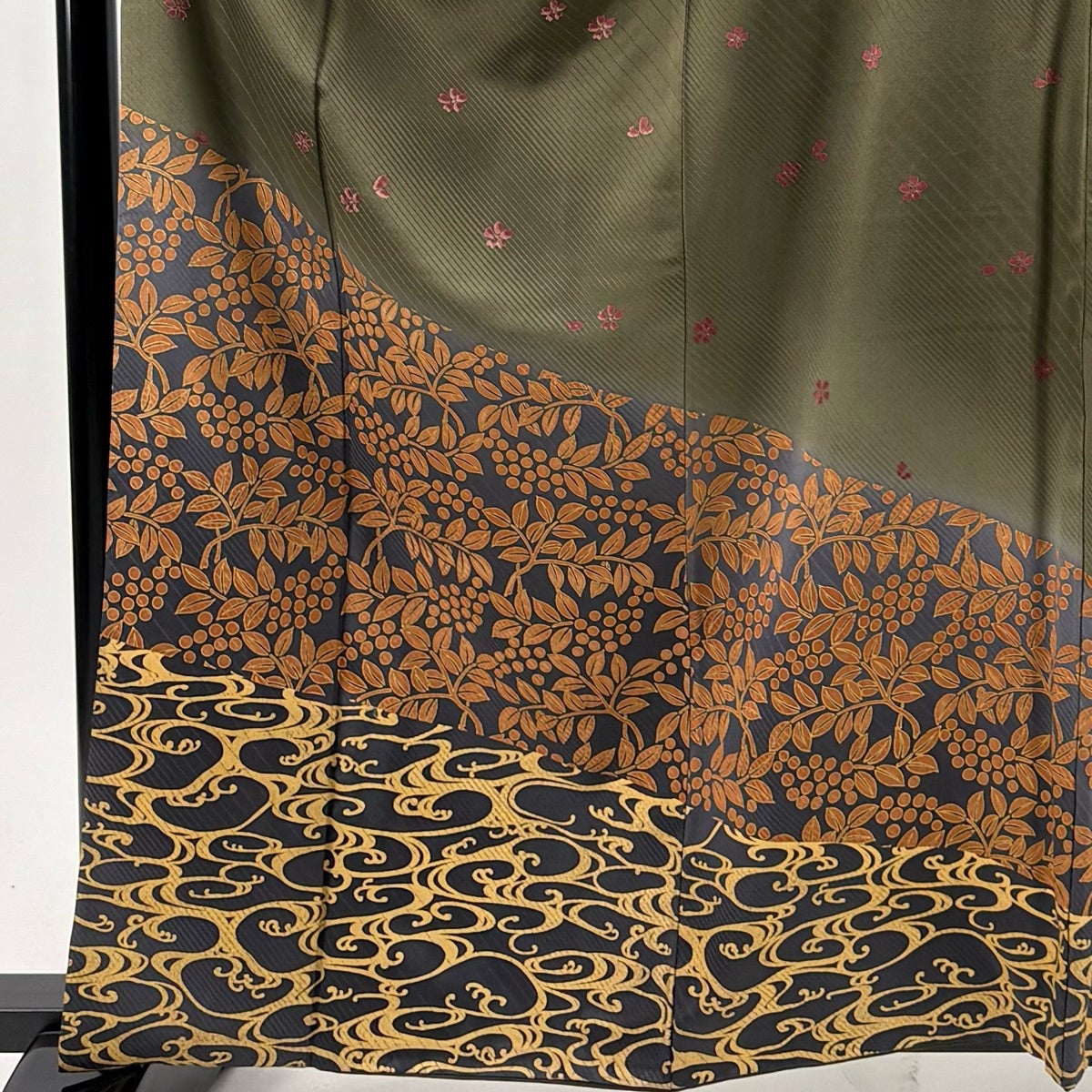 付下げ 身丈162.5cm 裄丈68cm L 袷 葉と実 波頭 金彩 ぼかし 茶緑色 正絹 秀品