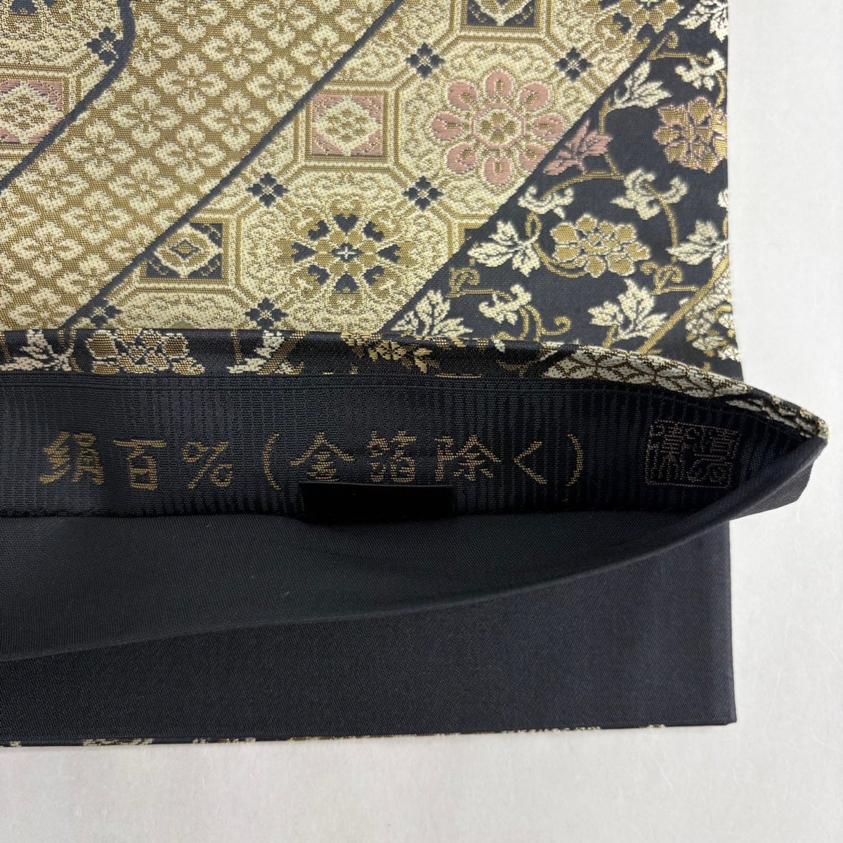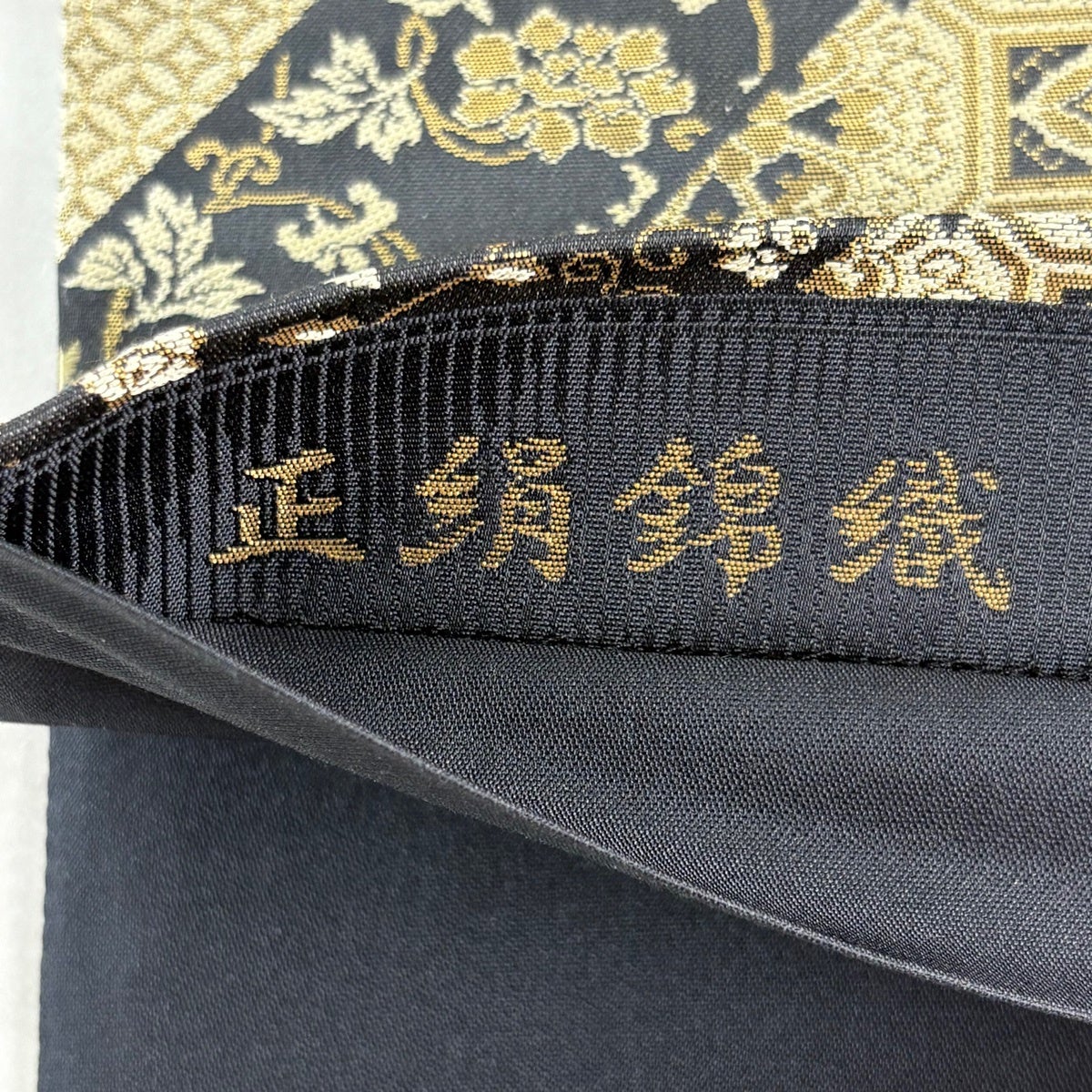 50%OFF 【美品】 袋帯 秀品 証紙あり 華文 菱 金糸 箔 茶緑色 六通 正絹 K50