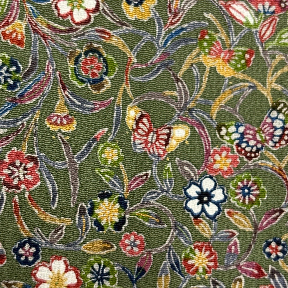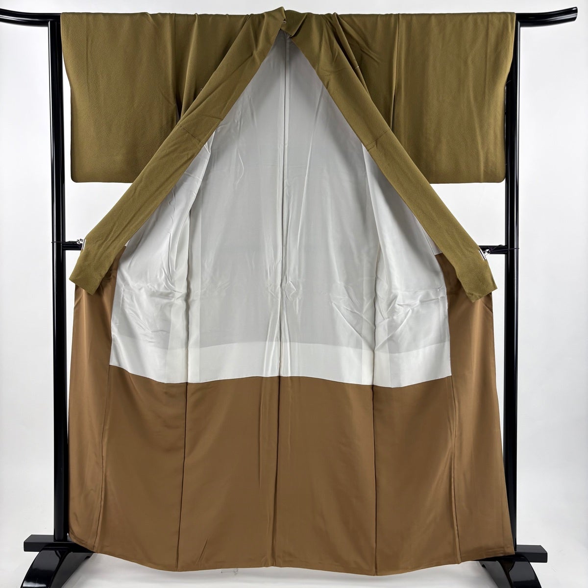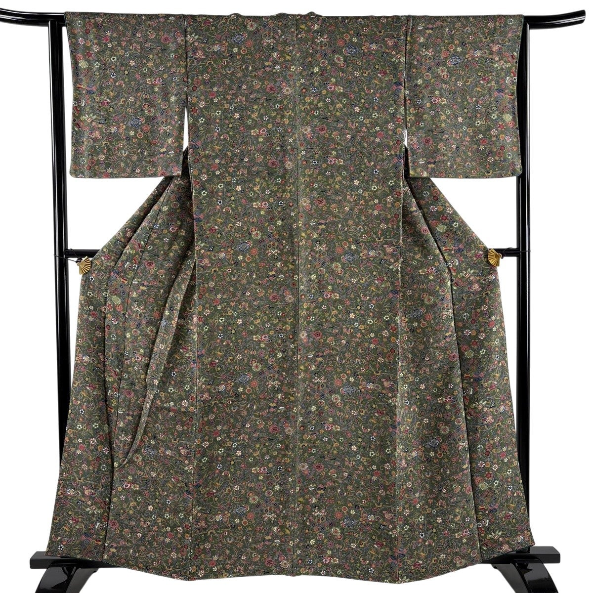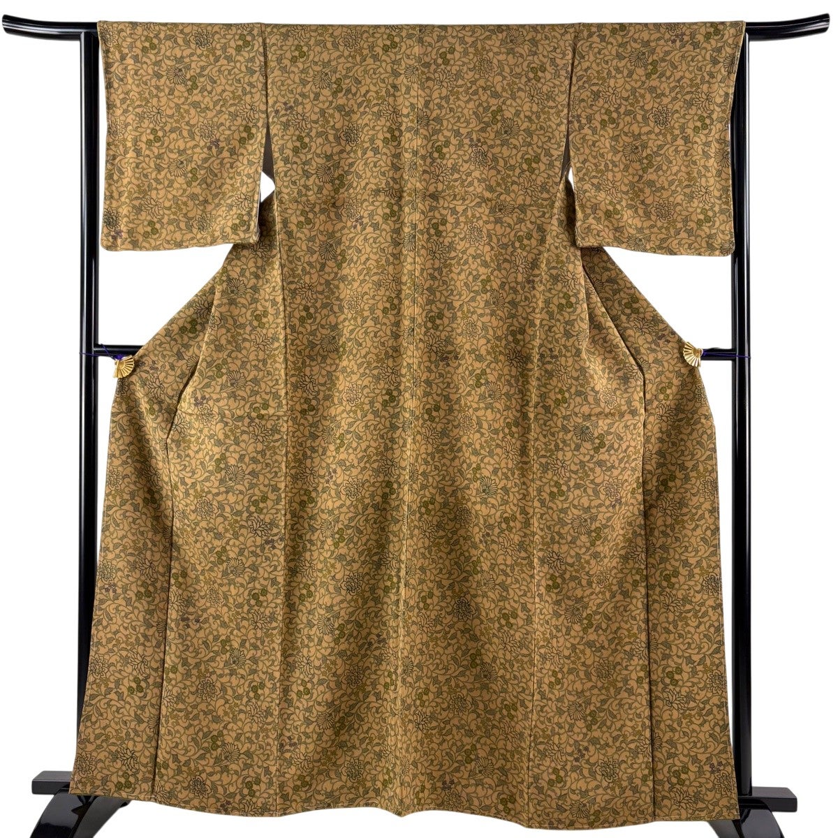 【美品】 小紋 身丈161cm 裄丈64.5cm M 袷 花唐草 ちりめん 茶緑色 正絹 秀品