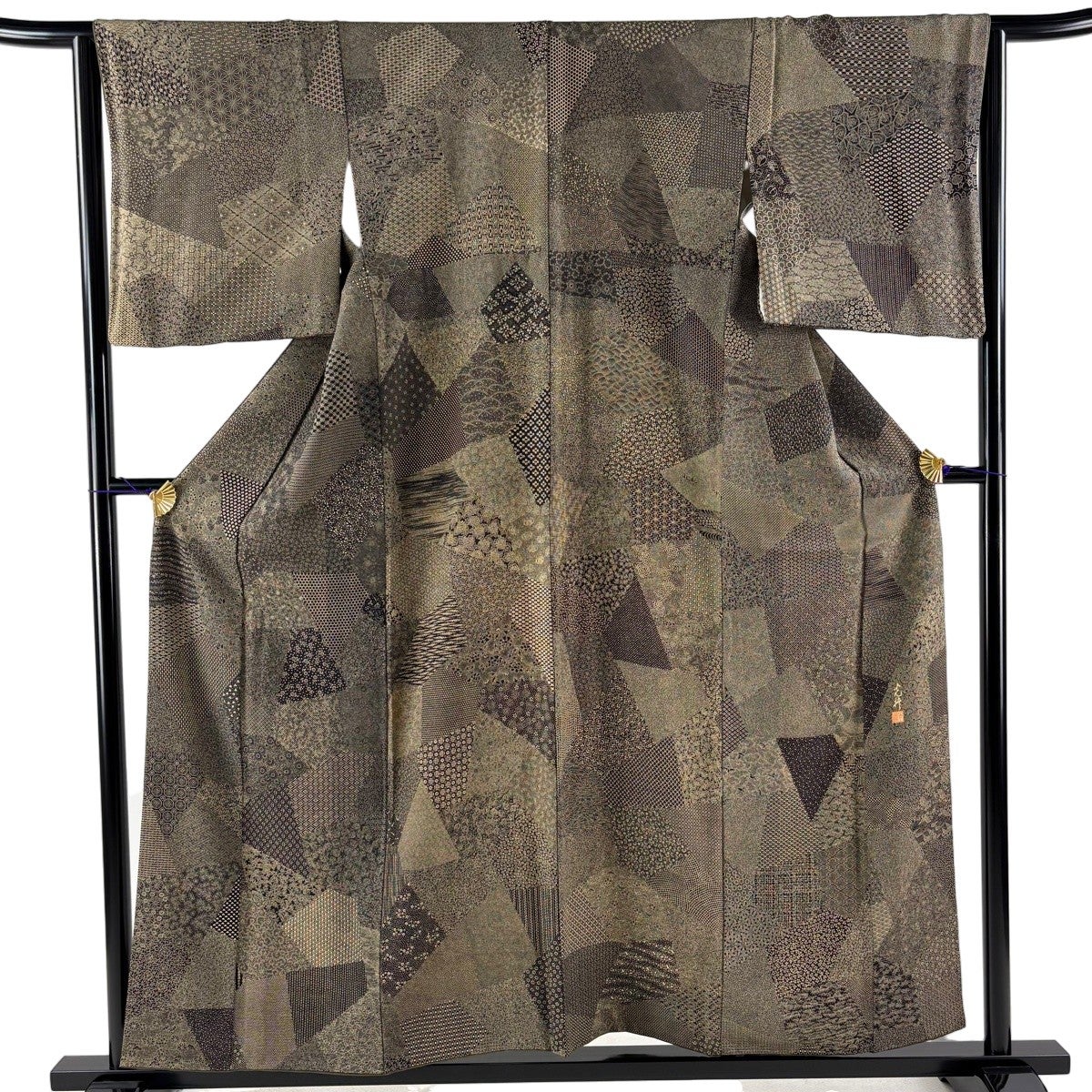 70%OFF 小紋 身丈162.5cm 裄丈65cm M 袷 幾何学 茶緑色 正絹 秀品 K70