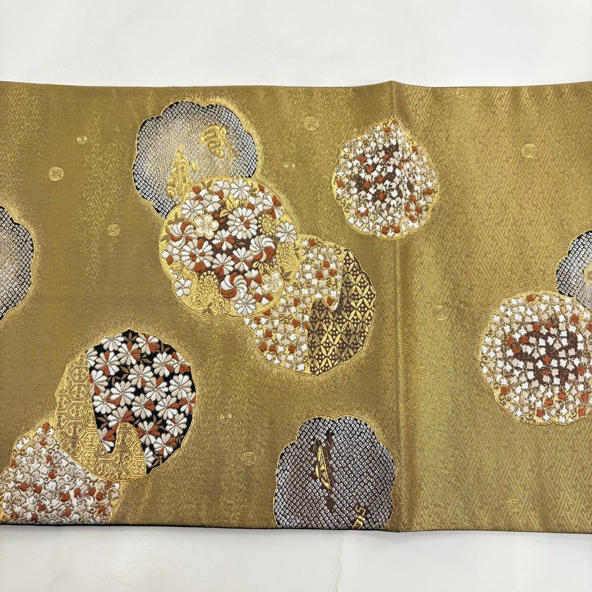 【最終価格】 77%OFF 【美品】 袋帯 秀品 菊 波 金糸 箔 茶緑色 六通 正絹 K70