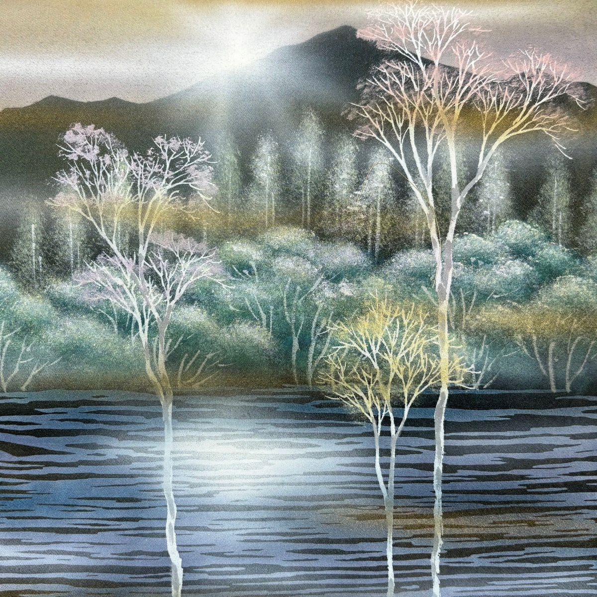 訪問着 身丈161cm 裄丈69.5cm L 袷 風景 松 染め分け ぼかし 茶緑色 正絹 名品