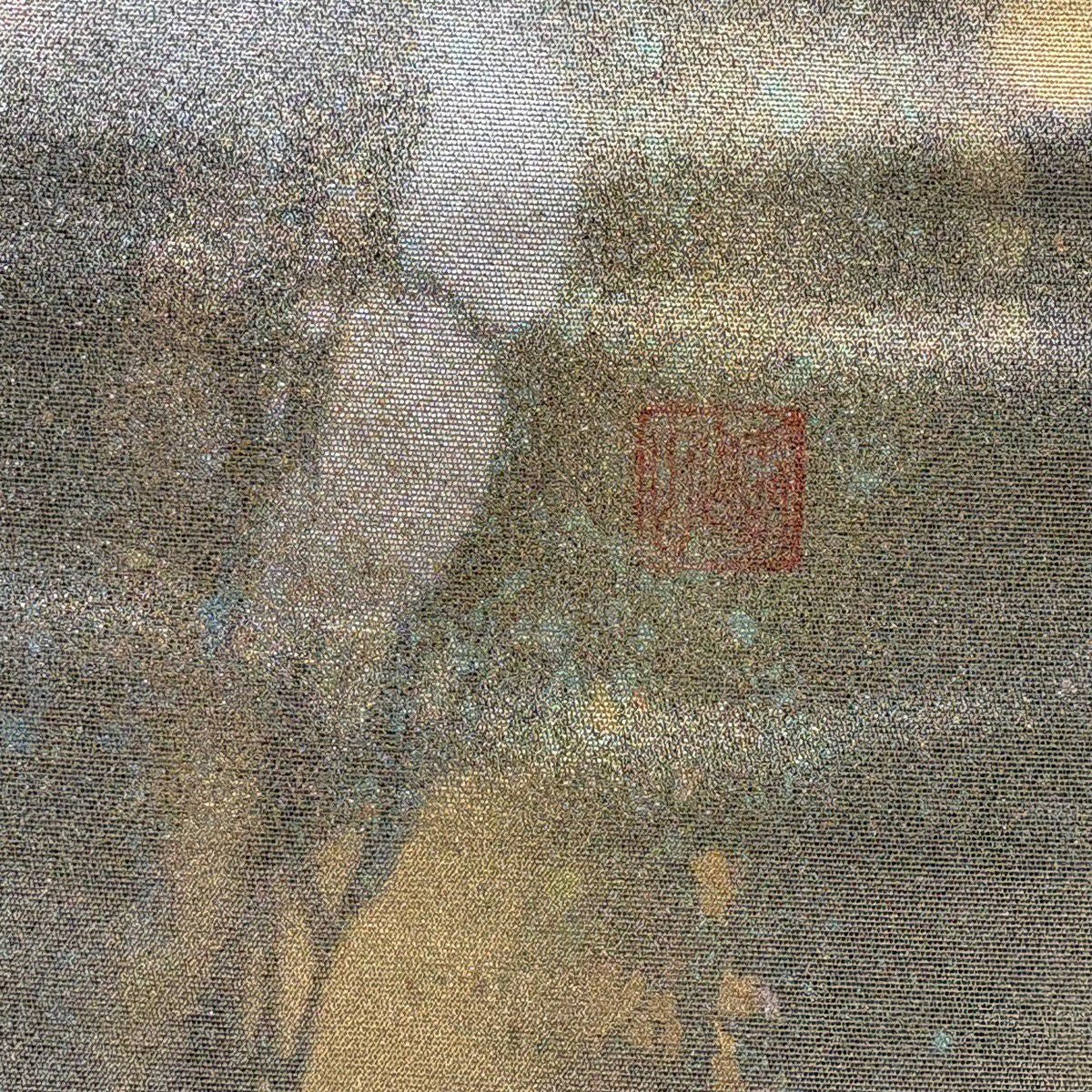 40%OFF 袋帯 逸品 落款あり 牛首紬 草花 金彩 絞り 茶緑色 お太鼓柄 正絹 K30