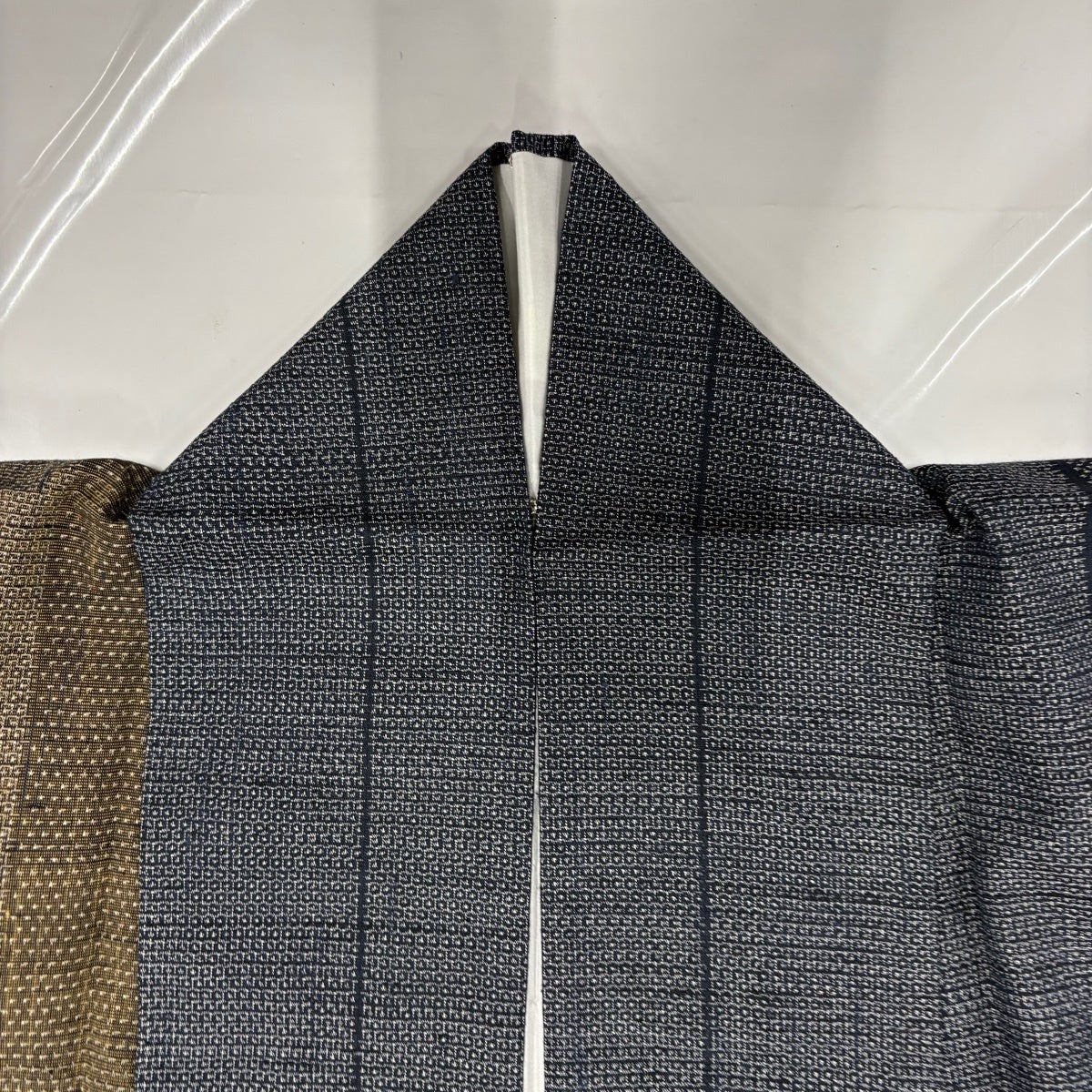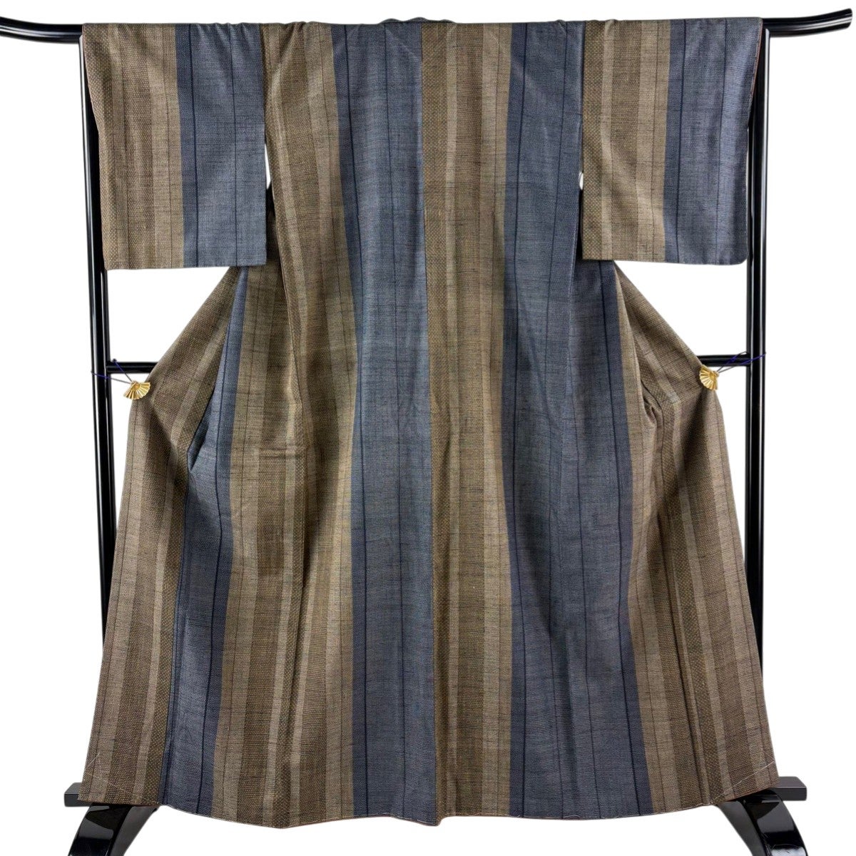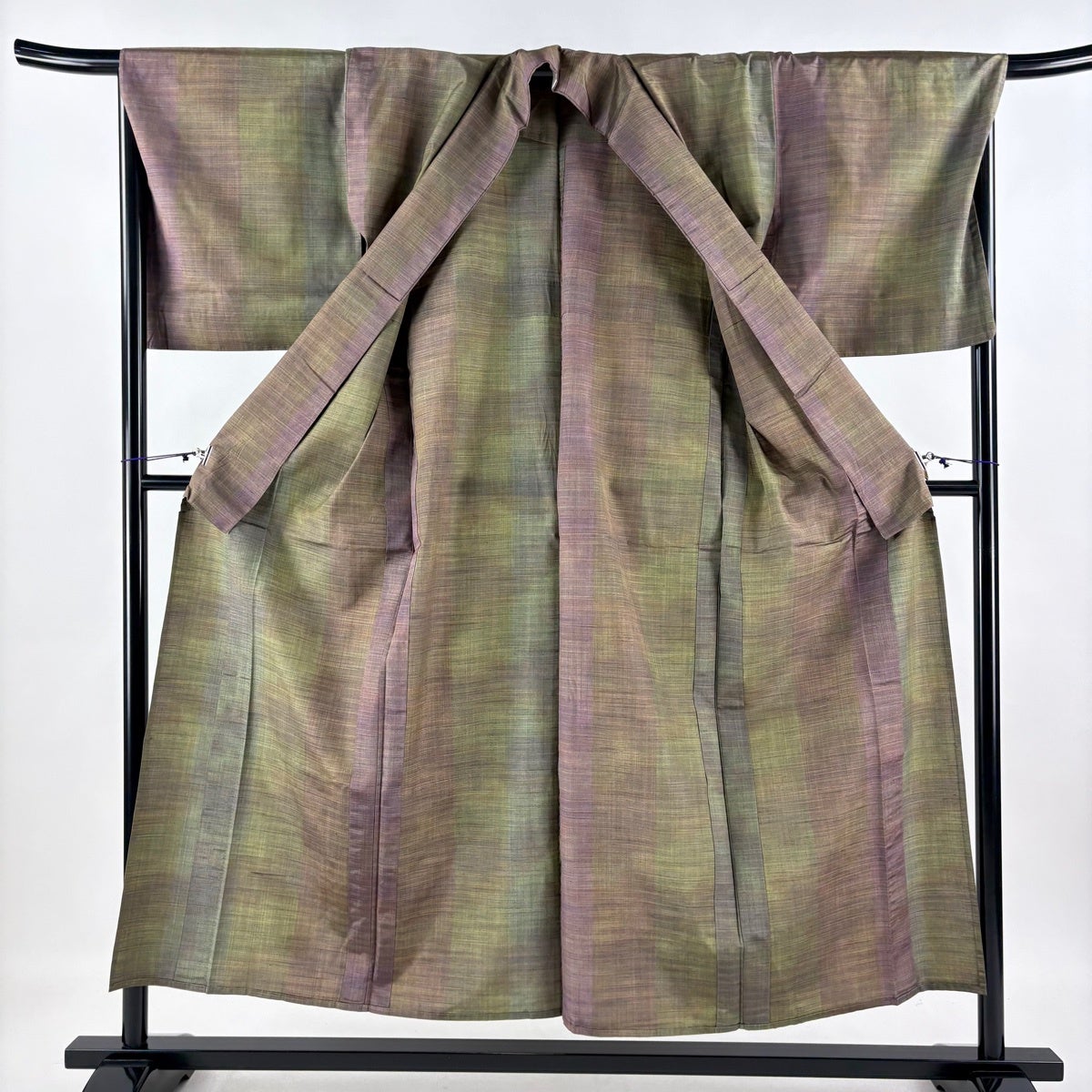 【美品】 紬 身丈163cm 裄丈66.5cm M 袷 縞 亀甲絣 茶緑色 正絹 名品
