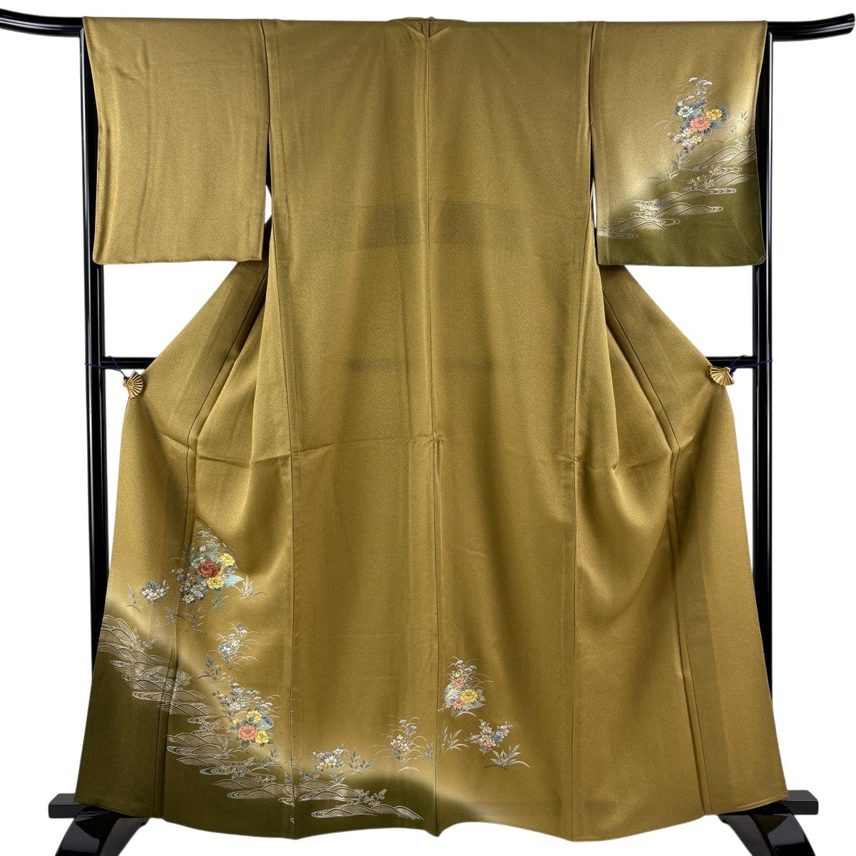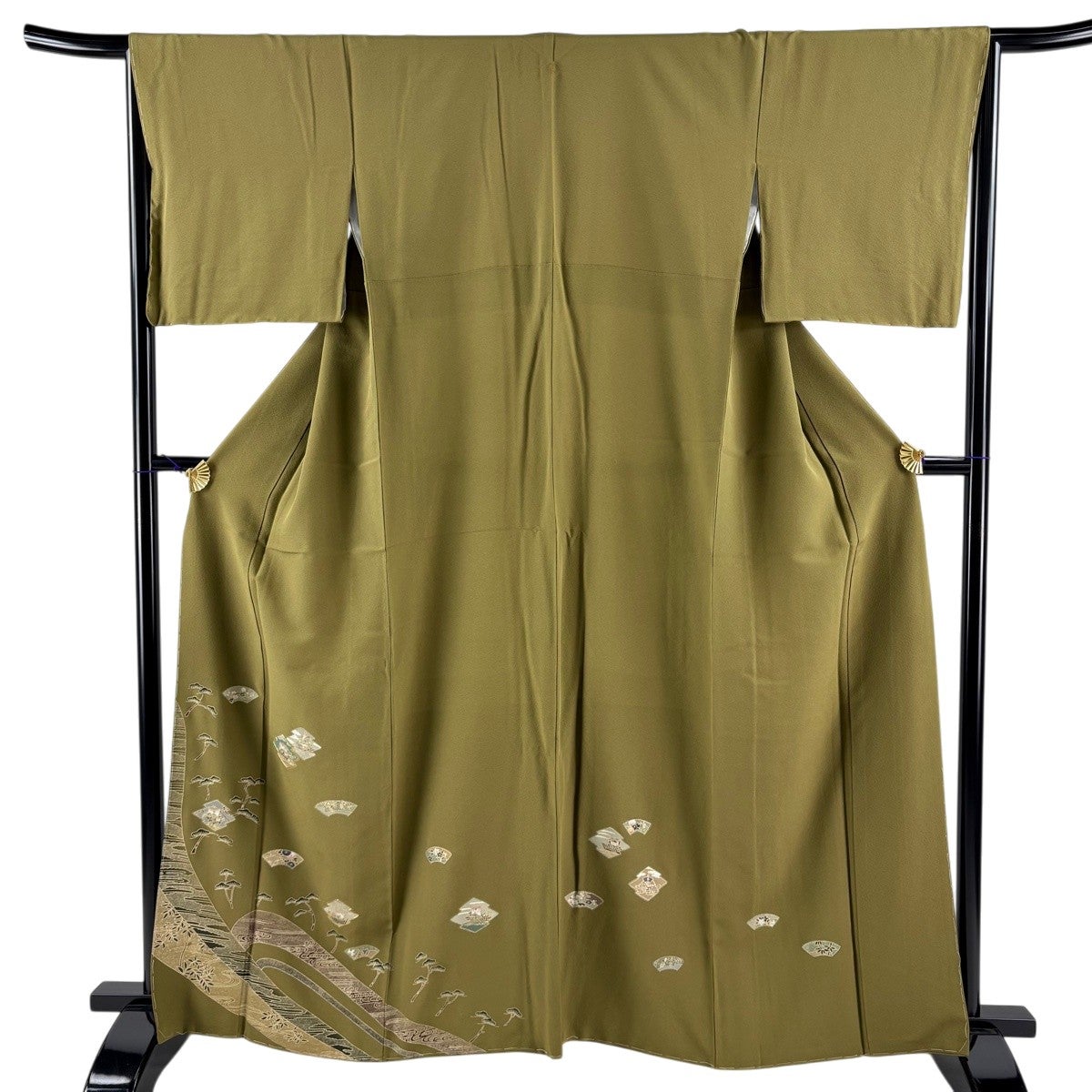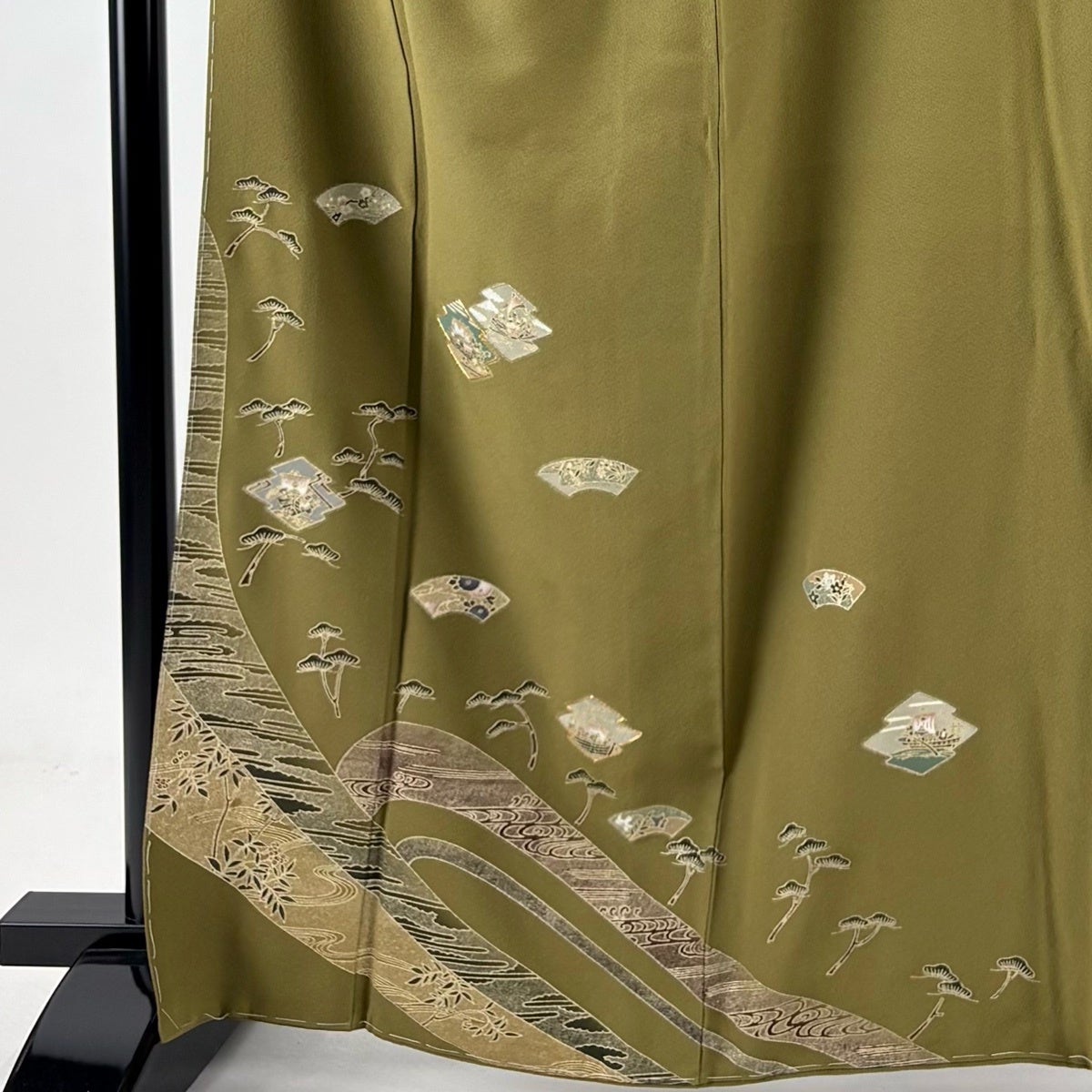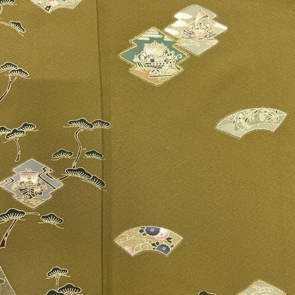 付下げ 身丈154cm 裄丈64cm M 袷 落款あり 扇面 草花 金銀彩 ぼかし 茶緑色 正絹 秀品