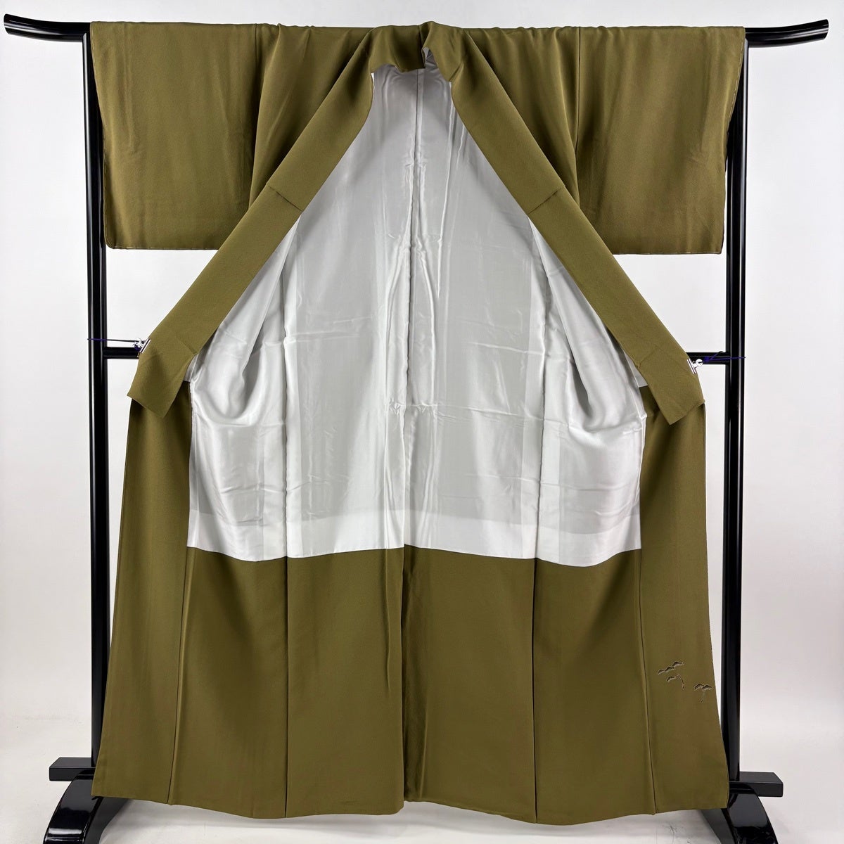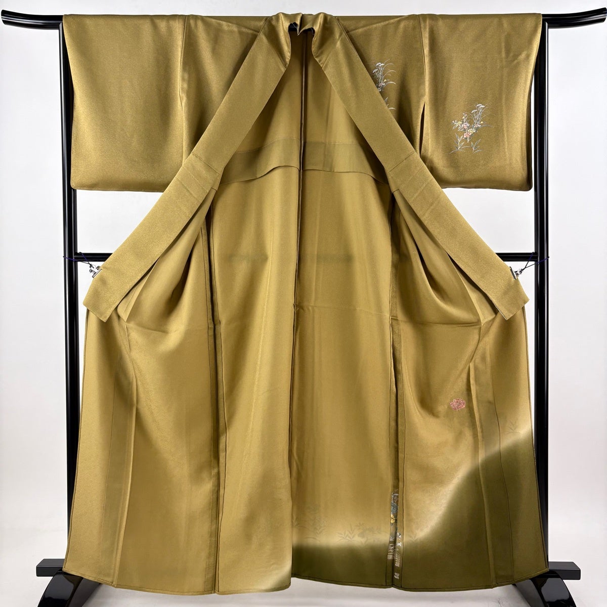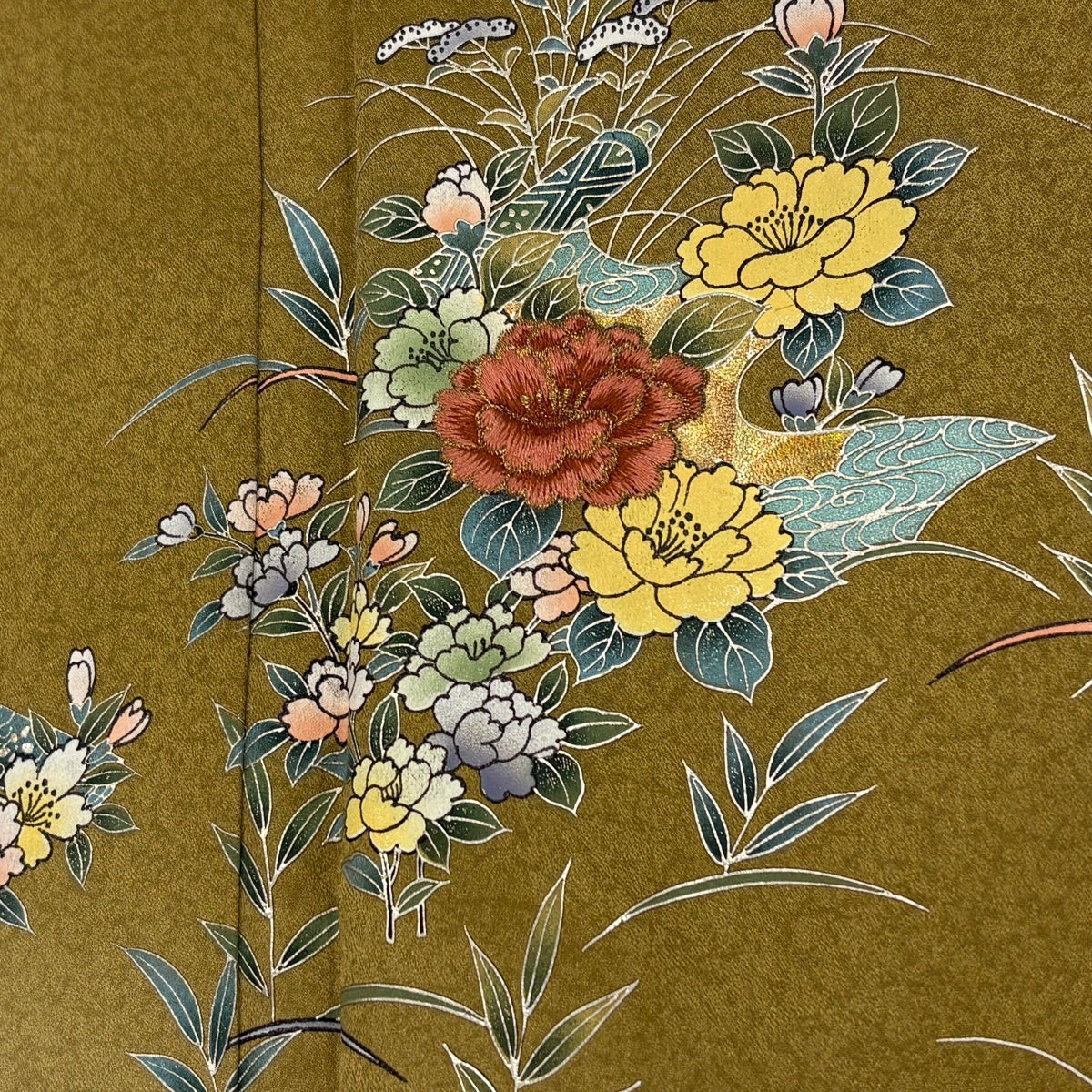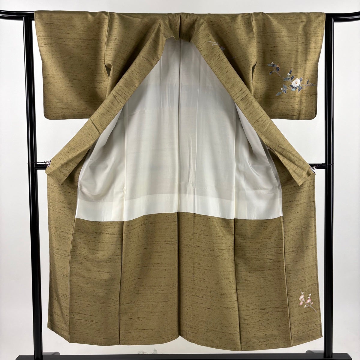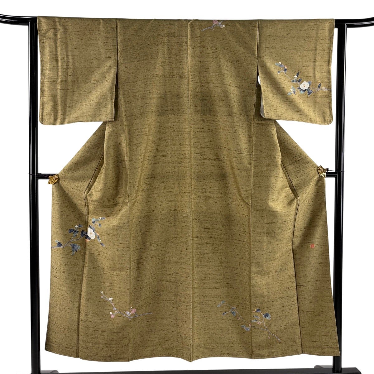 【在庫一掃】 訪問着 身丈158cm 裄丈62cm S 袷 椿 蝶 刺繍 金糸 茶緑色 正絹 逸品