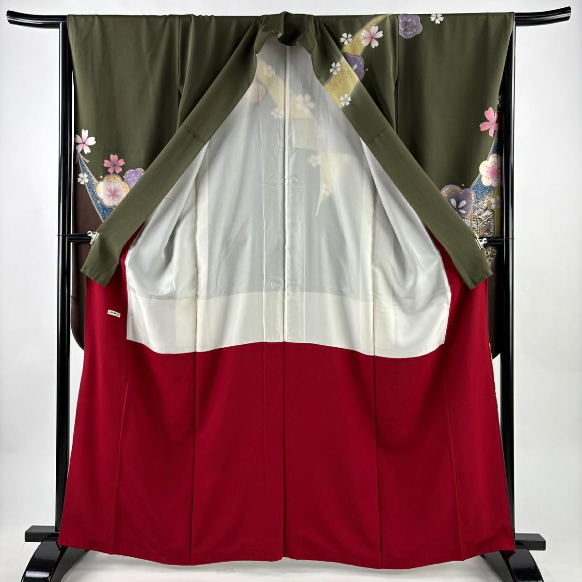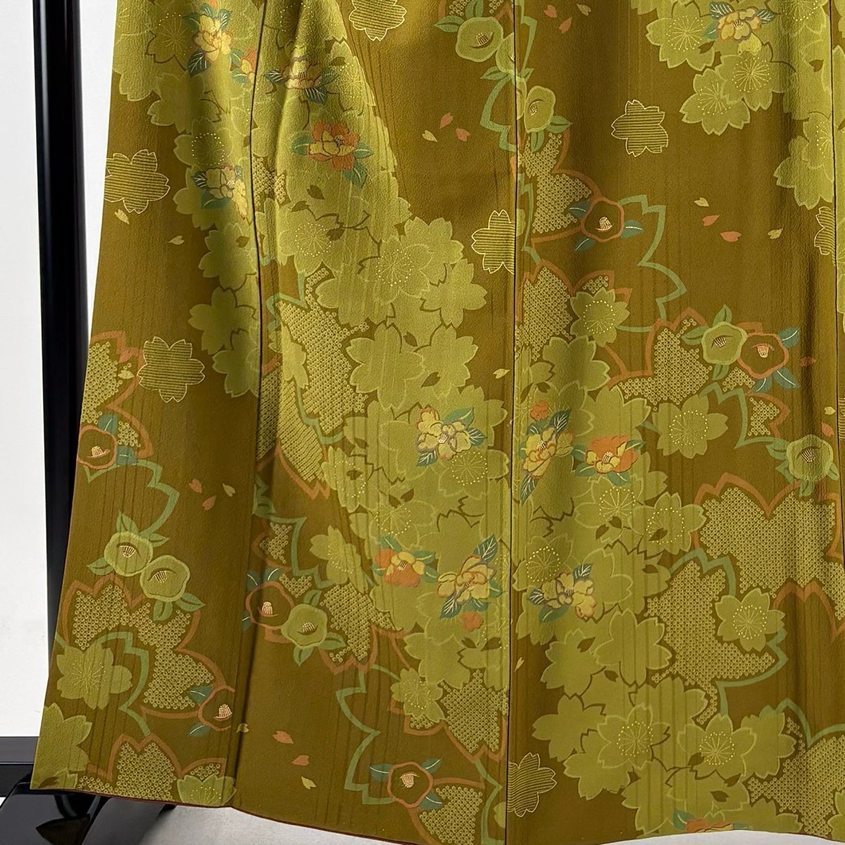 【美品】 振袖 身丈156cm 裄丈66.5cm M 袷 糸巻き 桜 金糸 金彩 茶緑色 正絹 優品