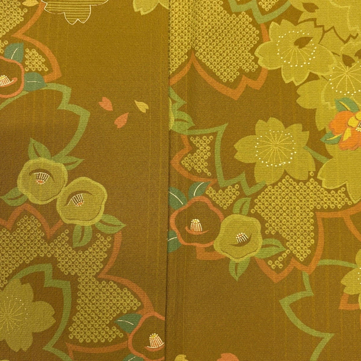 訪問着 身丈163.5cm 裄丈66cm M 袷 幾何学模様 地紋 金彩 ラメ 茶緑色 正絹 優品