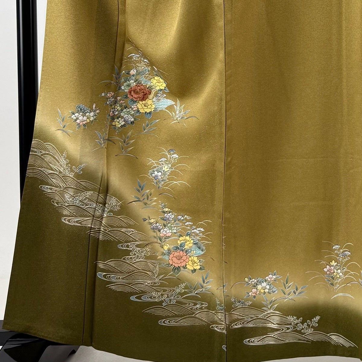 【美品】 付下げ 身丈162cm 裄丈65cm M 単衣 草花 波 金銀彩 刺繍 茶緑色 正絹 秀品