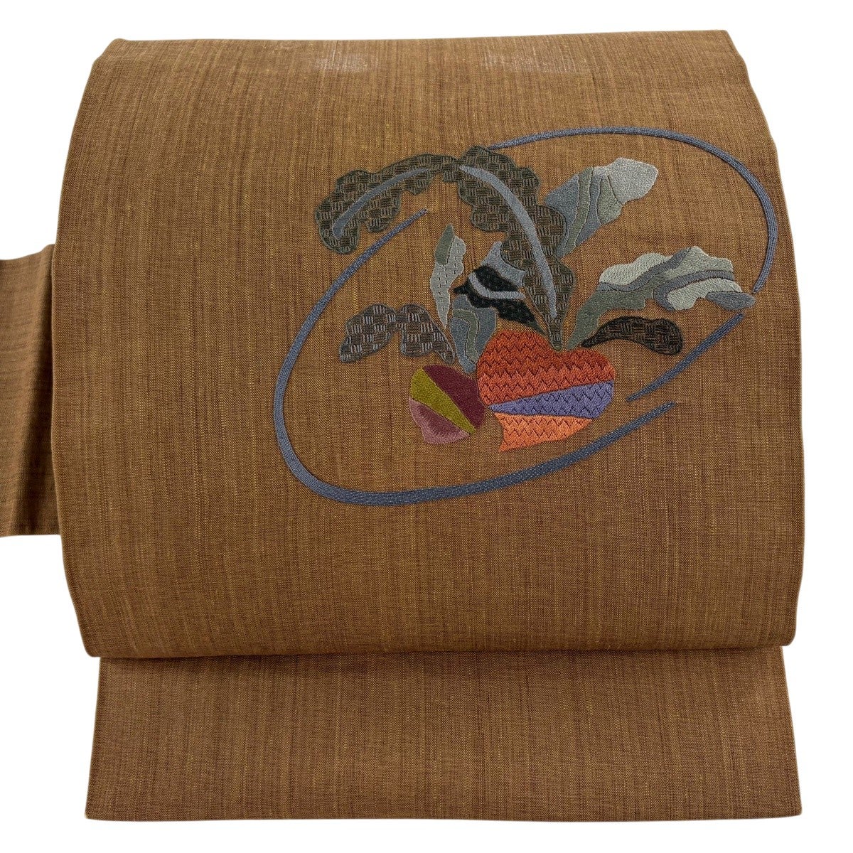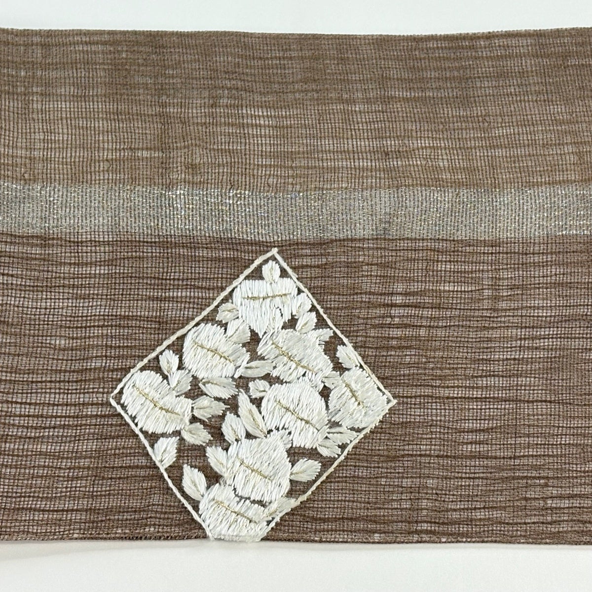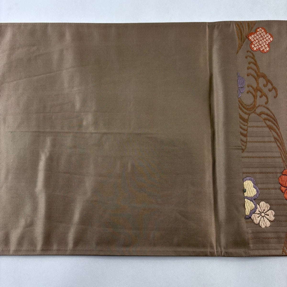【美品】 名古屋帯 秀品 紬地 花 刺繍 茶色 正絹