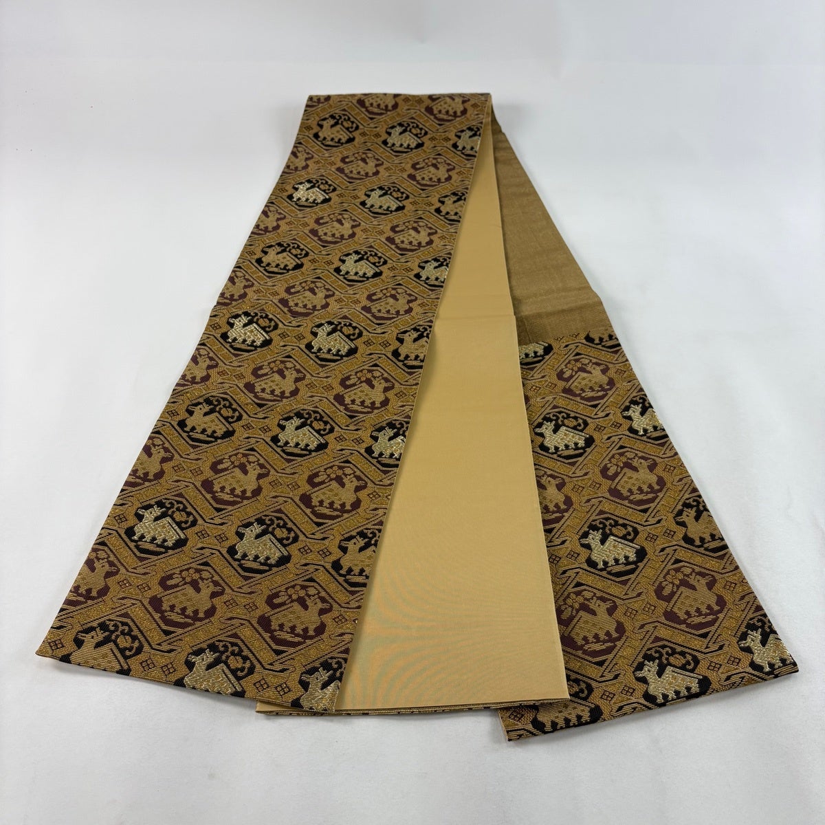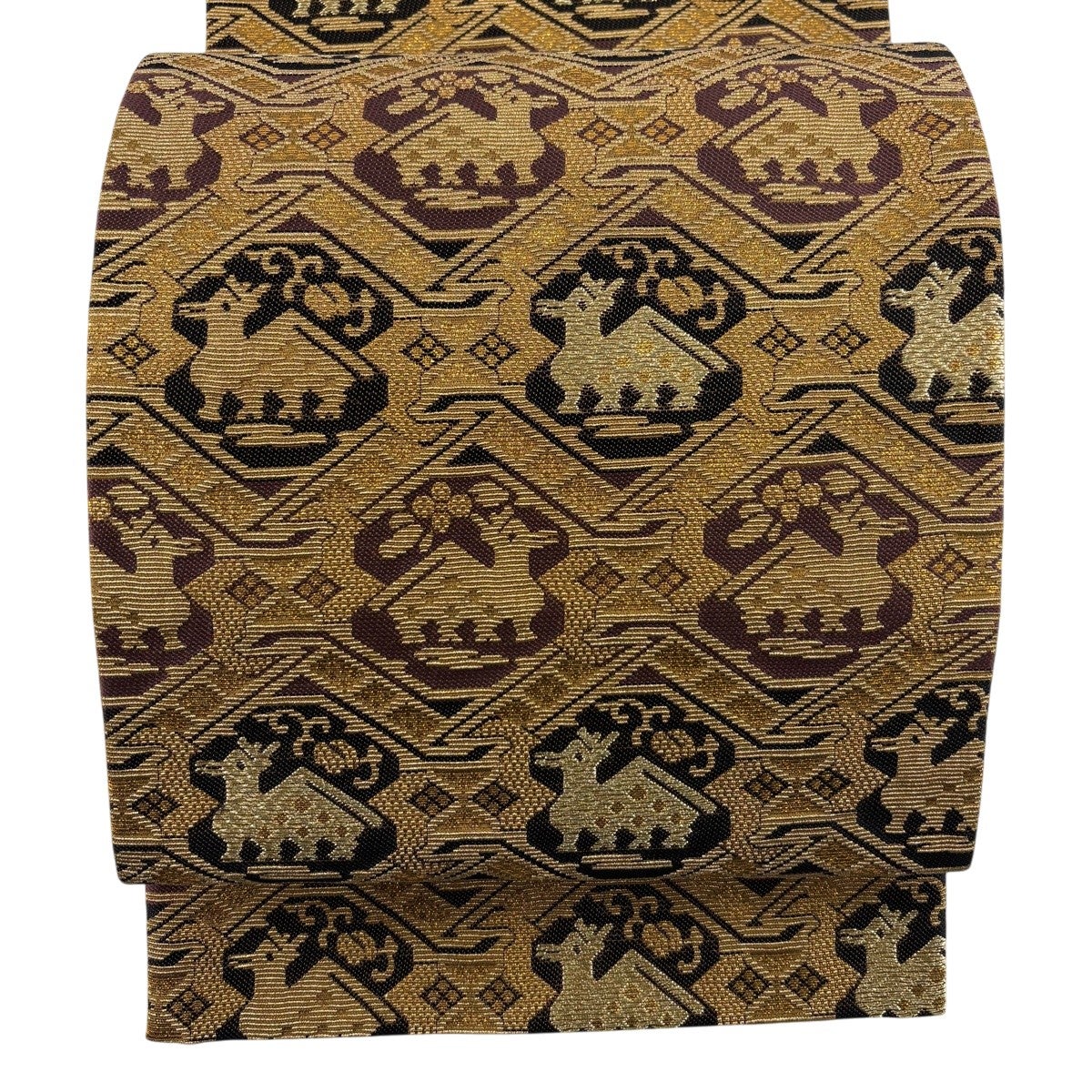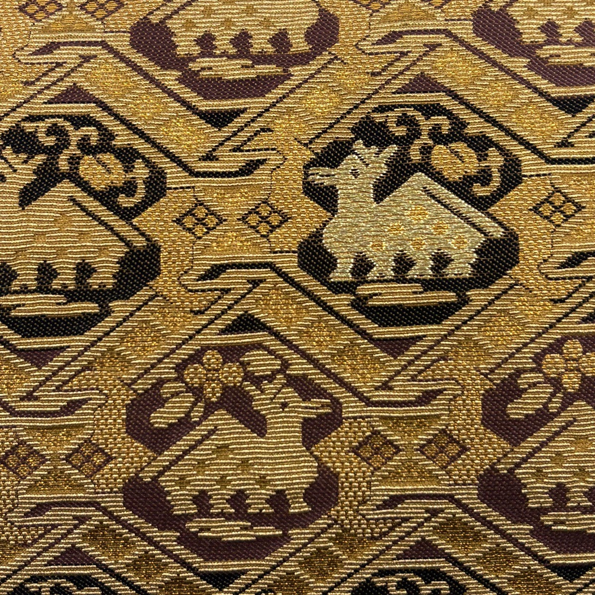 【美品】 袋帯 名品 四神 市松 箔 茶色 全通 正絹