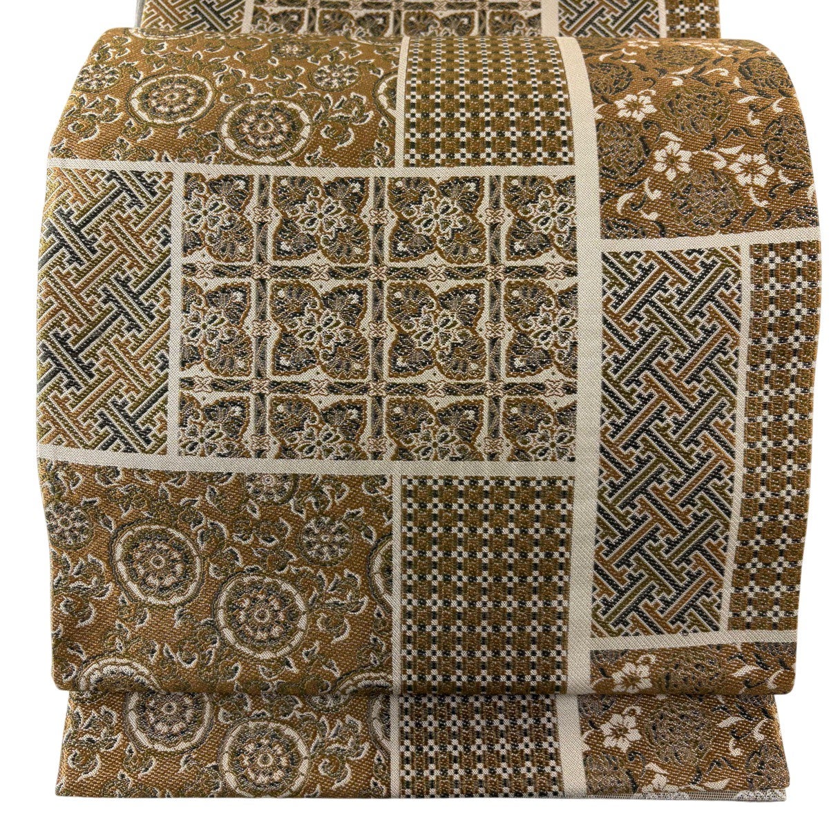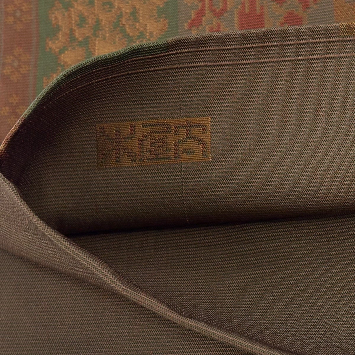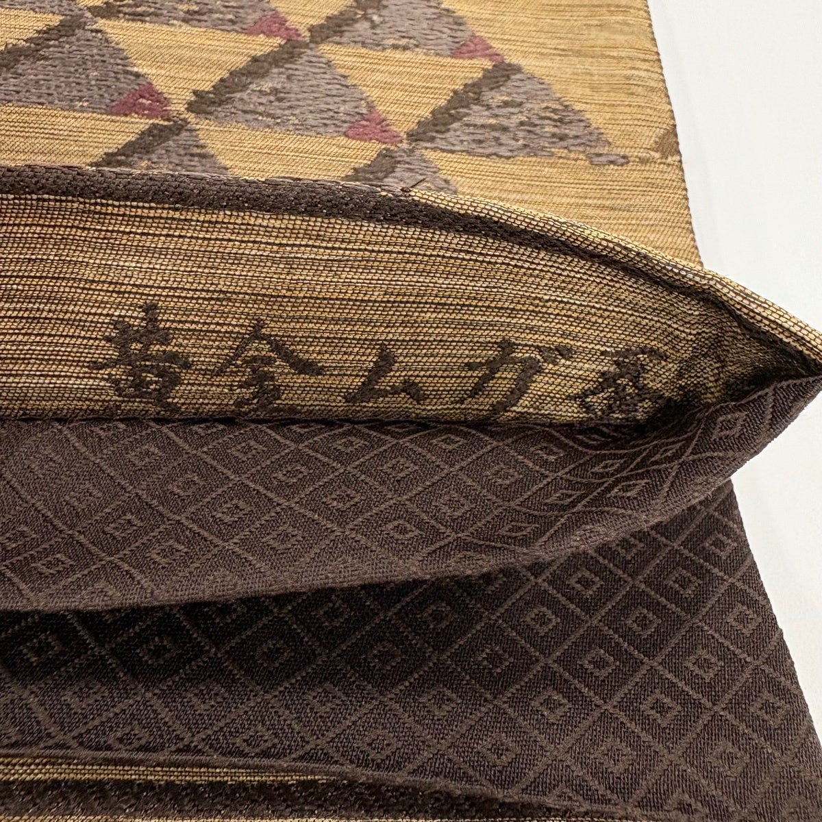 袋帯 秀品 証紙あり 市松 文字紋 茶色 六通 正絹