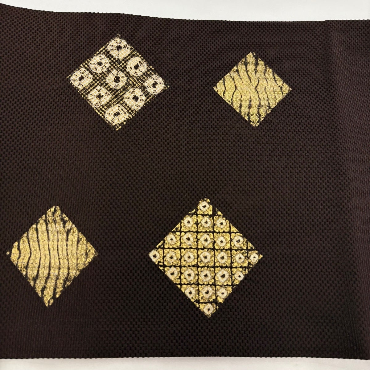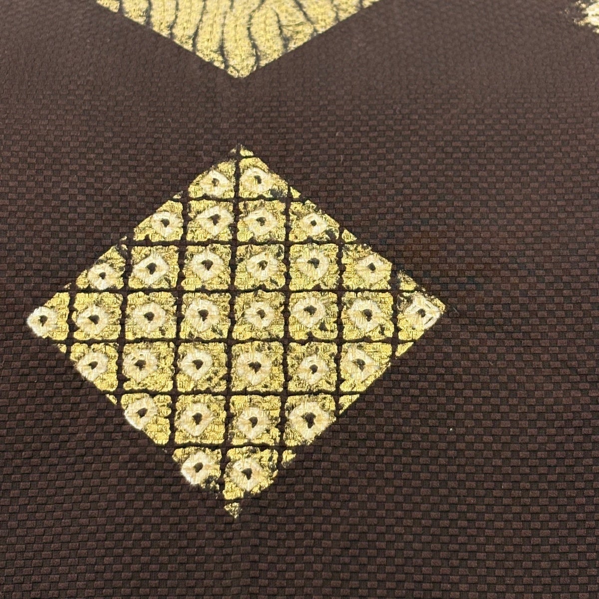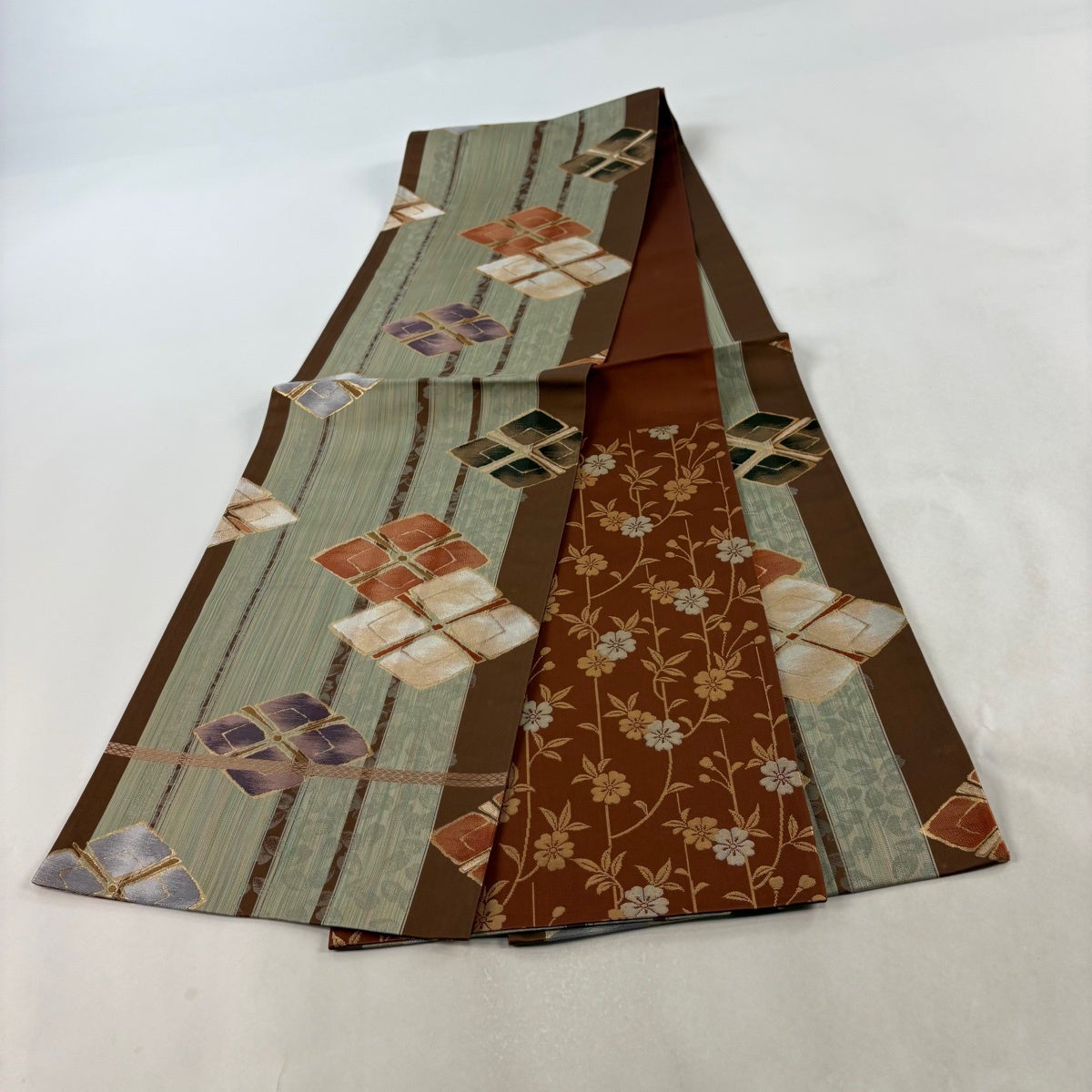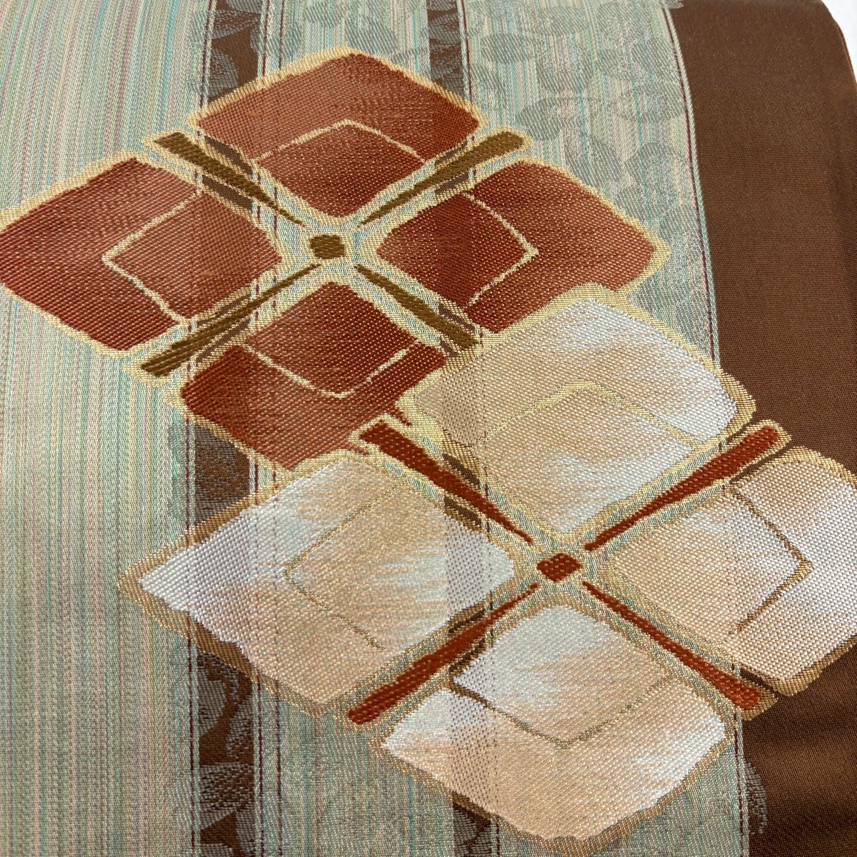 【美品】 開き名古屋帯 秀品 菱 幾何学 金彩 茶色 正絹