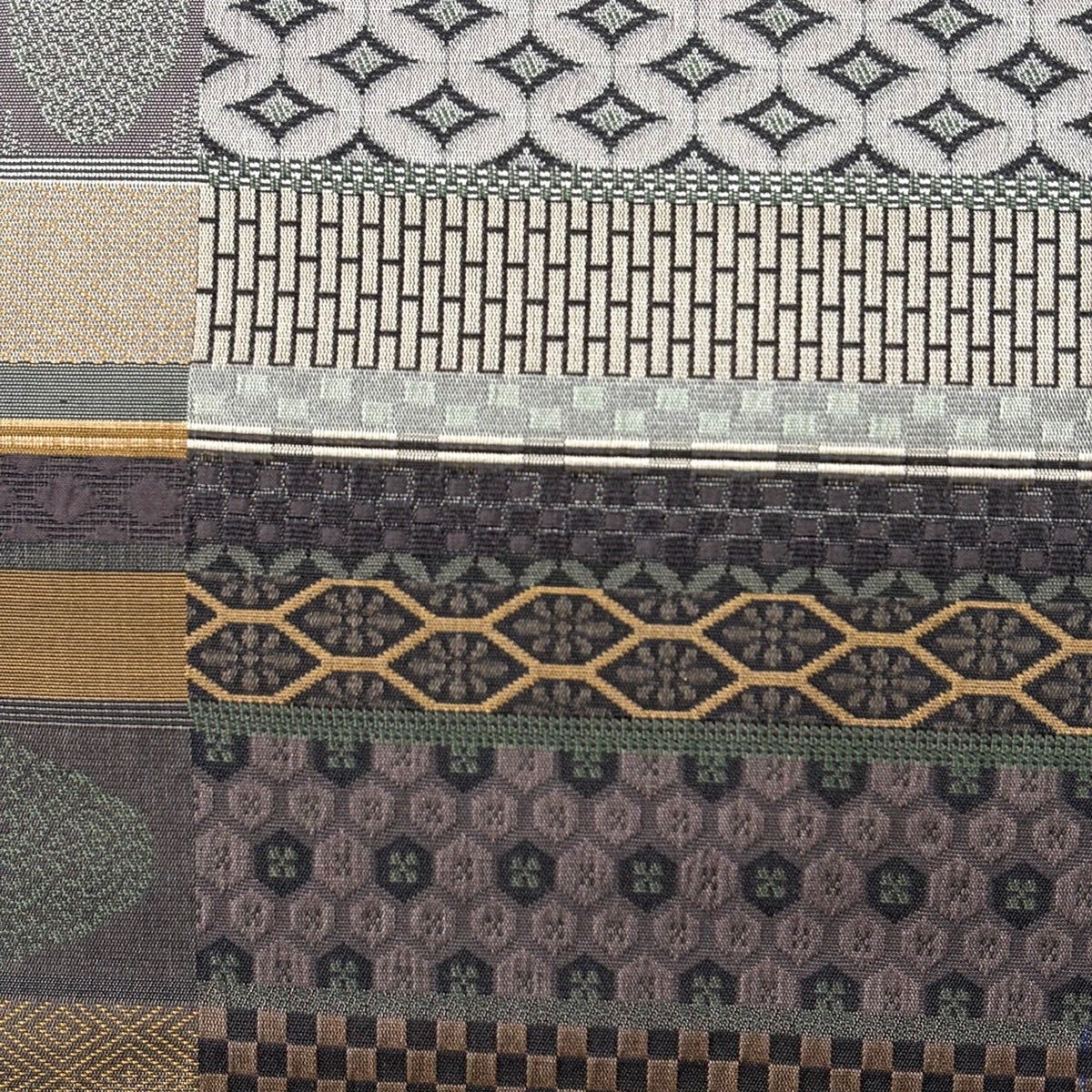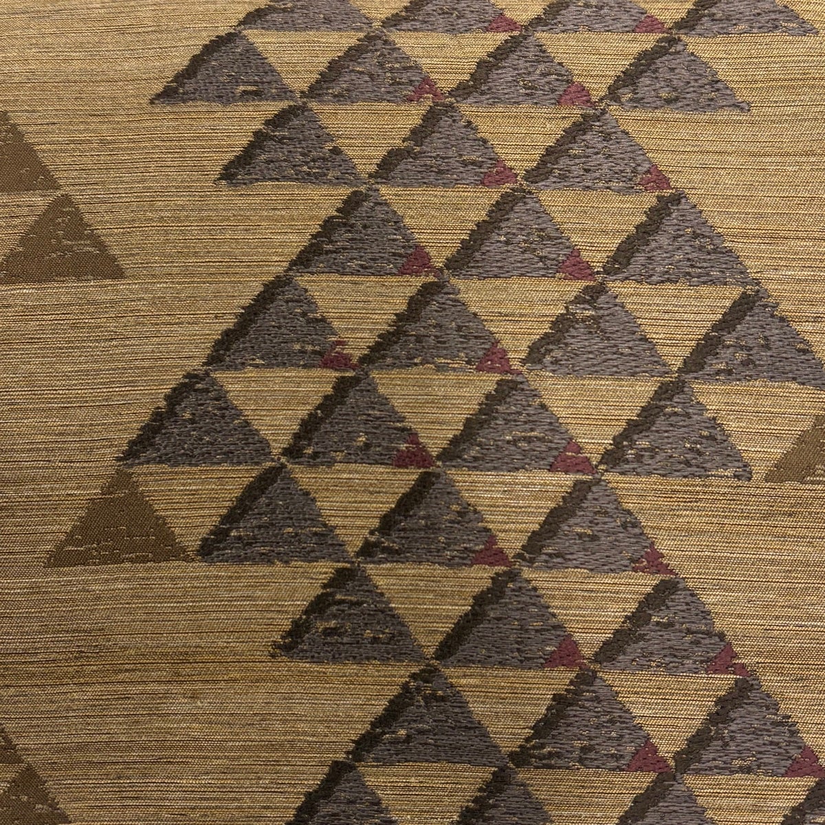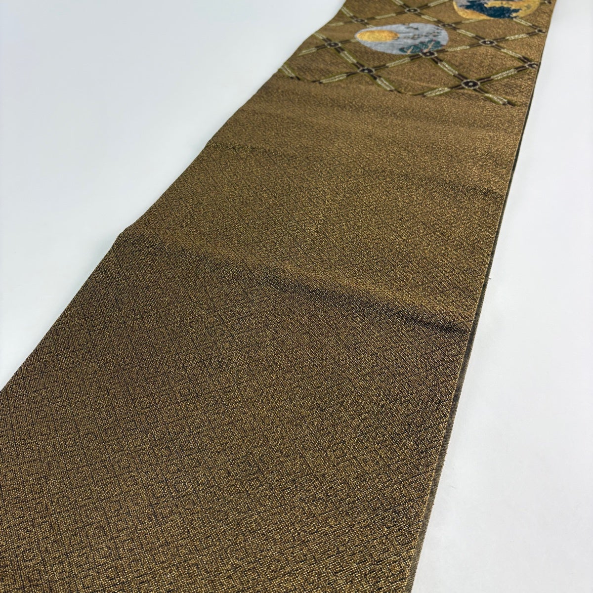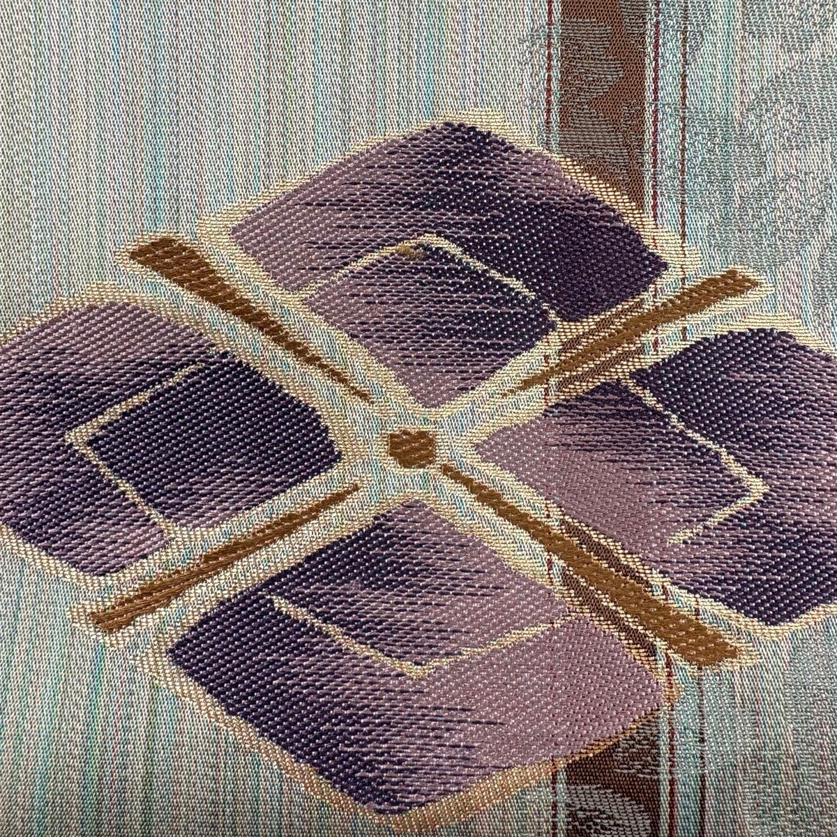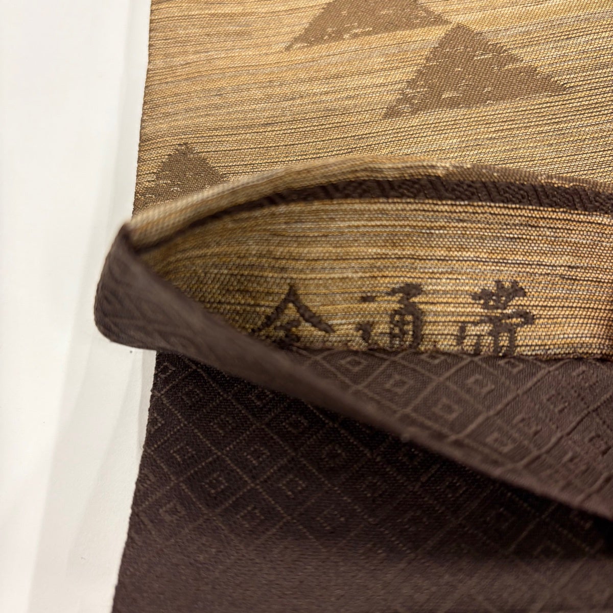 【美品】 開き名古屋帯 秀品 菱 幾何学 金彩 茶色 正絹