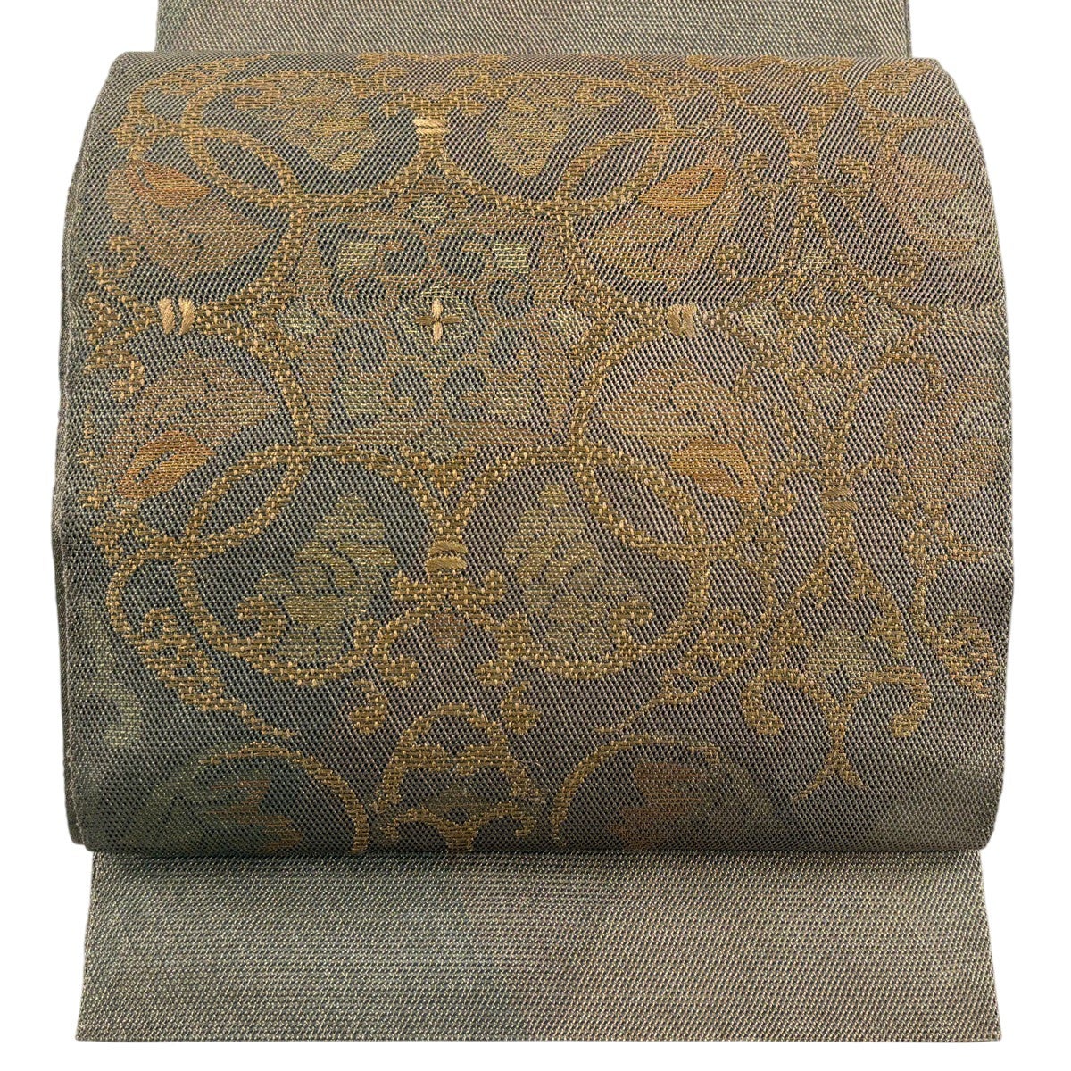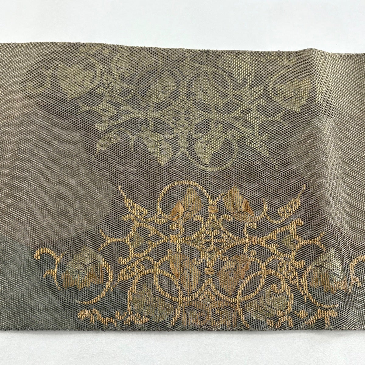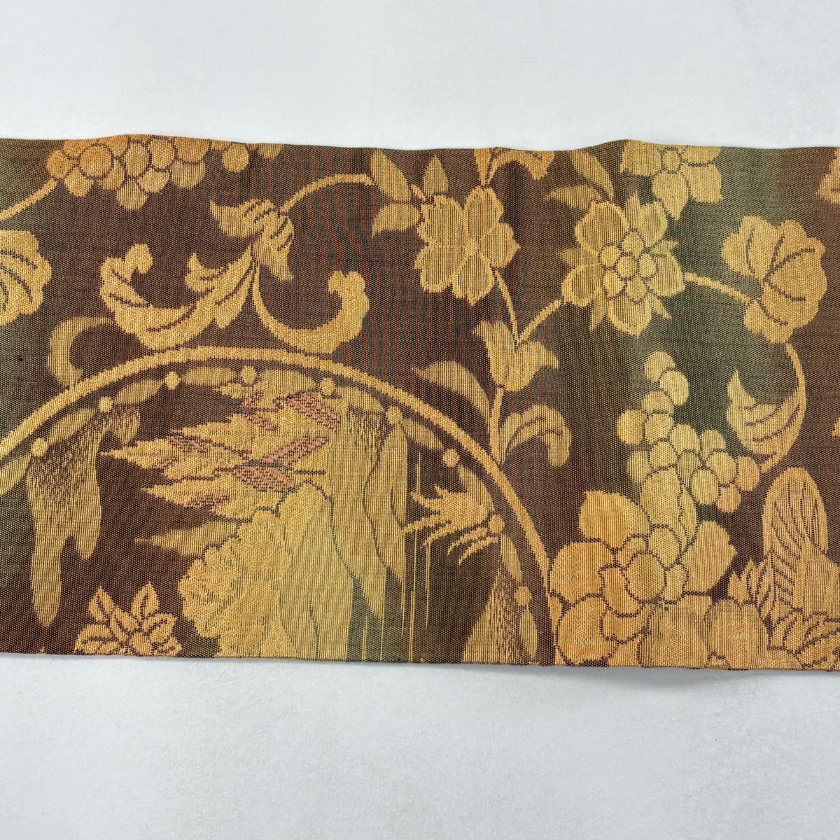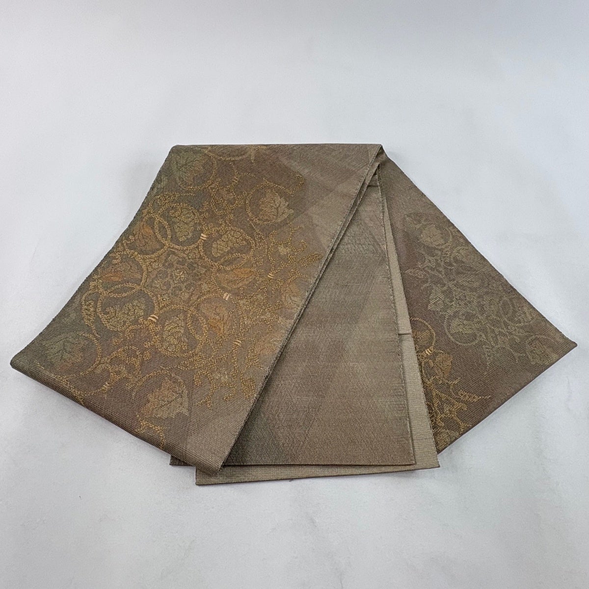 袋帯 秀品 華文 花唐草 金糸 箔 茶色 お太鼓柄 正絹