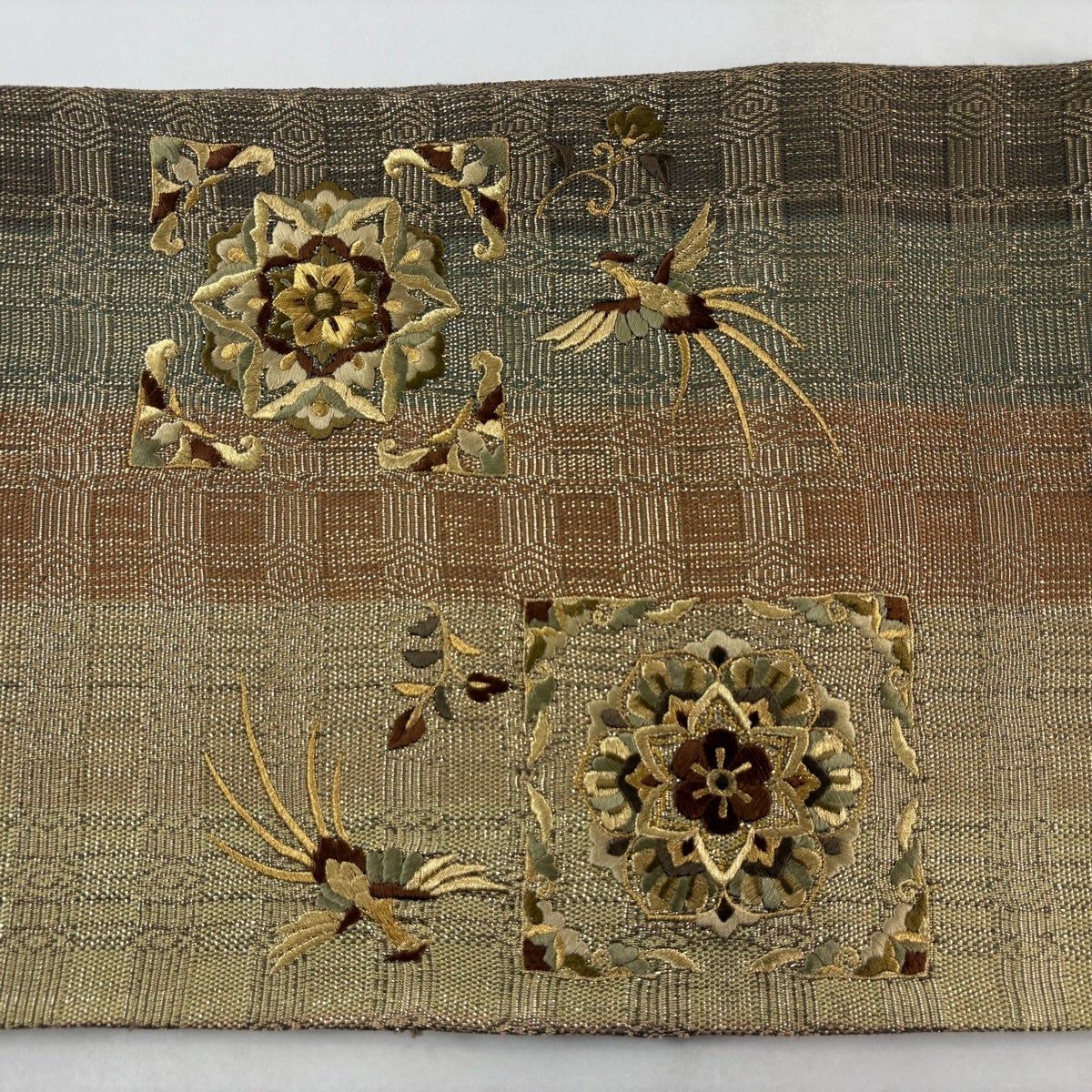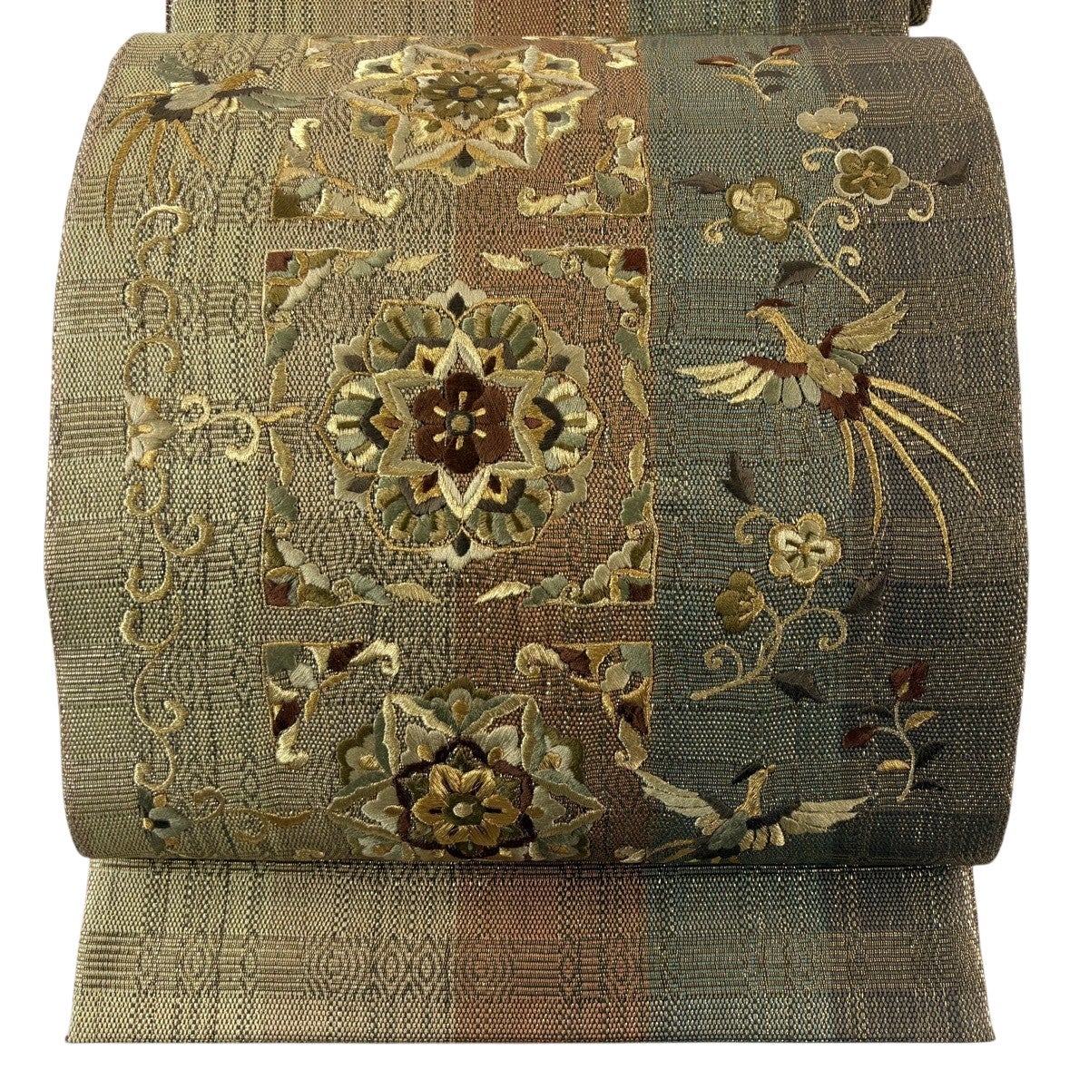 袋帯 名品 鳳凰 華文 刺繍 金糸 茶色 お太鼓柄 正絹